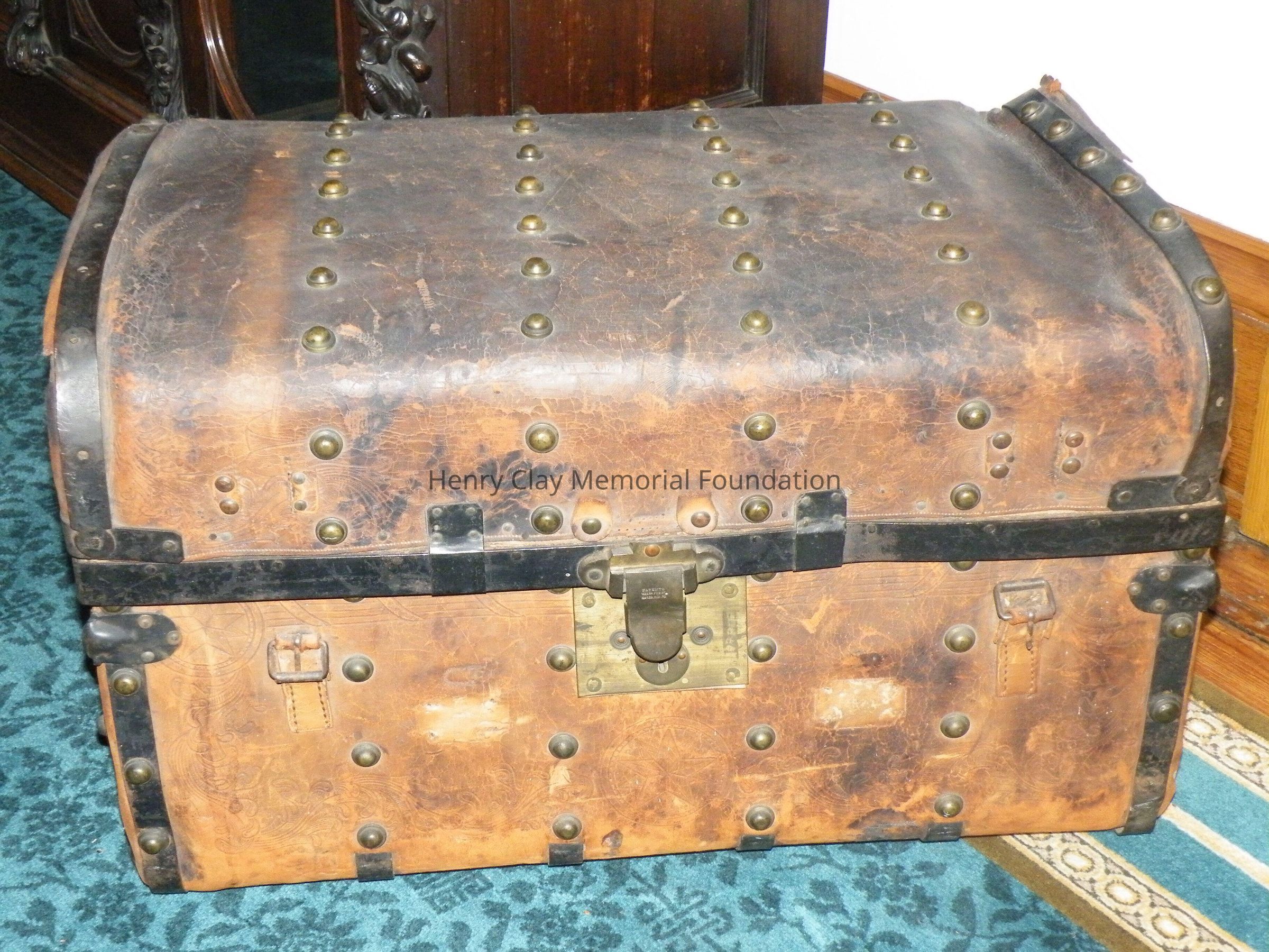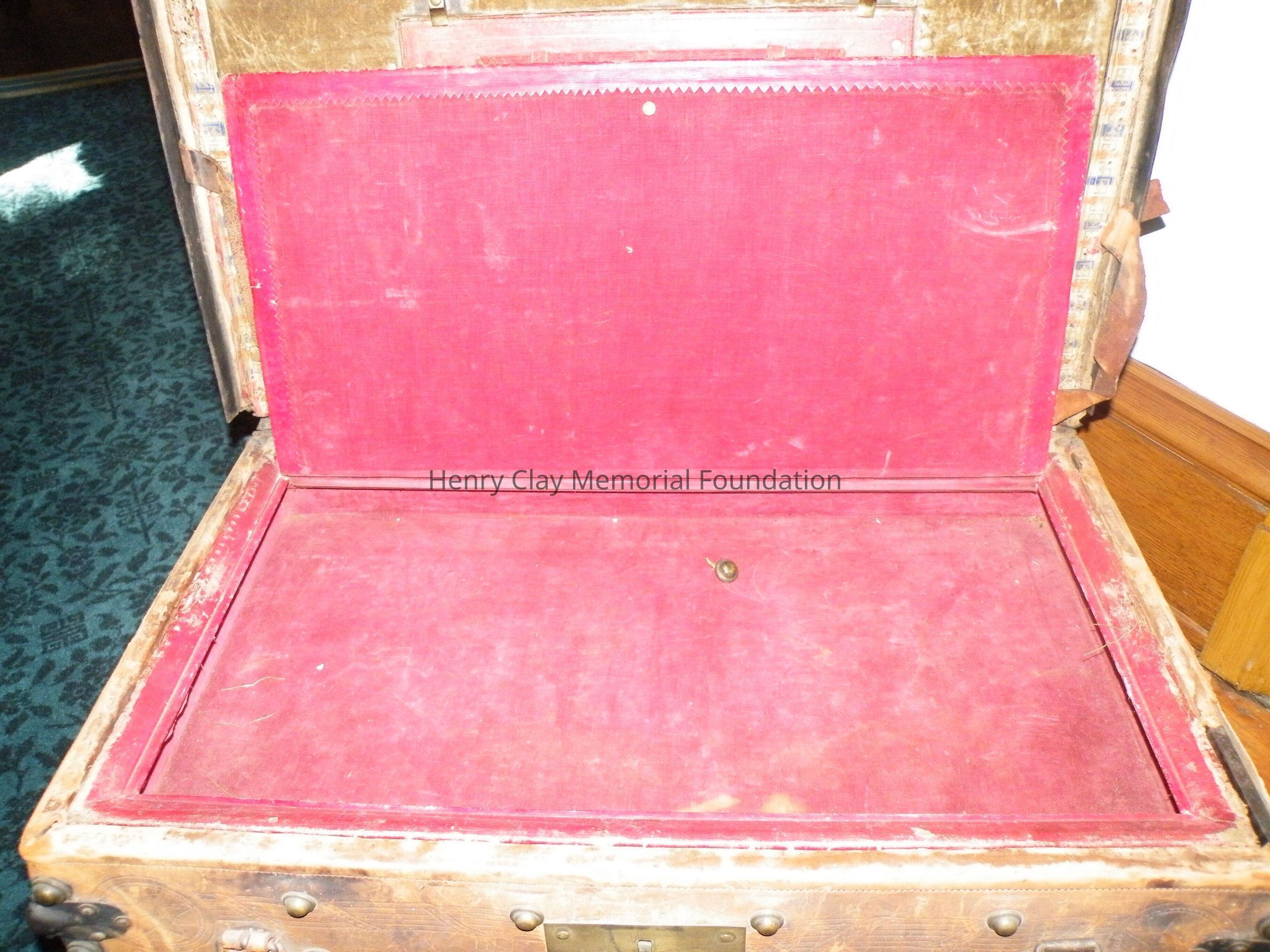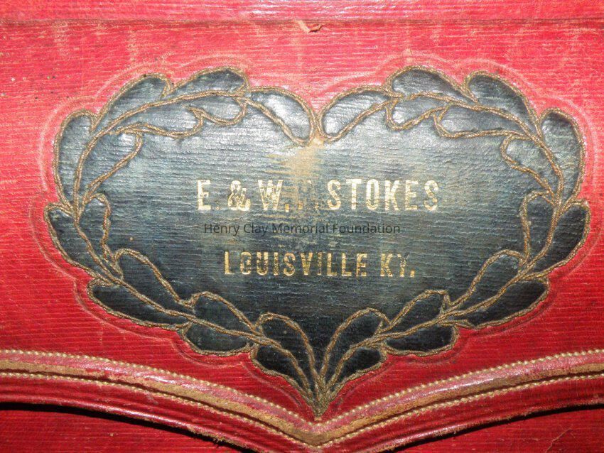 Leather with hinged lid, with gold-embossed maker's mark "E. and W.H. Stokes / Louisville KY." Brass-studded bands around trunk and tooled with eagles and other designs in leather. Inside is lined with red and green velvet. Red lyre decorations and eagles on pocket on inside lid. Inner tray sits above main storage compartment. The tooled designs on the outside include Henry Clay, Lady Justice, Lady Liberty, a plow and a beehive.Dimensions