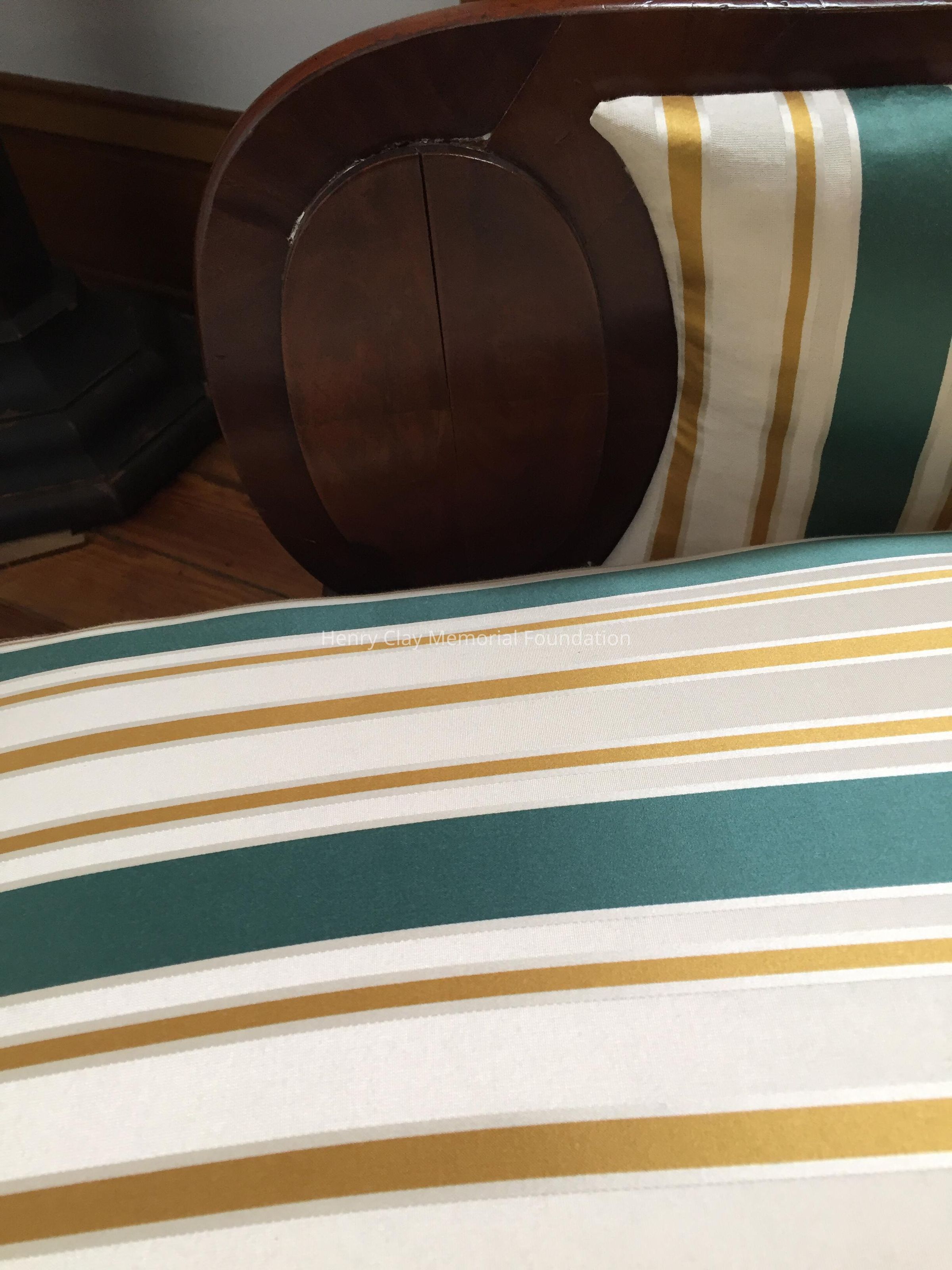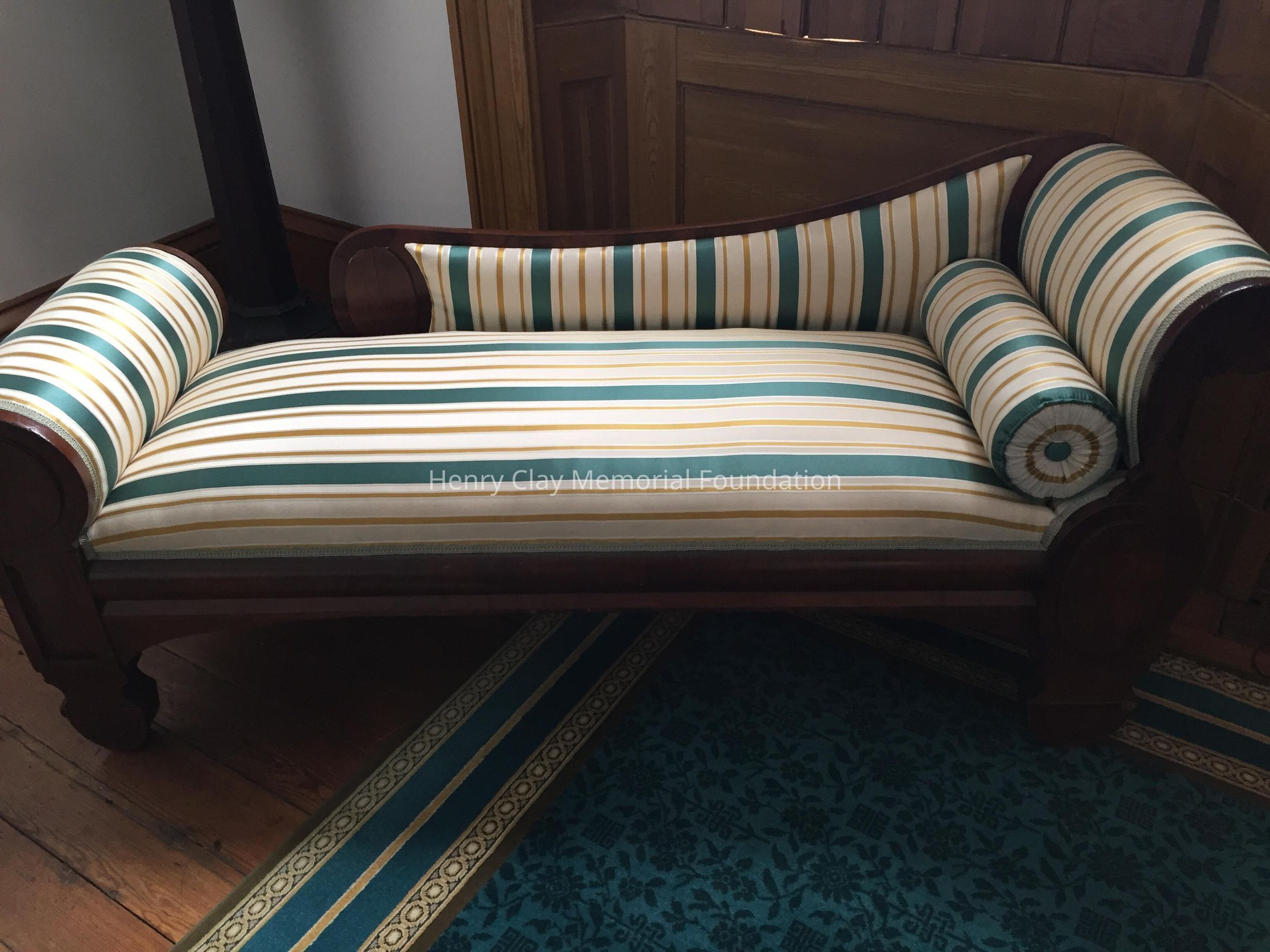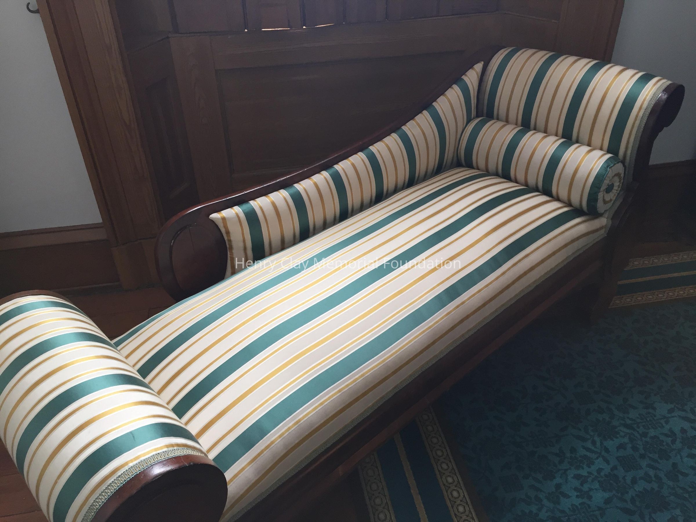 Mahogany, Empire style with recamier back, scroll end with roll foot and shaped apron. Upholstered in green, yellow, and cream striped fabric.