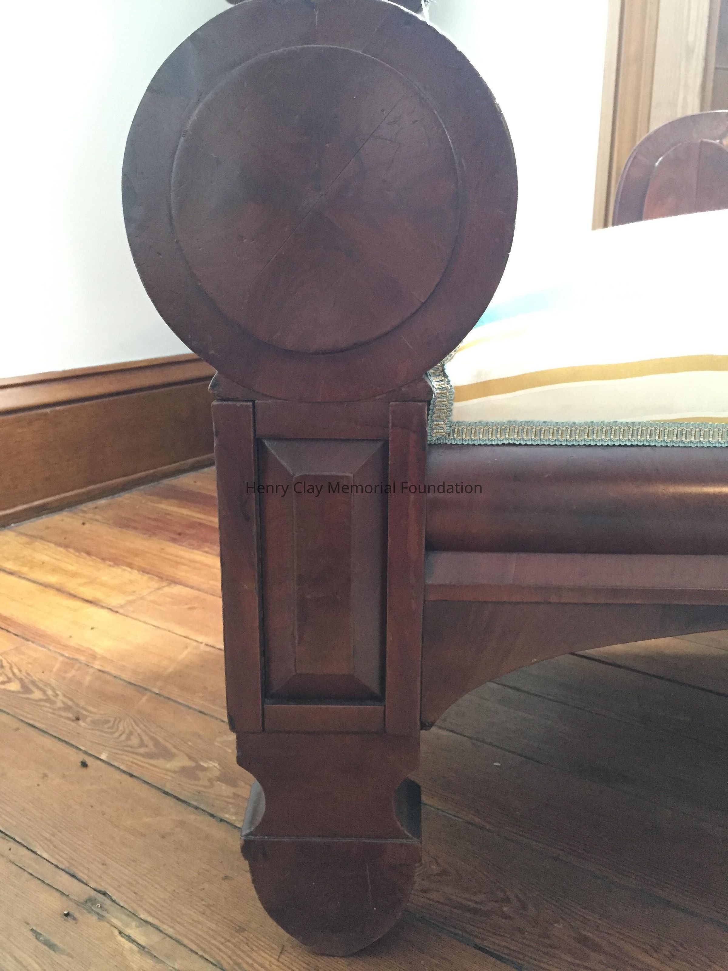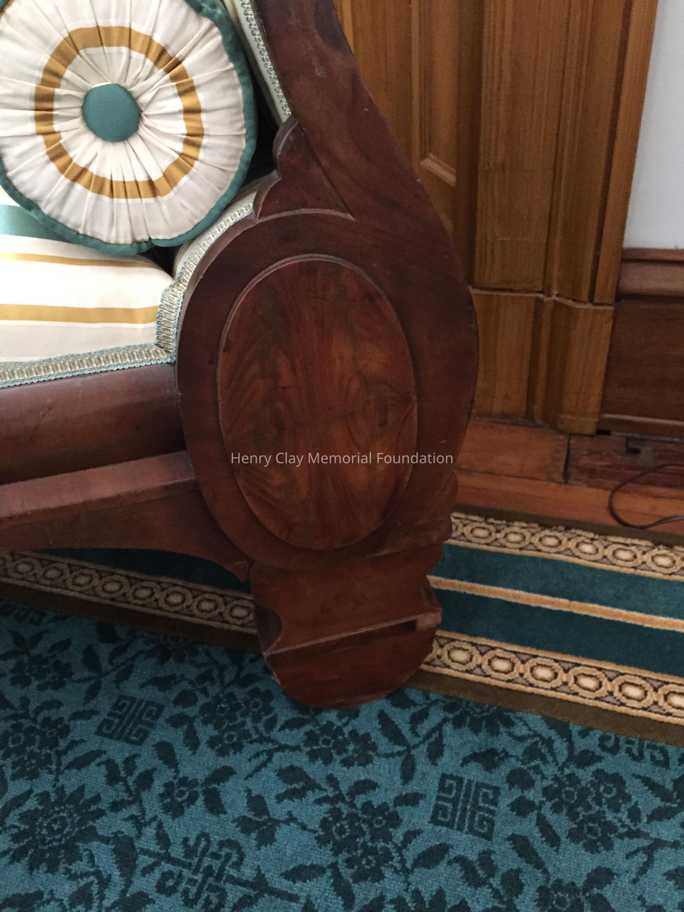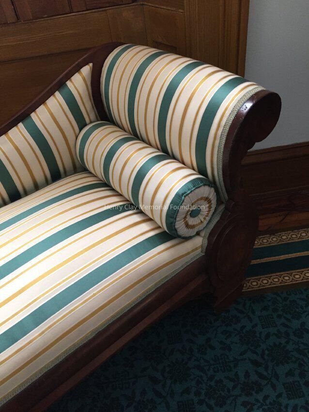 Mahogany, Empire style with recamier back, scroll end with roll foot and shaped apron. Upholstered in green, yellow, and cream striped fabric.