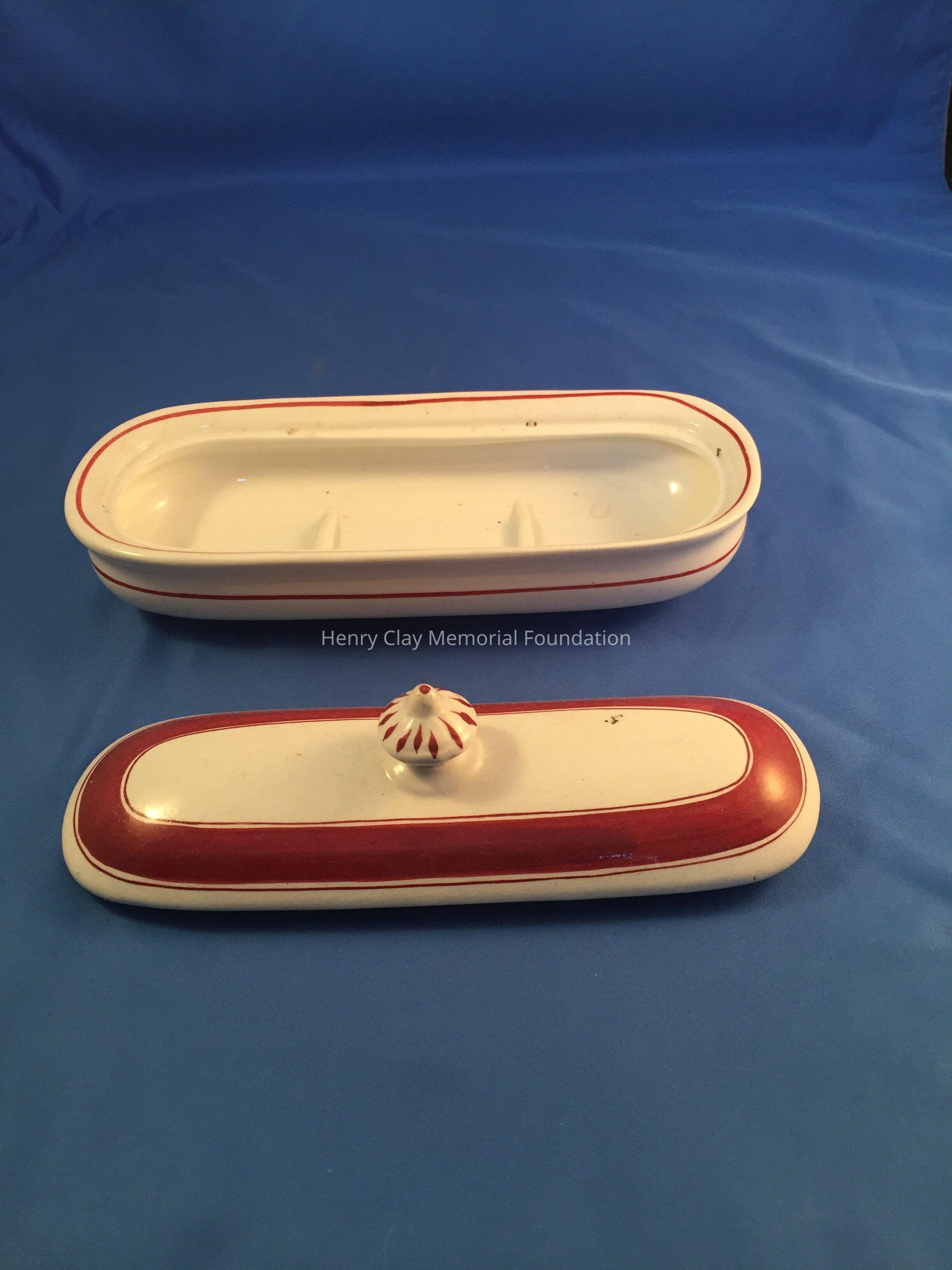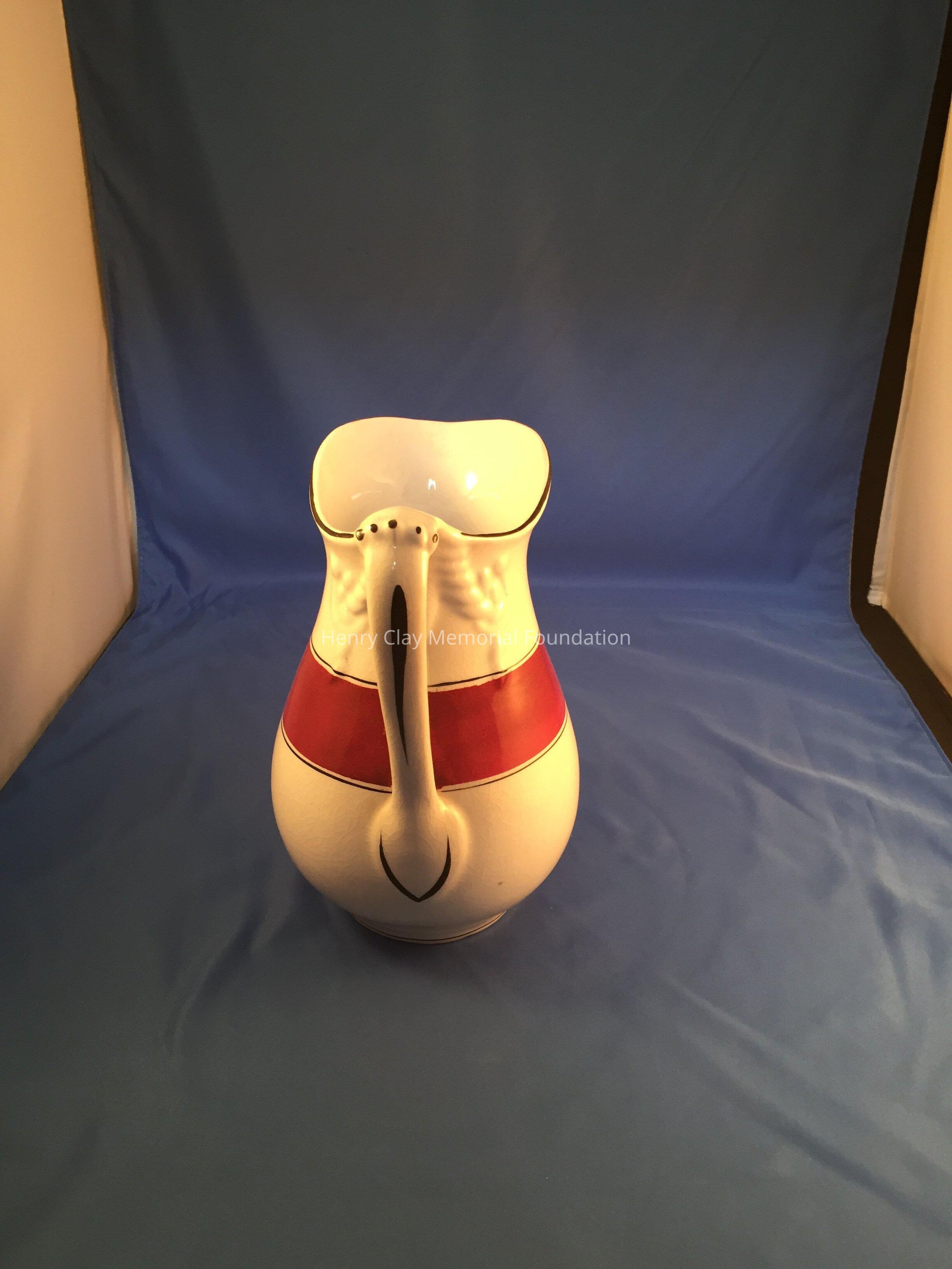 4 matching Ironstone pieces, white with red stripes. Set includes: (a) pitcher, (b) bowl, (c) small pitcher, (d) soap dish. No mark on bottom, red band with thin red bands above and below.Dimensions