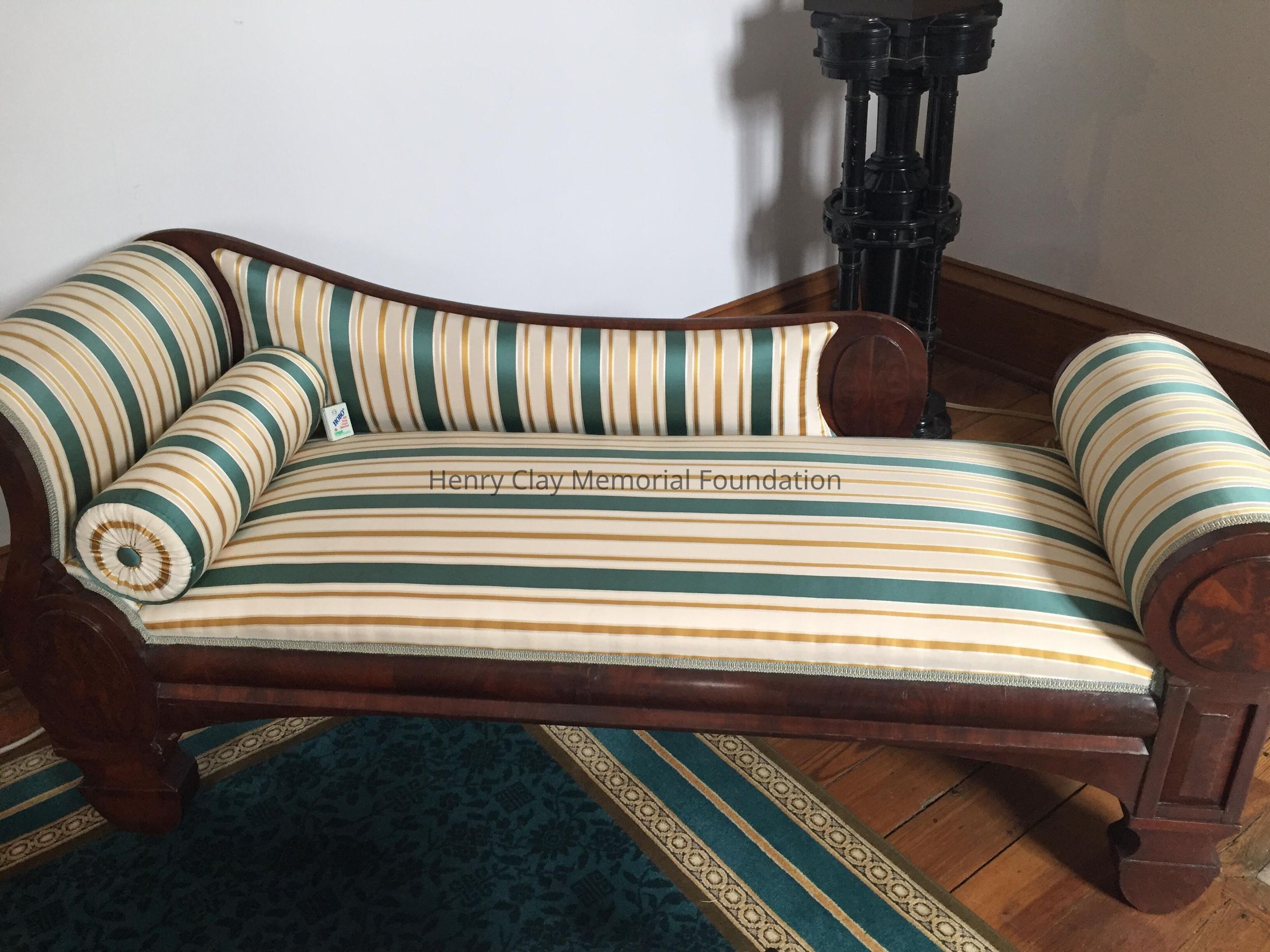 Mahogany, Empire style with recamier back, scroll end with roll foot and shaped apron. Upholstered in yellow, green, and cream striped fabric.Dimensions