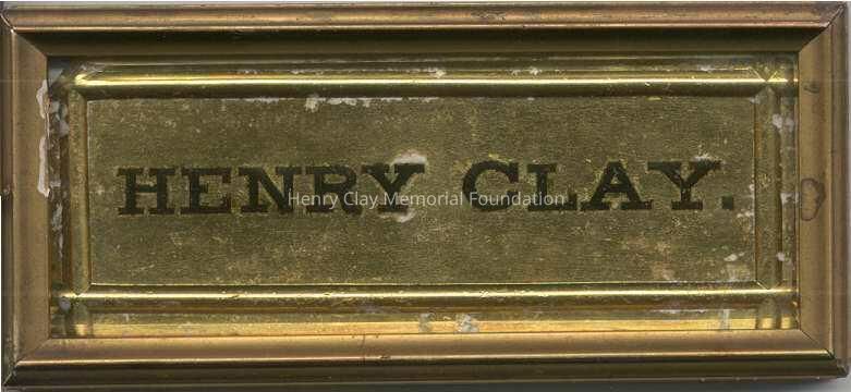 Gilded glass nameplate inscribed "Henry Clay" in black letters. Framed in plain, gilded frame.