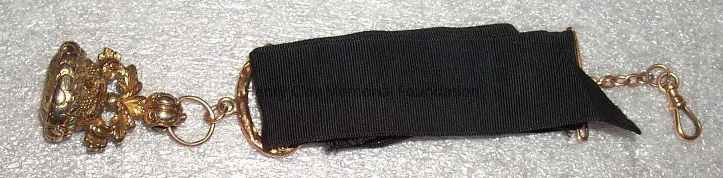 Watch fob with black silk ribbon. Fob is gold and done in a floral motif. Fob has quartz crystal mounted at bottom.