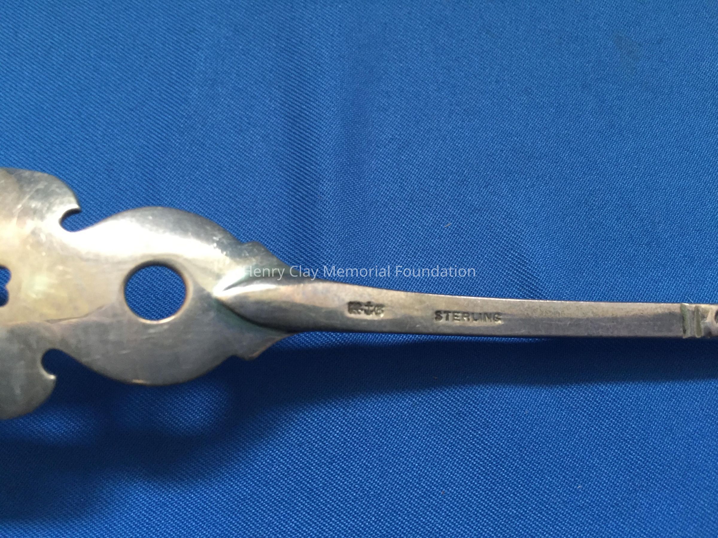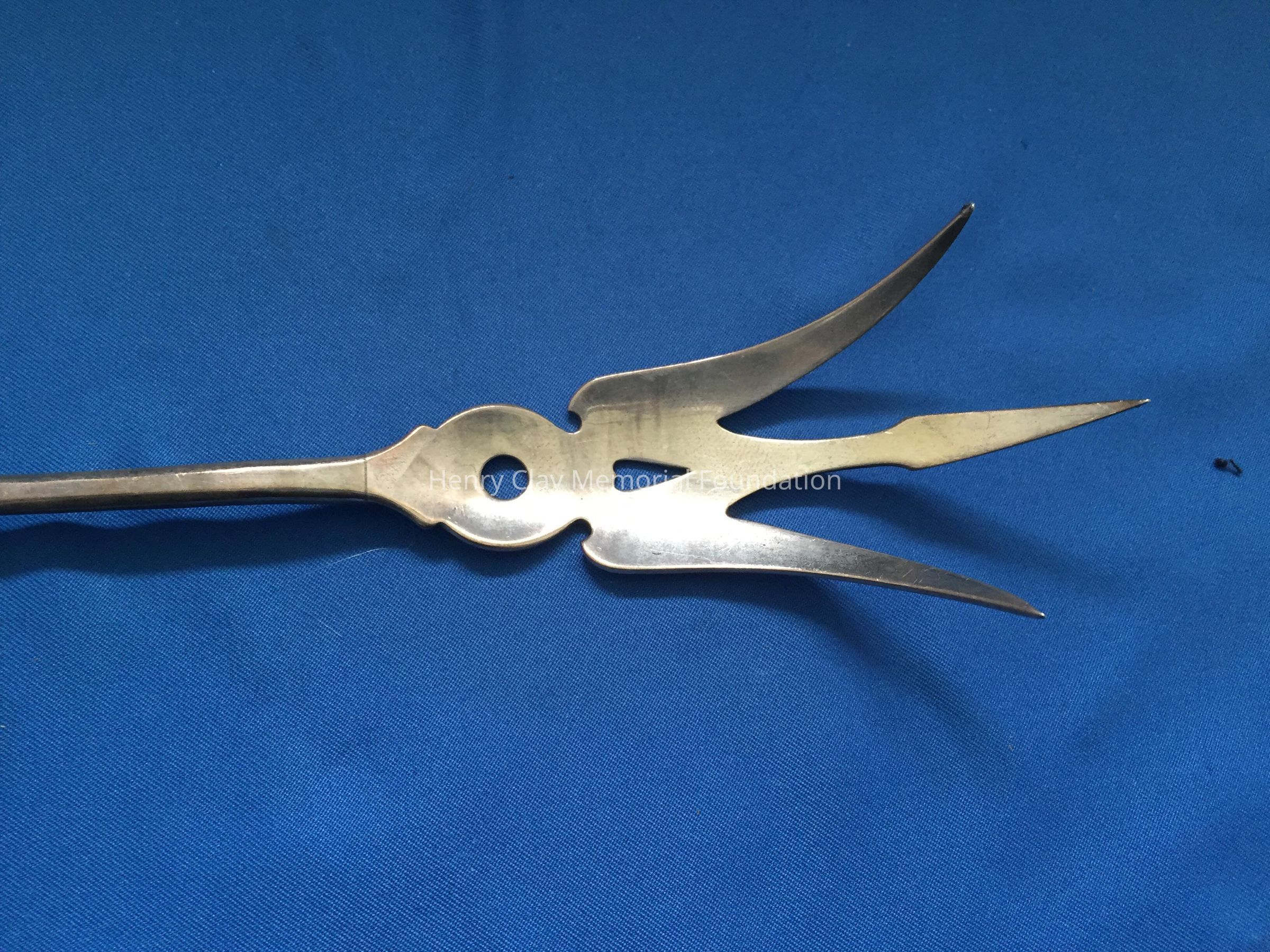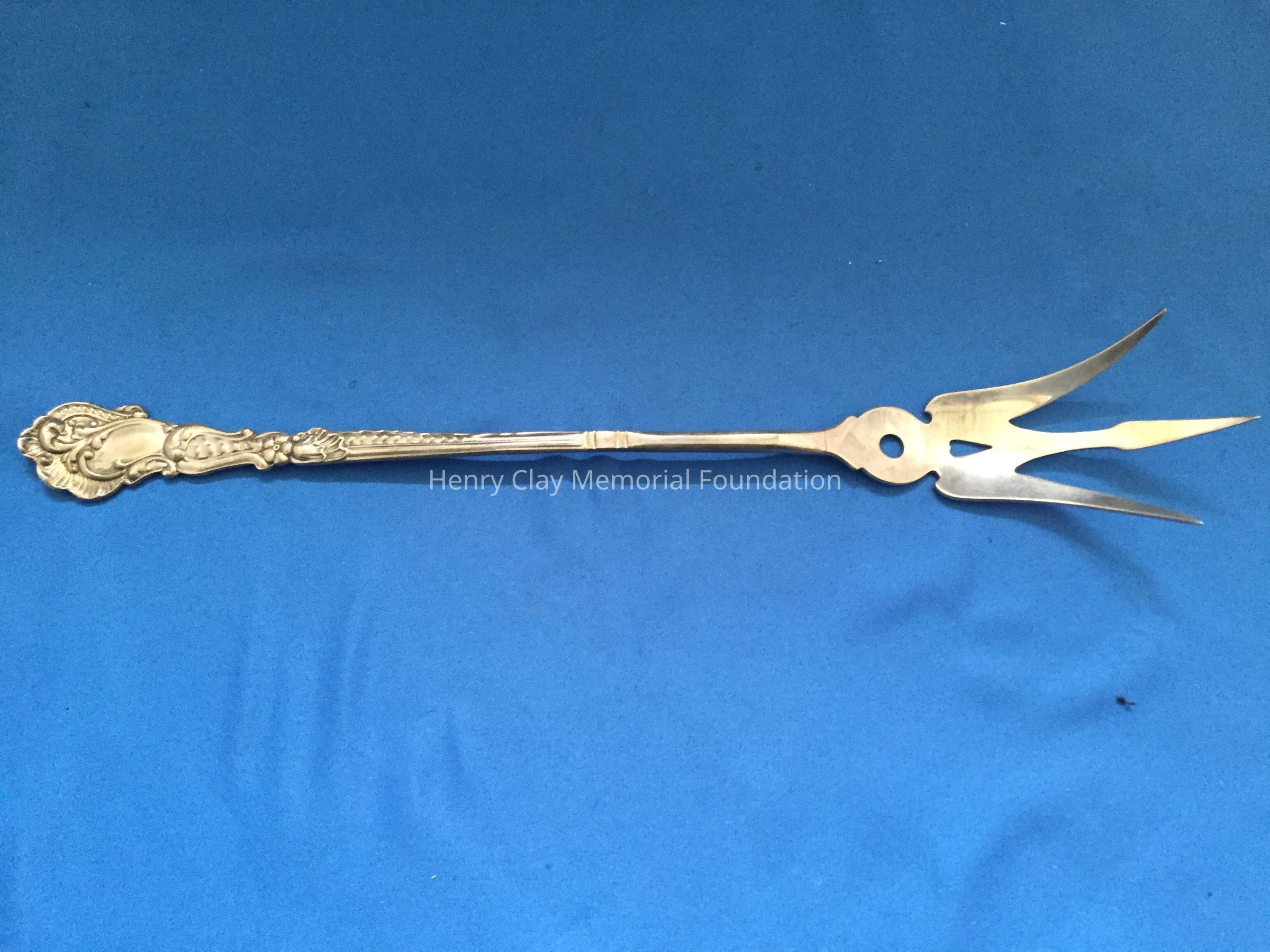 Long, 3-pronged fork with tines bent slightly upward from the pierced bowl. Hallmarks on back of handle.