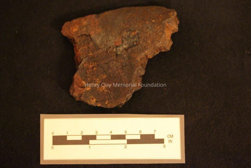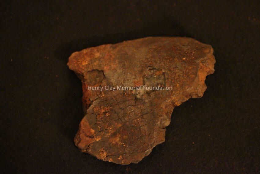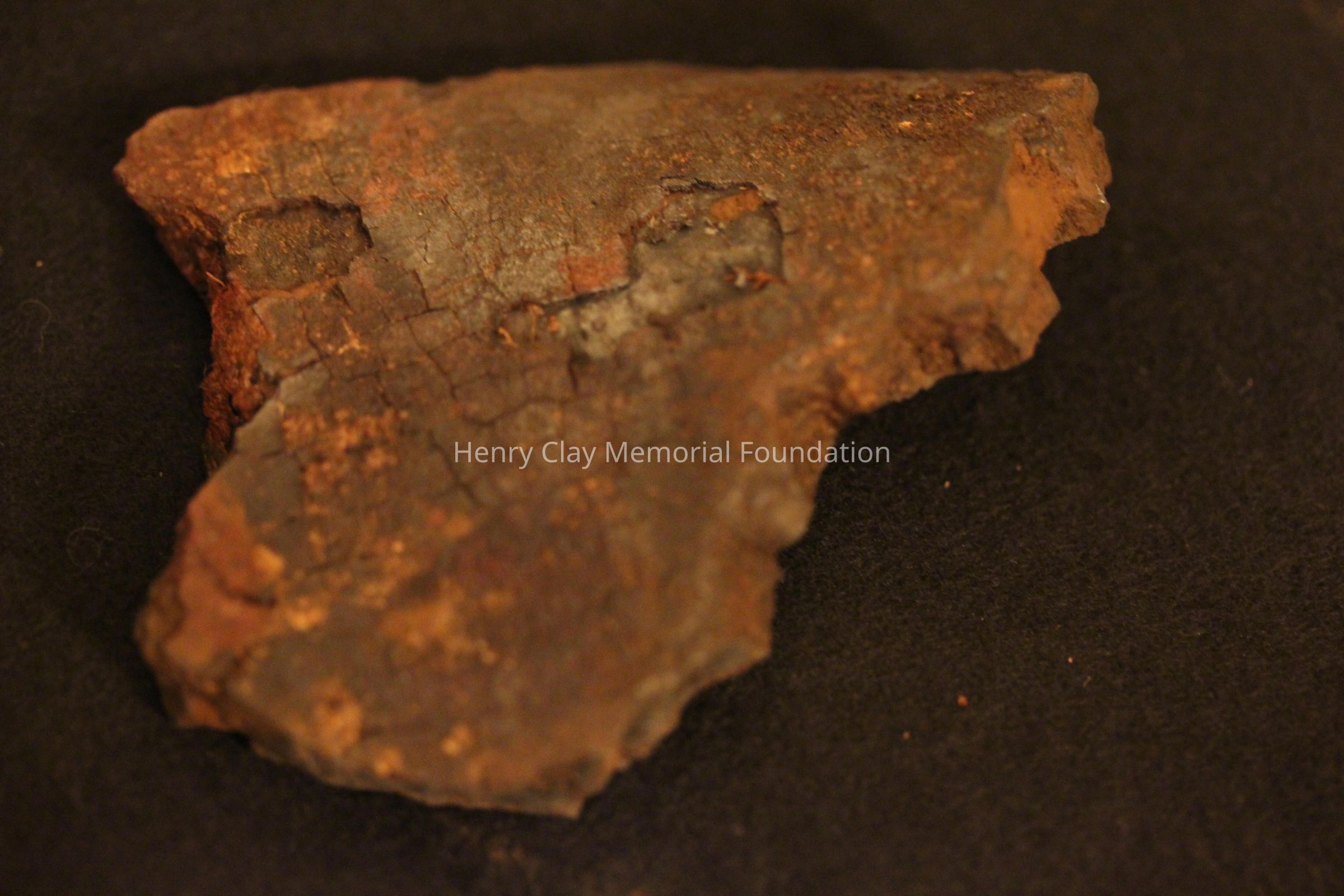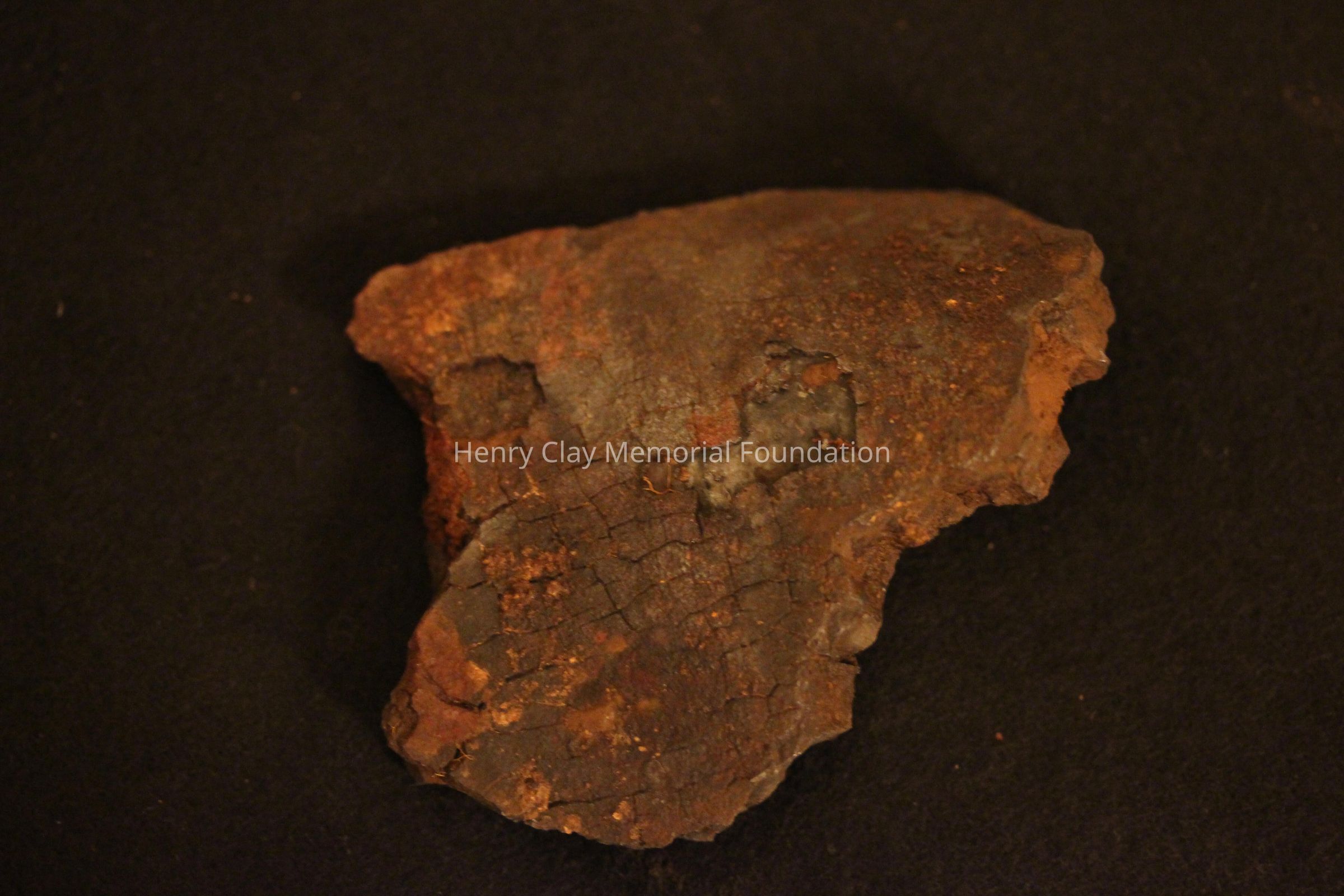 Heavy Cannon Ball fragment, Rusted on the broken fragmented ends, small circular indent on concaved side,