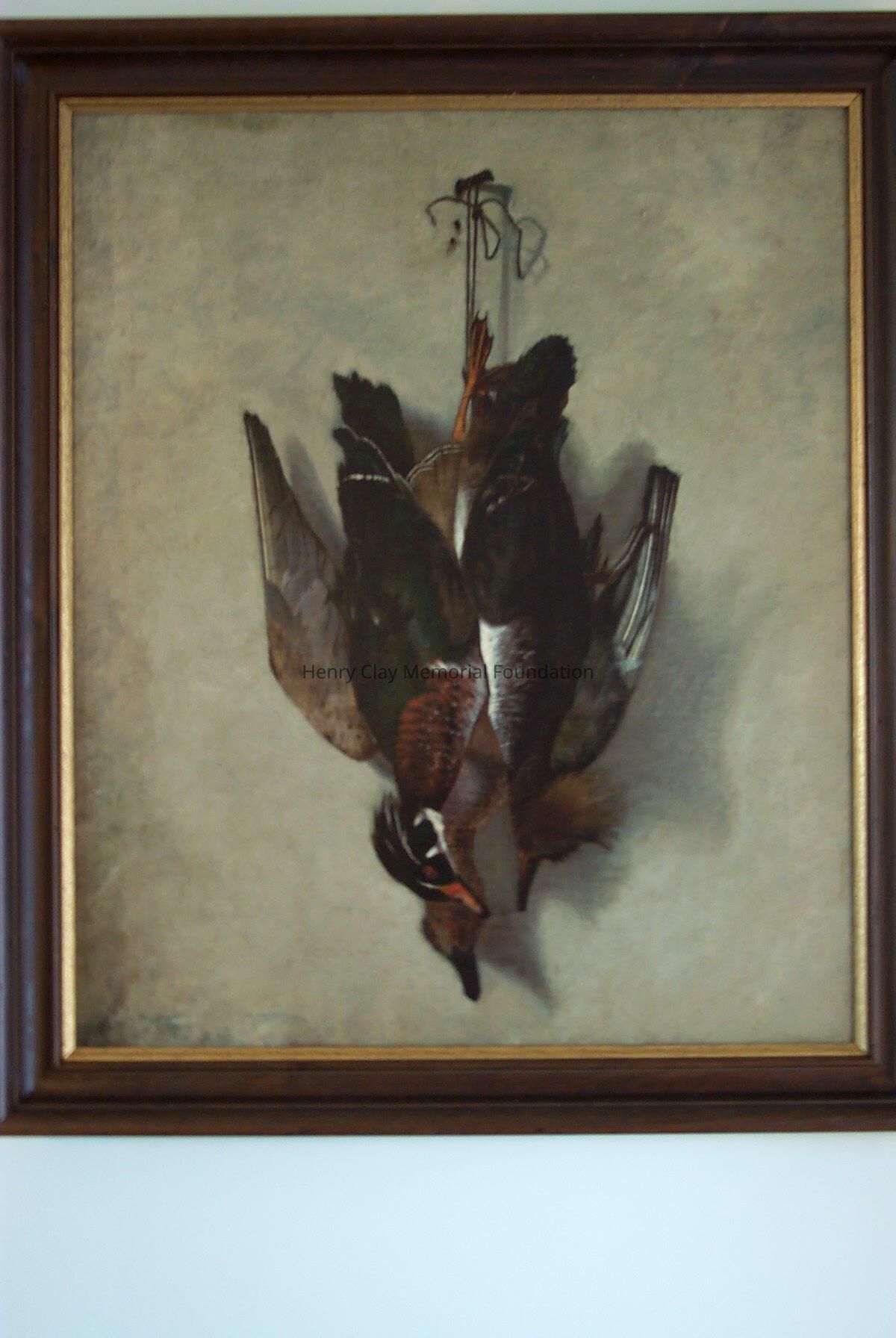 Oil on canvas of three dead ducks (a wood duck in the foreground left) hanging from a single looped twine. On a pale grey/green background. Unsigned. Framed in a dark wood frame with gold inner lip.Dimensions