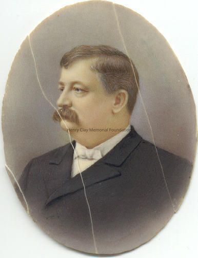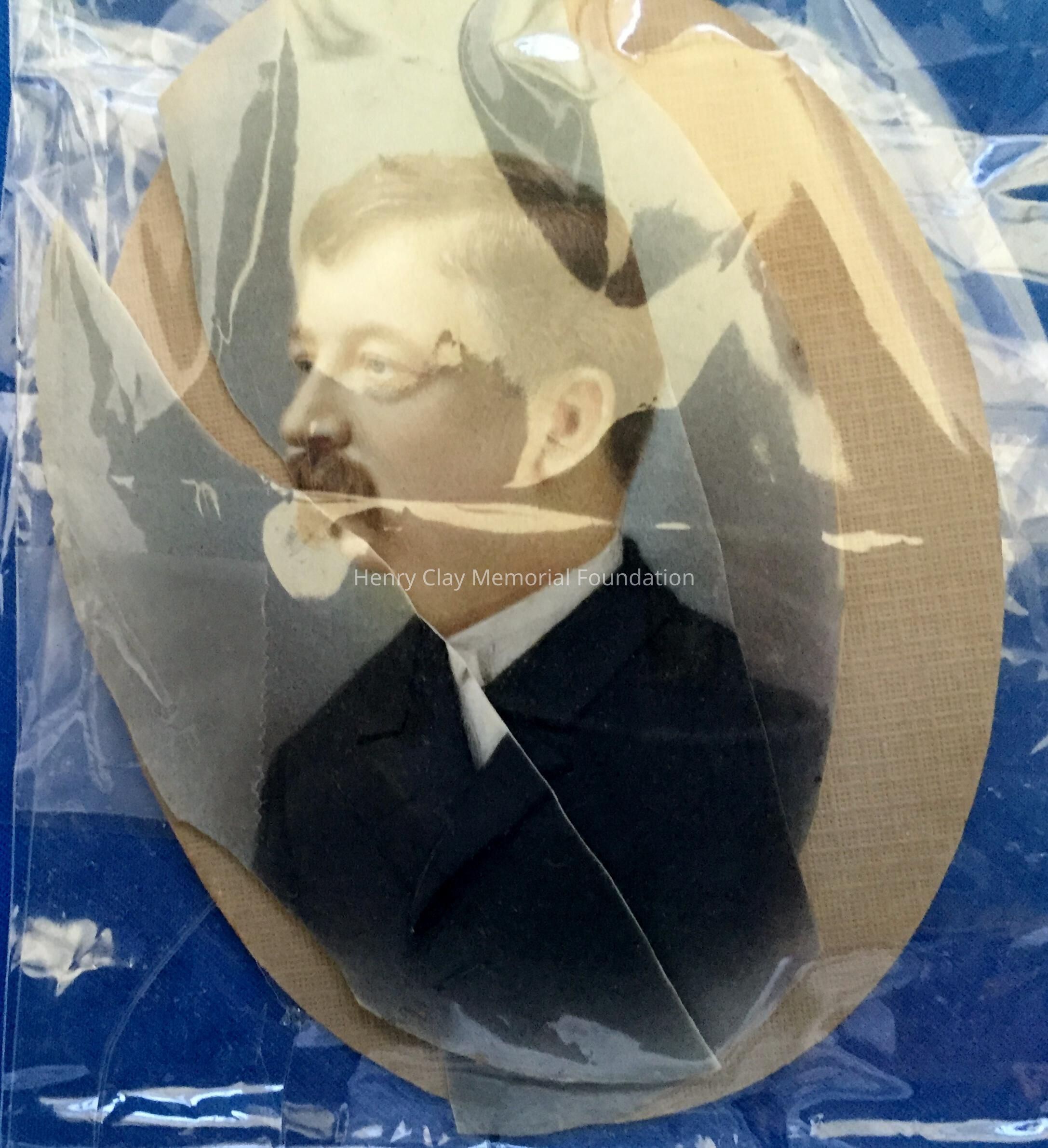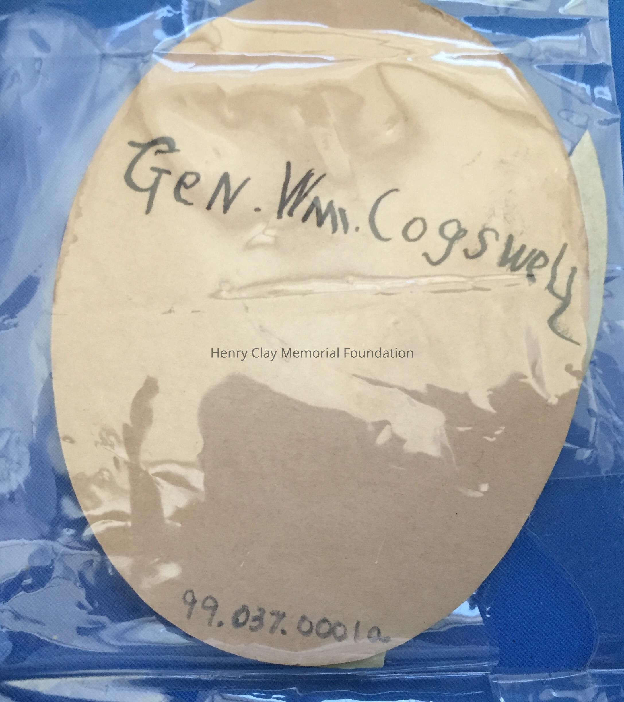 Miniature oval painting depicting a man with brown hair and moustache, wearing a white bow tie and dark jacket. The painting is on a thin sheet of ivory which was once adhered to another oval board. On the other oval board, written on back in ink, is "Gen. Wm. Cogswell."