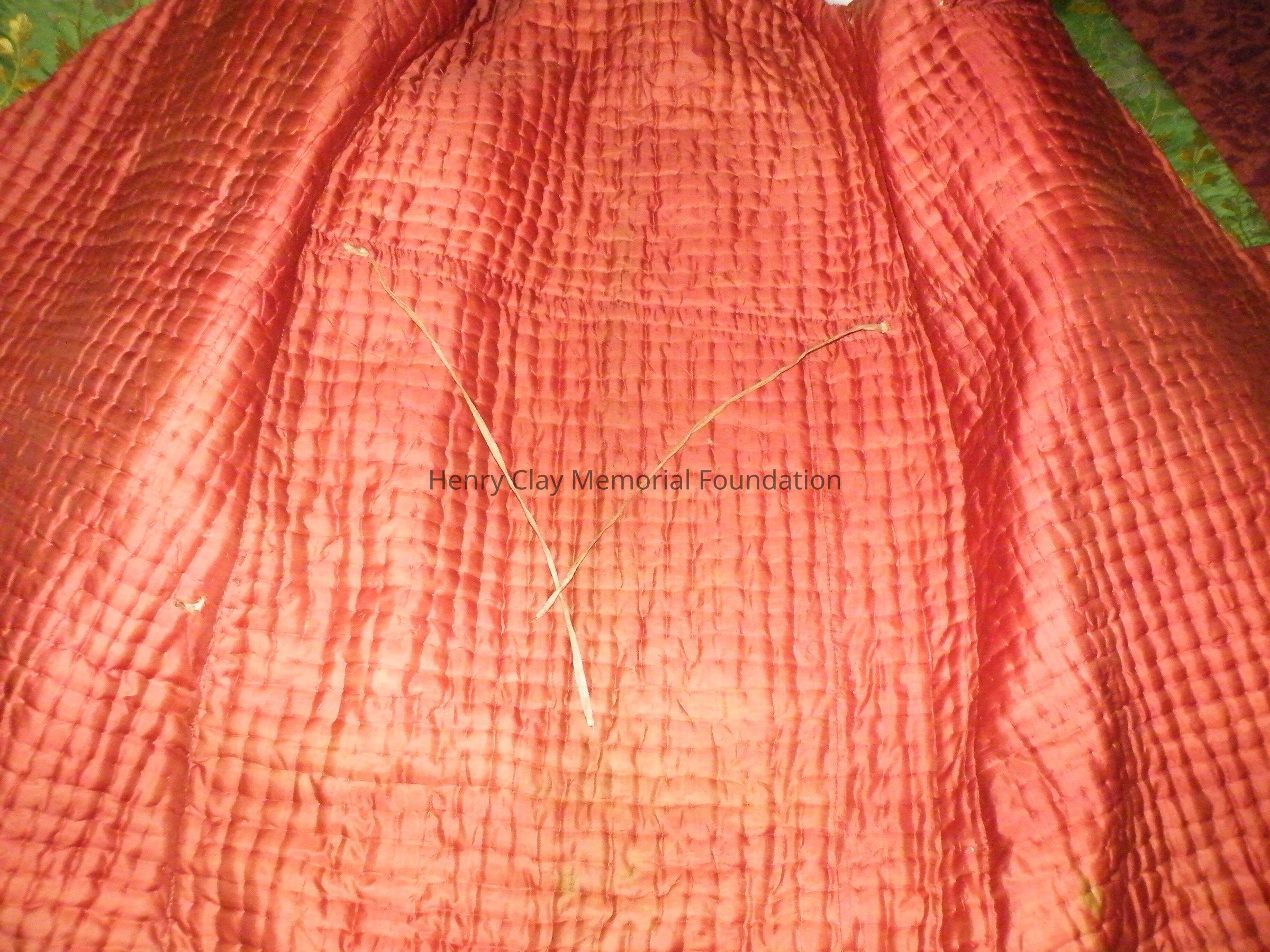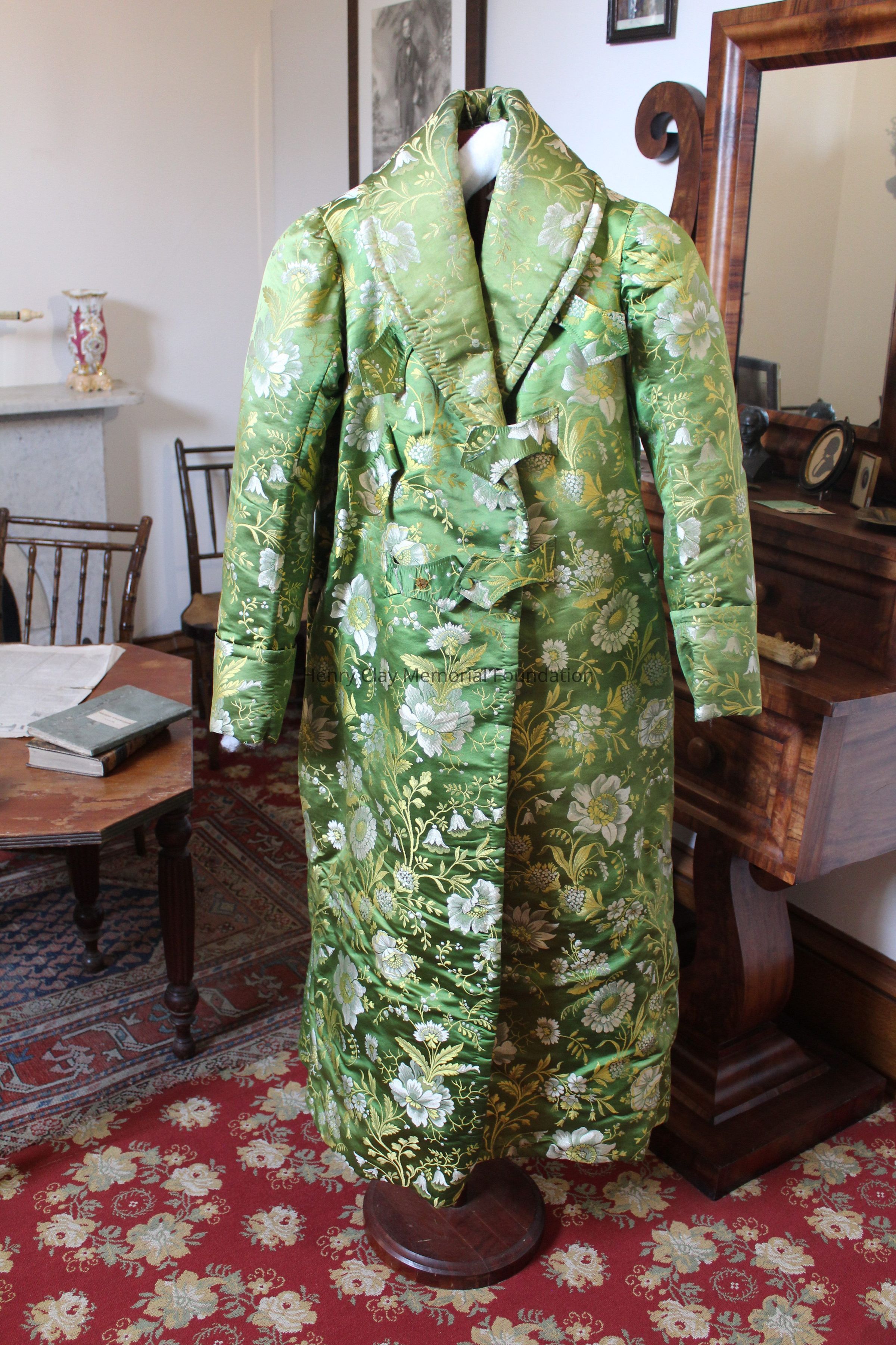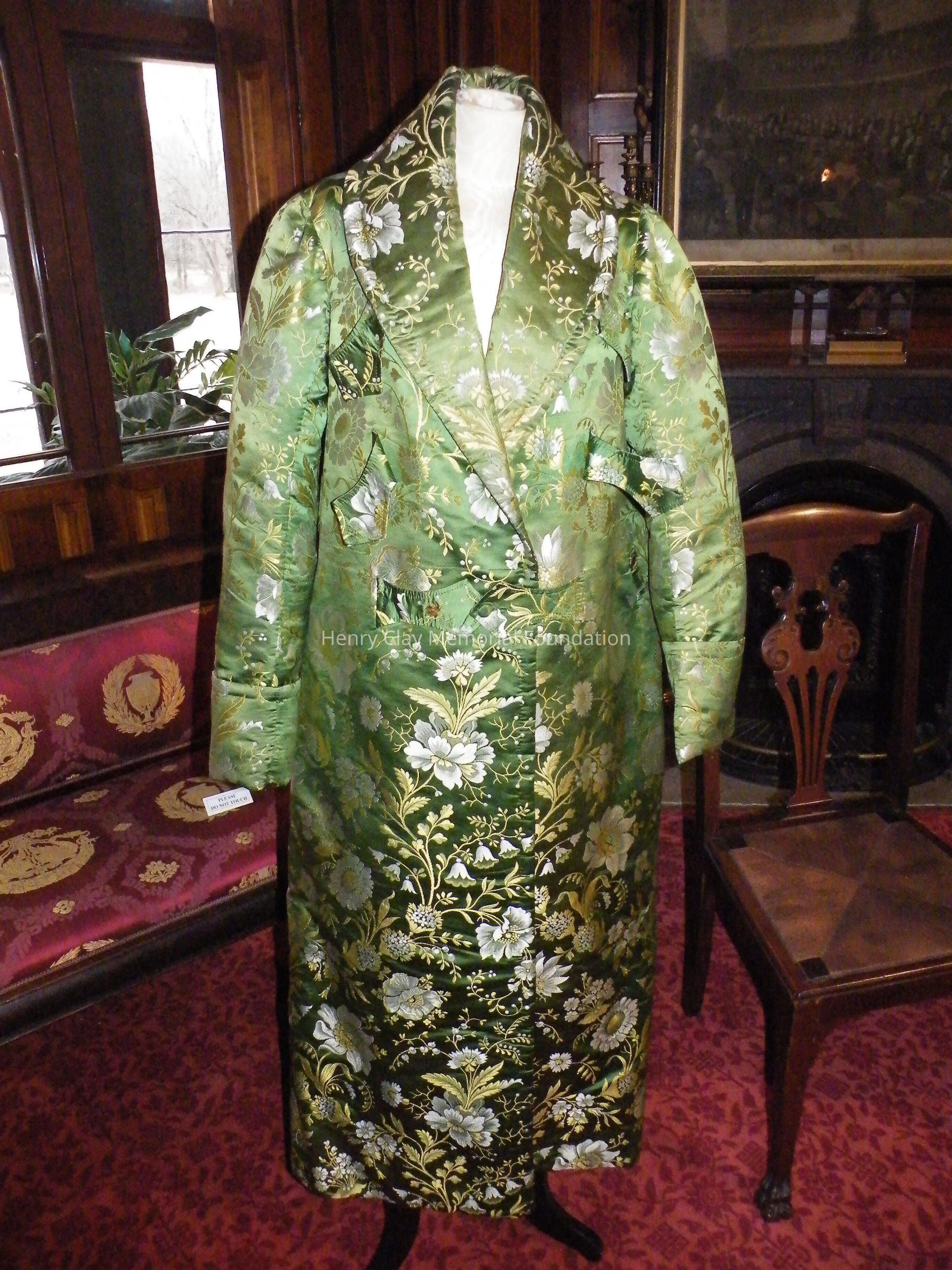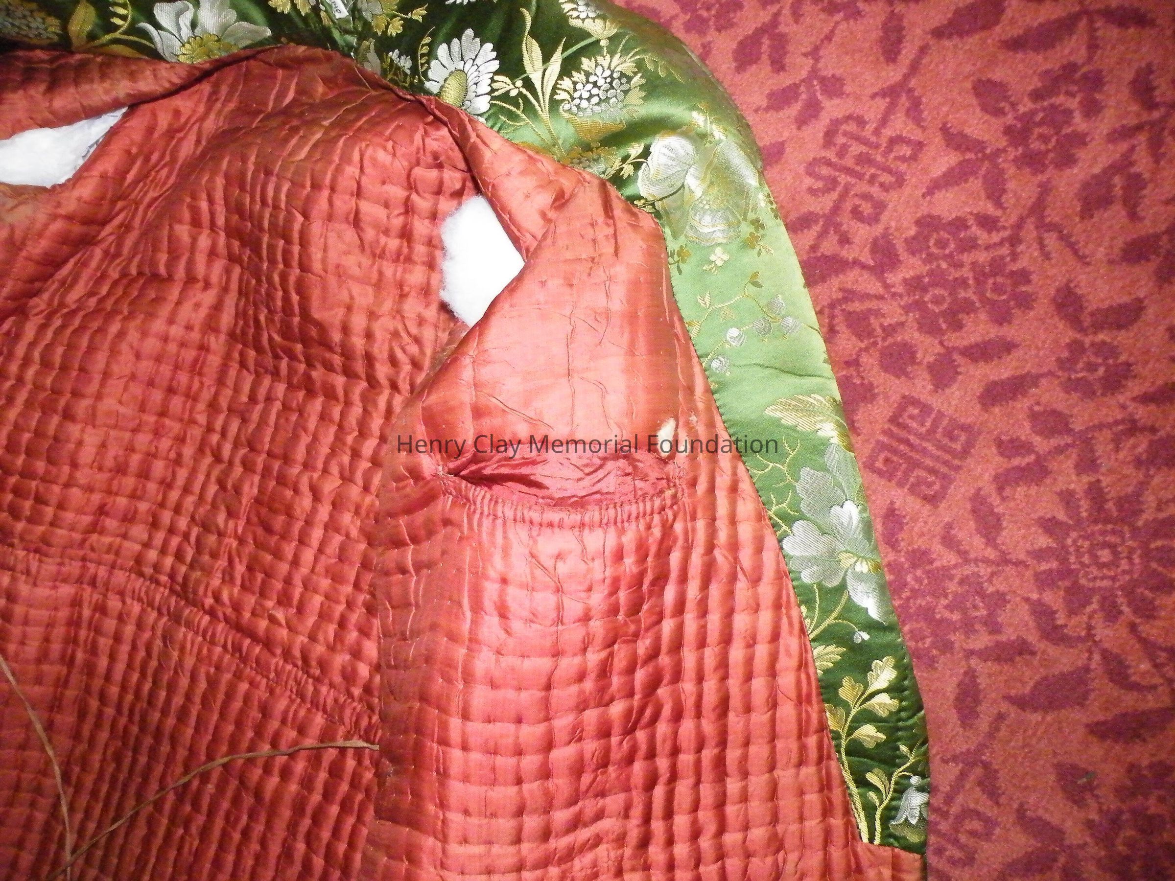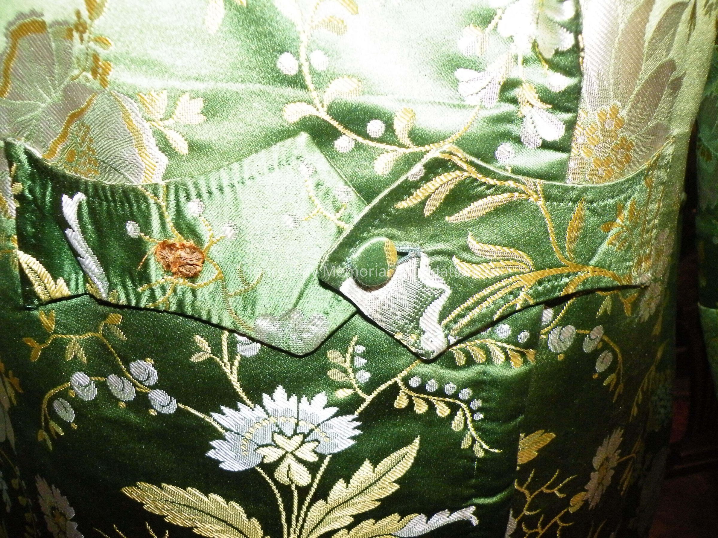 Green robe embroidered with small white and yellow flowers. Inside is quilted with red fabric. Sleeves have cuffs. Interior pocket on left breast. interior drawstring. 3" exterior [?] on both sides. 5" pieces of cloth extend from body of robe with 2 buttons on each piece of cloth; one button hole on each piece. 4 belt loops around exterior waist. 2 exterior hip pockets.