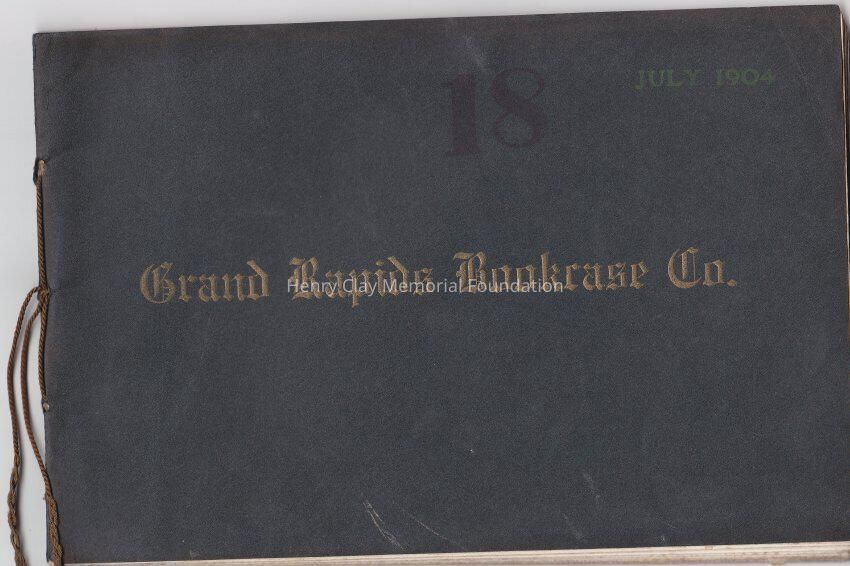 A catalogue "Grand Rapids Bookcase Co. " A number 18 is visible on top of the gold writings and July 1904 in a light green. Inside a list of Mission Furniture. Book is held togheter by a black string.