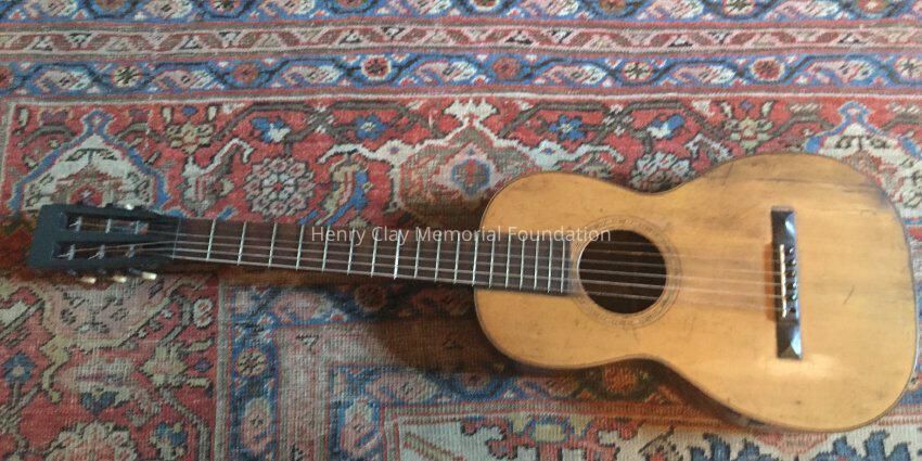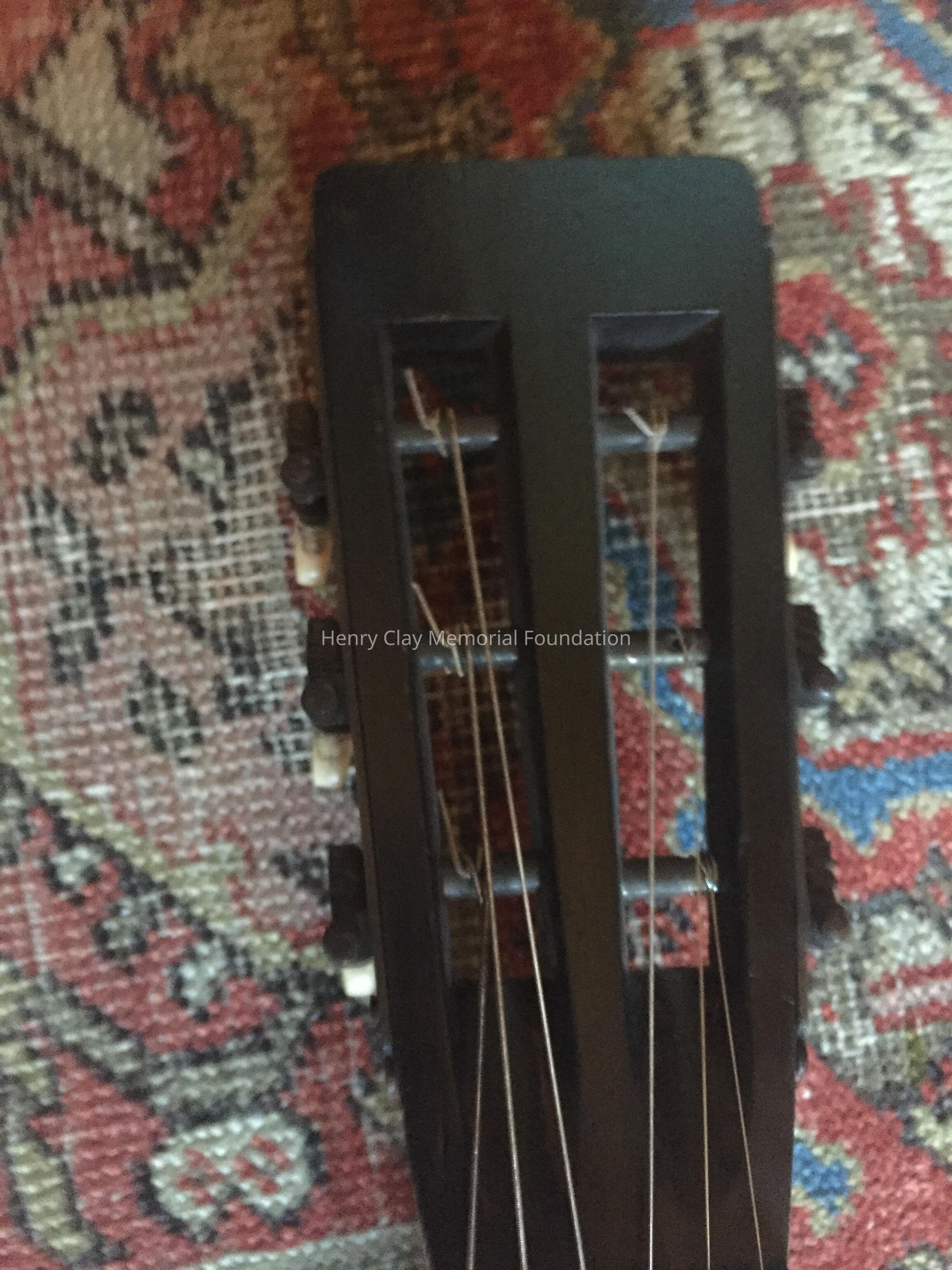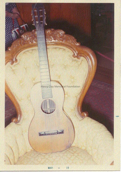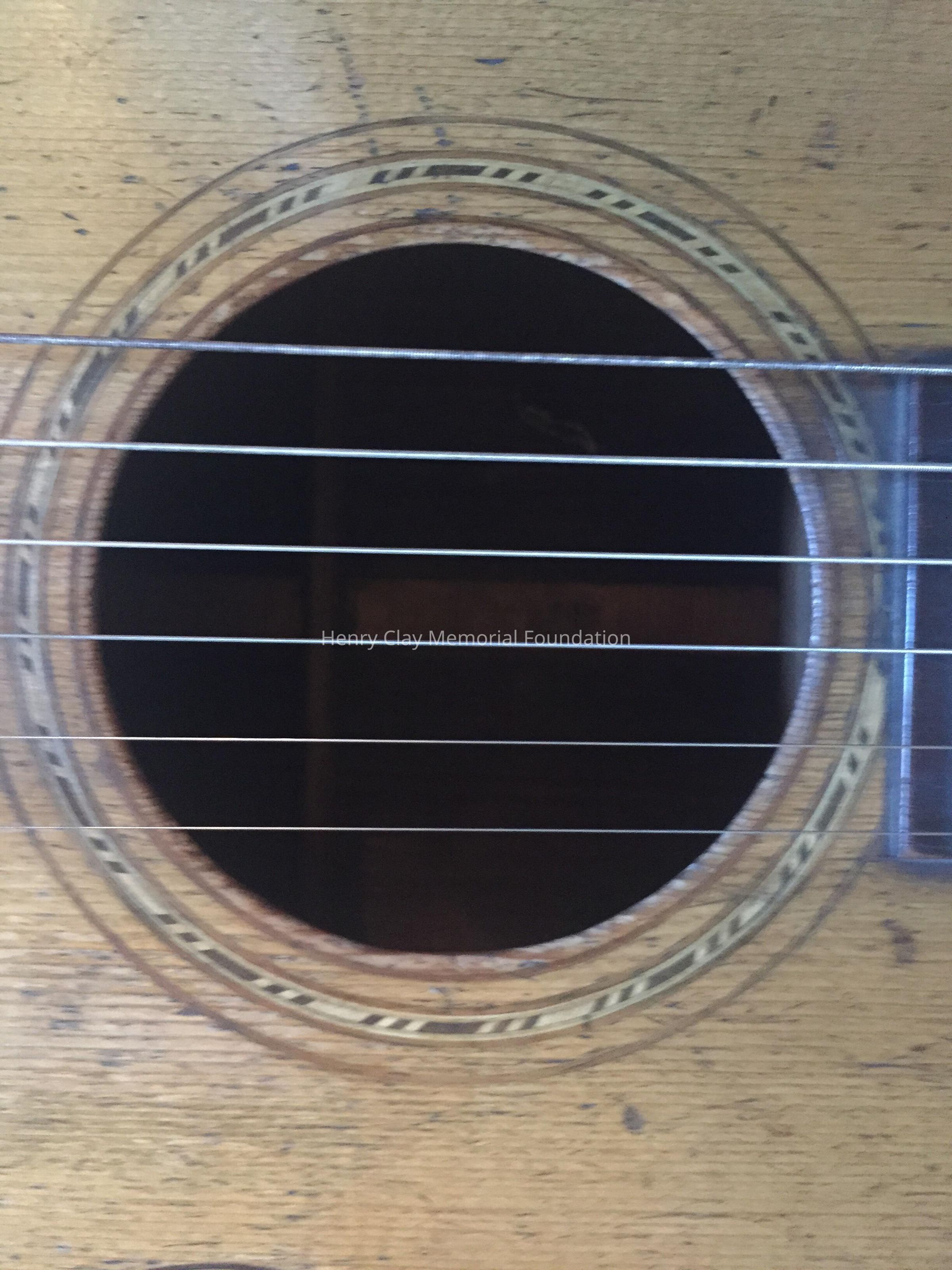 Acoustic guitar with painted black wood case. Guitar is labeled "C.F. Martin / New York" inside and also stamped on back with maker's name. The back and sides of the guitar are Brazilian Rosewood and the top is spruce. Case is wooden with metal fixtures to secure lid. Inside of case is line with blue fabric A partial paper label is still existent on case.