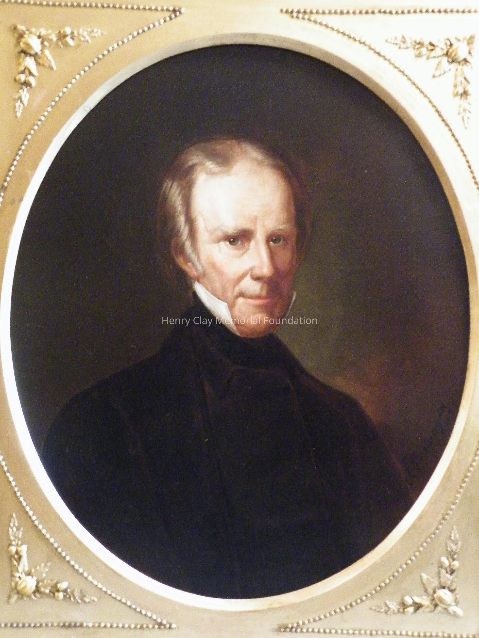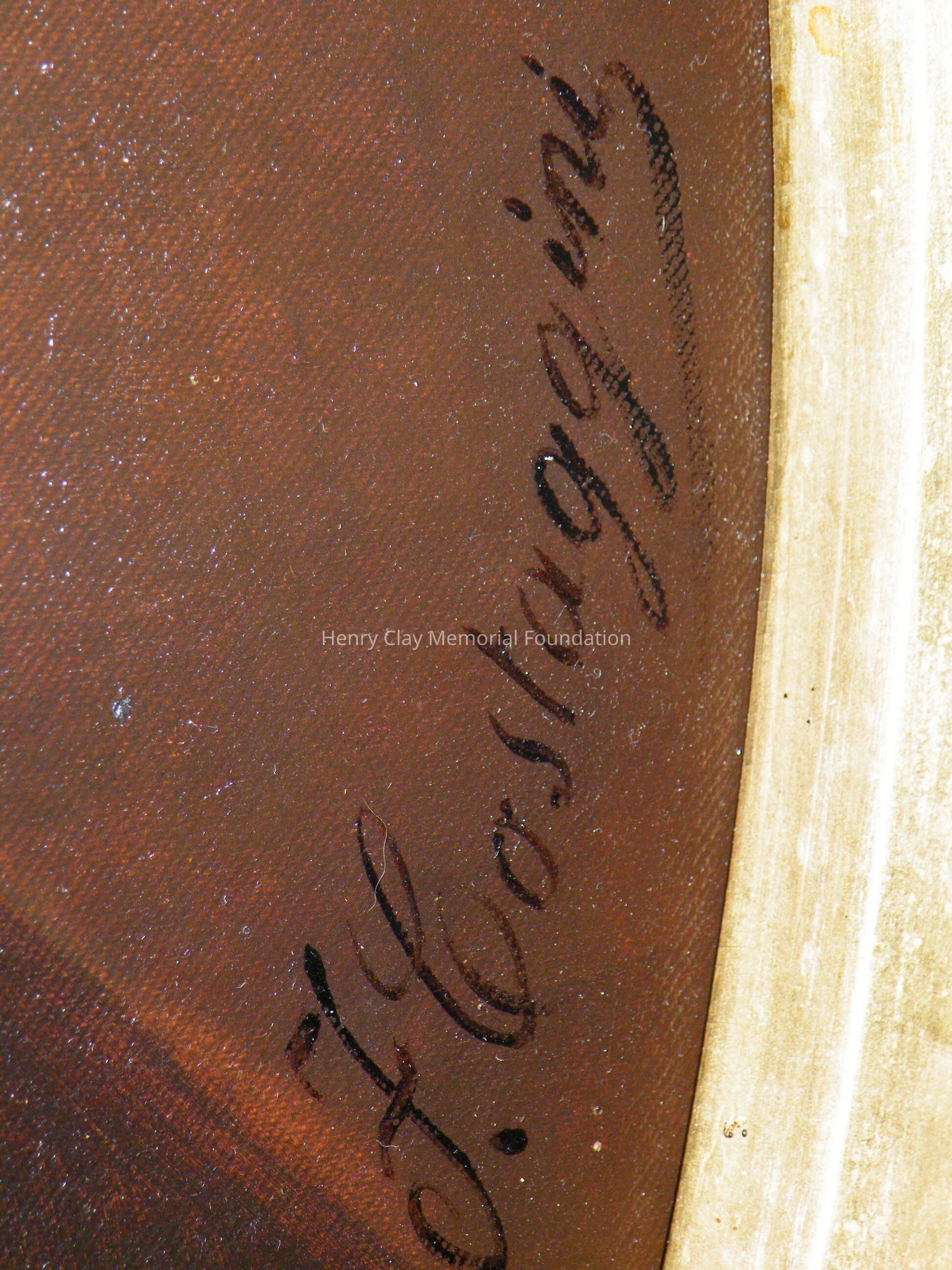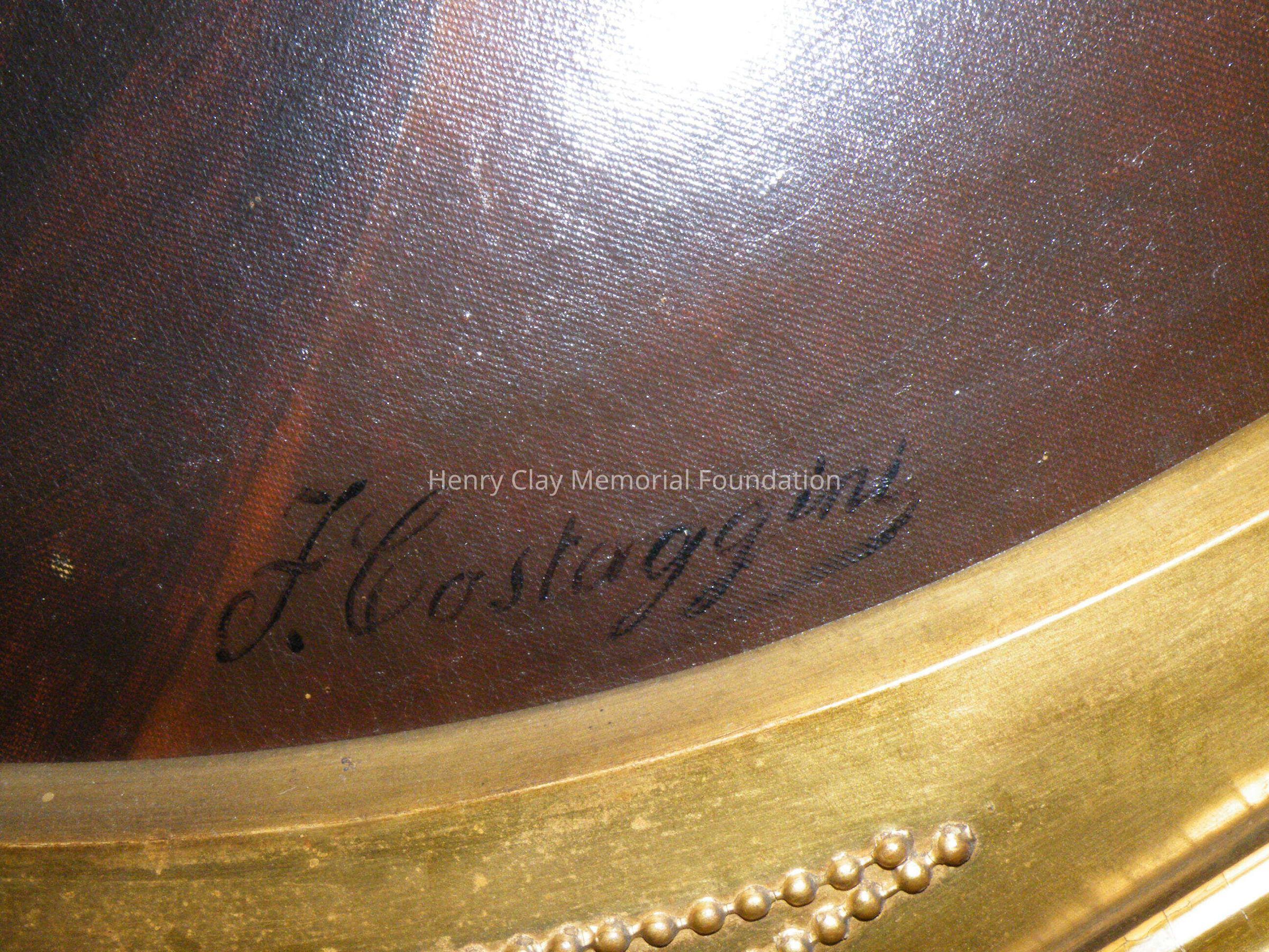 Oval head and shoulders portrait of Henry Clay. Clay is shown in a dark jacket and high white collar, dark background. Signed "F. Costaggini" in black on LR. On the back upper center of the oval stretcher is a black label with white lettering, "Geo. Rynea Jr. / Artist and Painters Supply / 418 Sevneth St. / Washington, DC." The canvas is over an oval stretcher. Written on the back of the canvas in ink, "Property of Mrs. Anne C. Clay." Framed in gilt frame with oval window, decorative elements around outer edge, floral decorations in corners.Dimensions