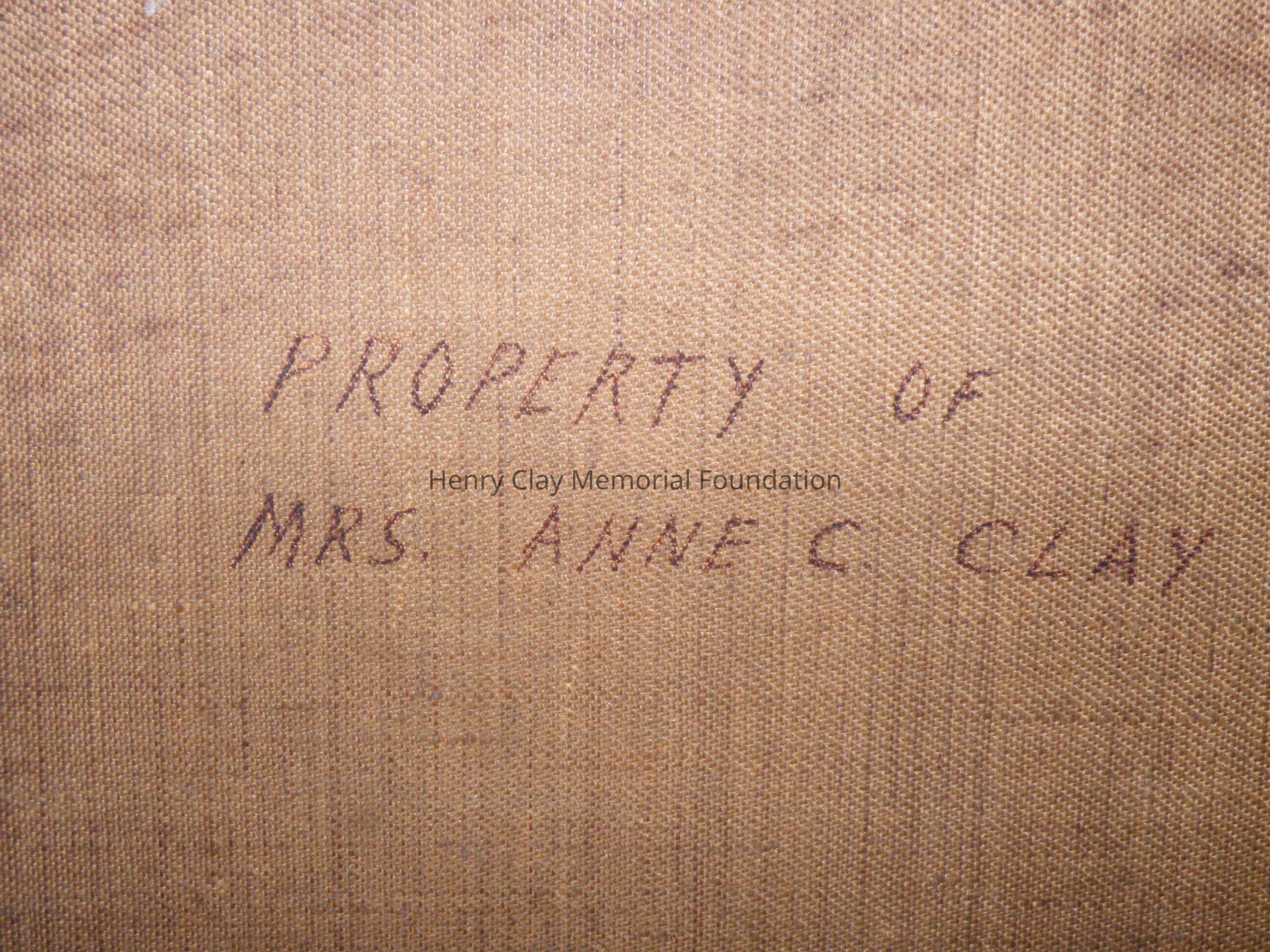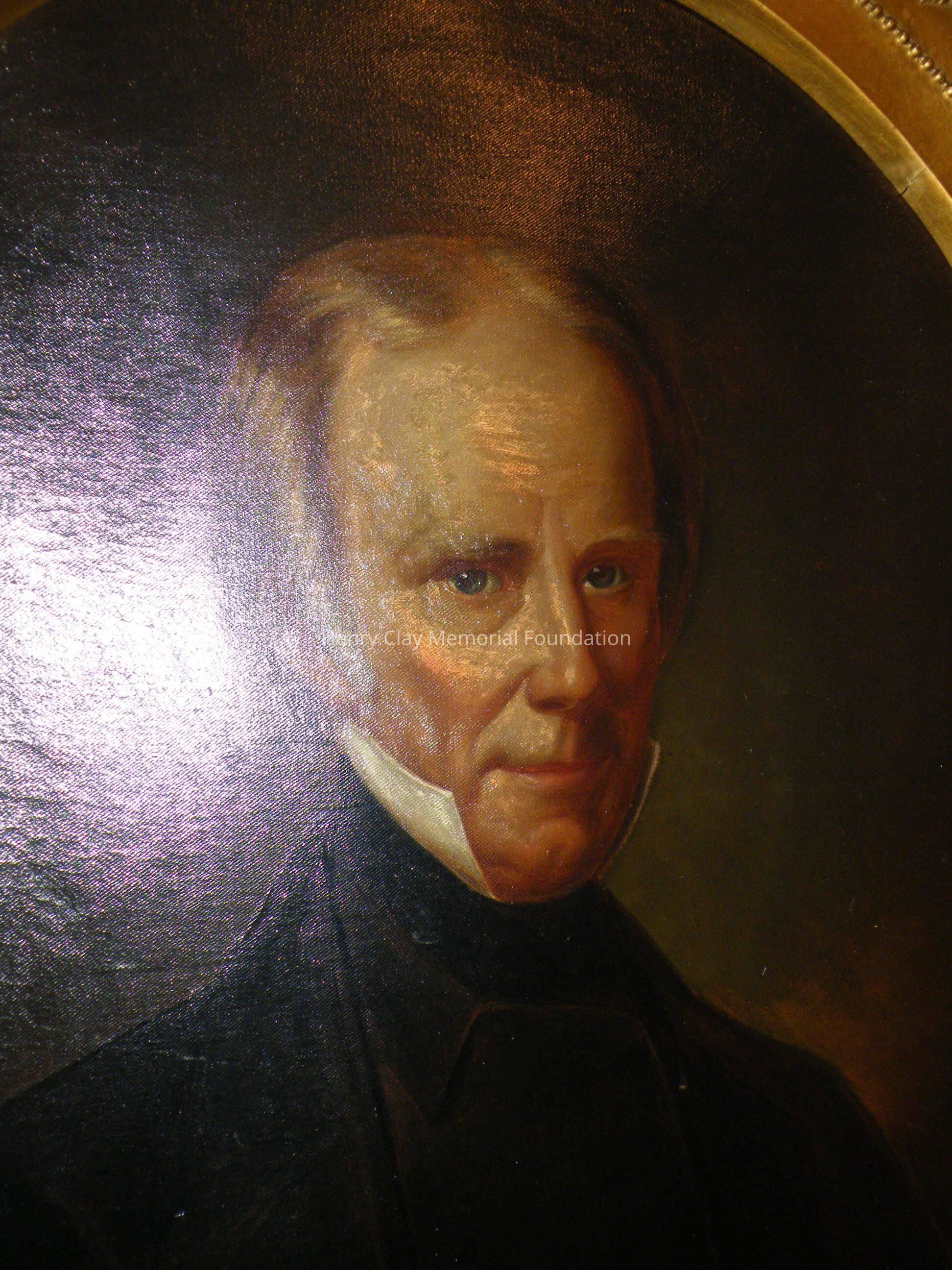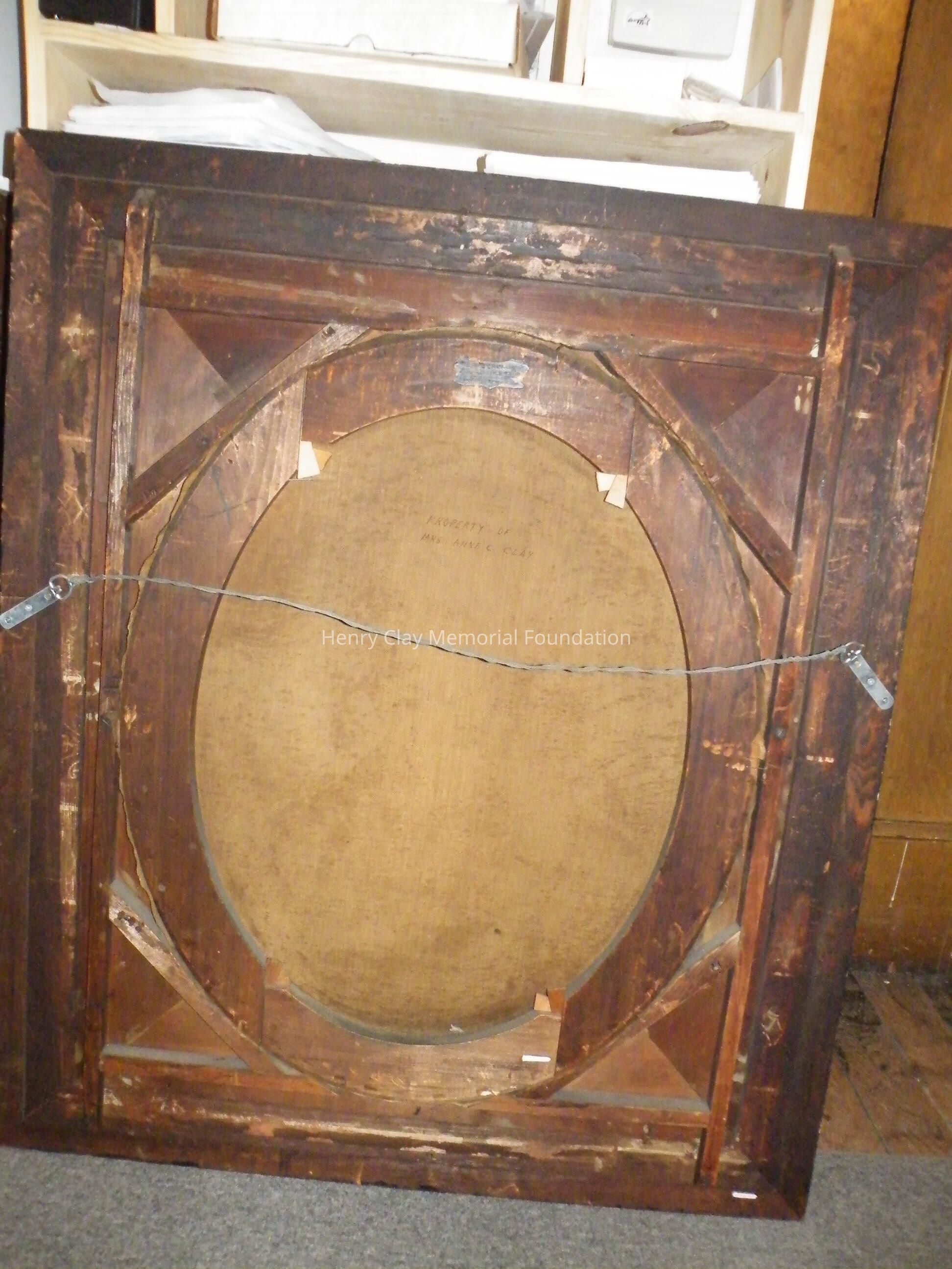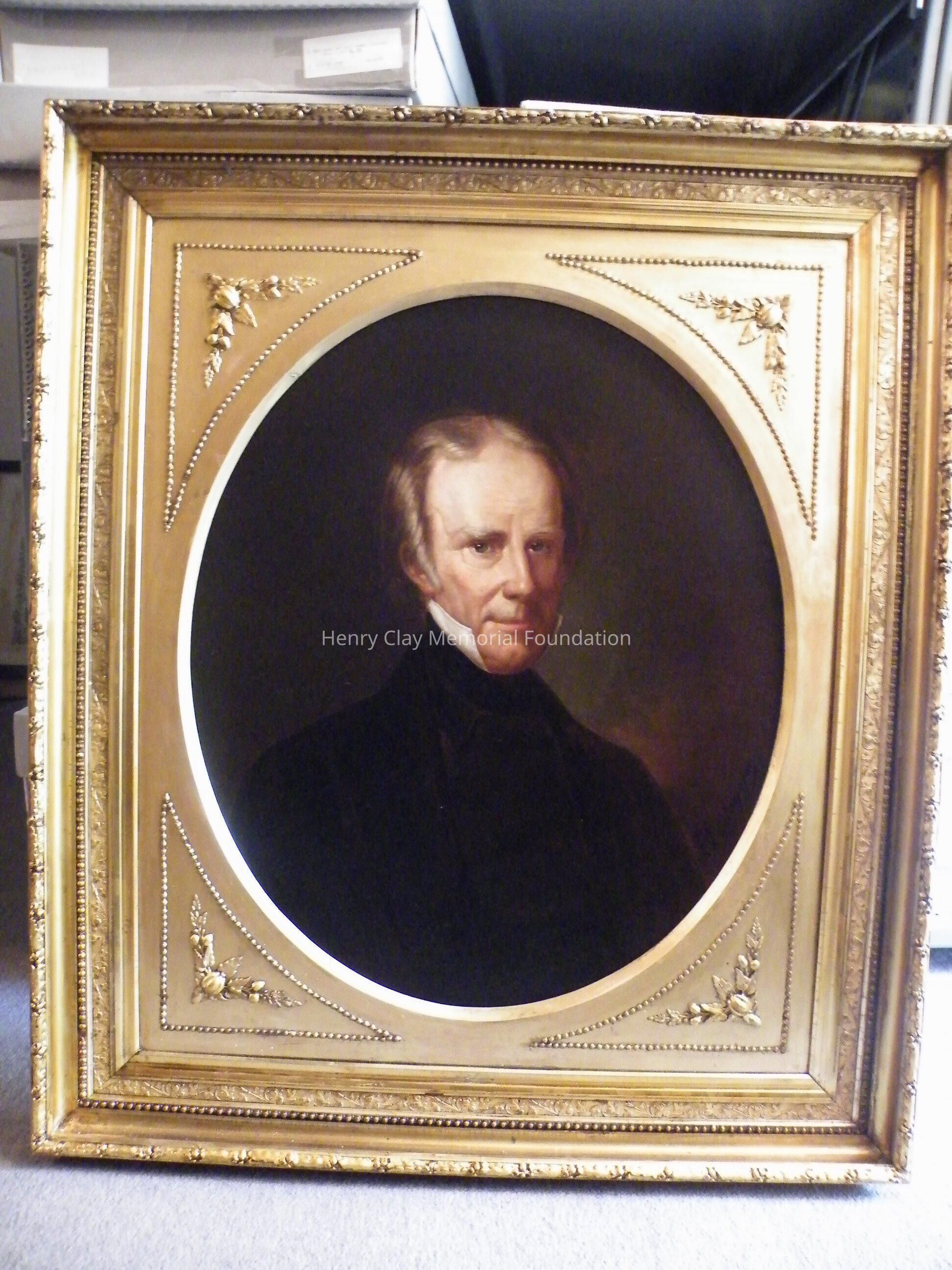 Oval head and shoulders portrait of Henry Clay. Clay is shown in a dark jacket and high white collar, dark background. Signed "F. Costaggini" in black on LR. On the back upper center of the oval stretcher is a black label with white lettering, "Geo. Rynea Jr. / Artist and Painters Supply / 418 Sevneth St. / Washington, DC." The canvas is over an oval stretcher. Written on the back of the canvas in ink, "Property of Mrs. Anne C. Clay." Framed in gilt frame with oval window, decorative elements around outer edge, floral decorations in corners.Dimensions