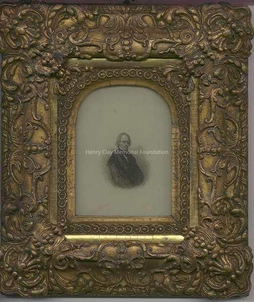 Picture of H. Clay from waist up, arms crossed at lap. Clay shown in dark coat with dark tie and a high white collar, hair disheveled. Picture of Clay is embroidered on cream-colored silk. Picture is framed behind glass in a very ornate, wide, gilded frame. Window of frame is arched.