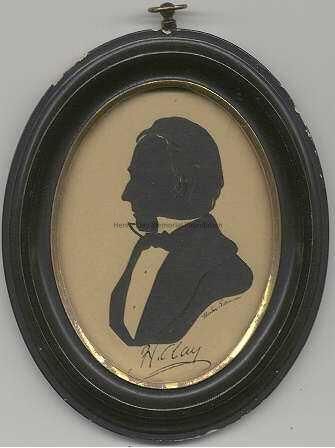 Black paper cut-out depicting bust of Henry Clay's left profile, identified beneath as "H. Clay." Signed "Beatrix Sherman" under shoulder. Cut-out is adhered to off-white paper background. In a black oval frame with gilded inner lip and a brass ring screwed into the top for hanging; frame is probably original. Adhered to backboard is a partial paper label reading, "--trix Sherman Silhouette".Dimensions
