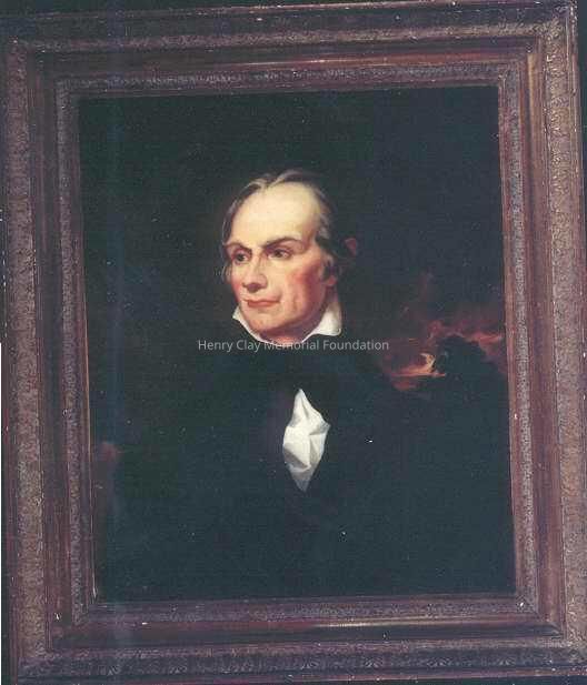 Head and shoulders portrait of Henry Clay attributed to John Neagle. Clay is shown in looking to his right, wearing a dark jacket and tie with a high, white collar. A tree is shown in the background to the right. Framed in a wide, gilt frame. Canvas is adhered to a backboard.Dimensions
