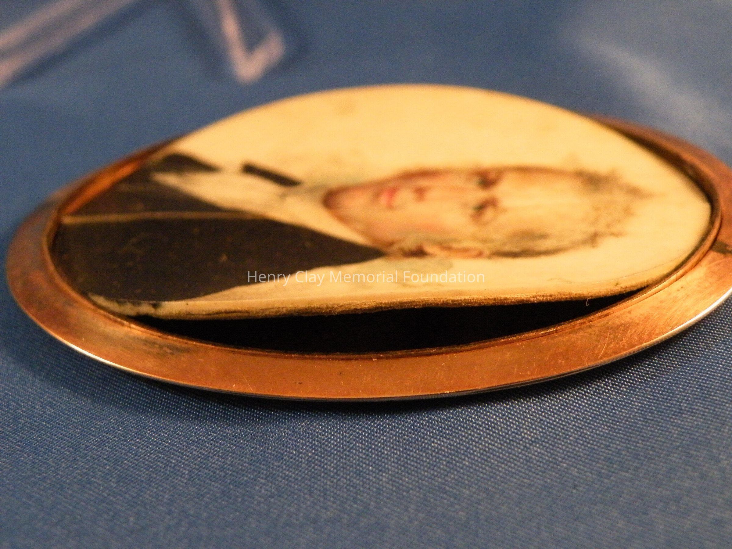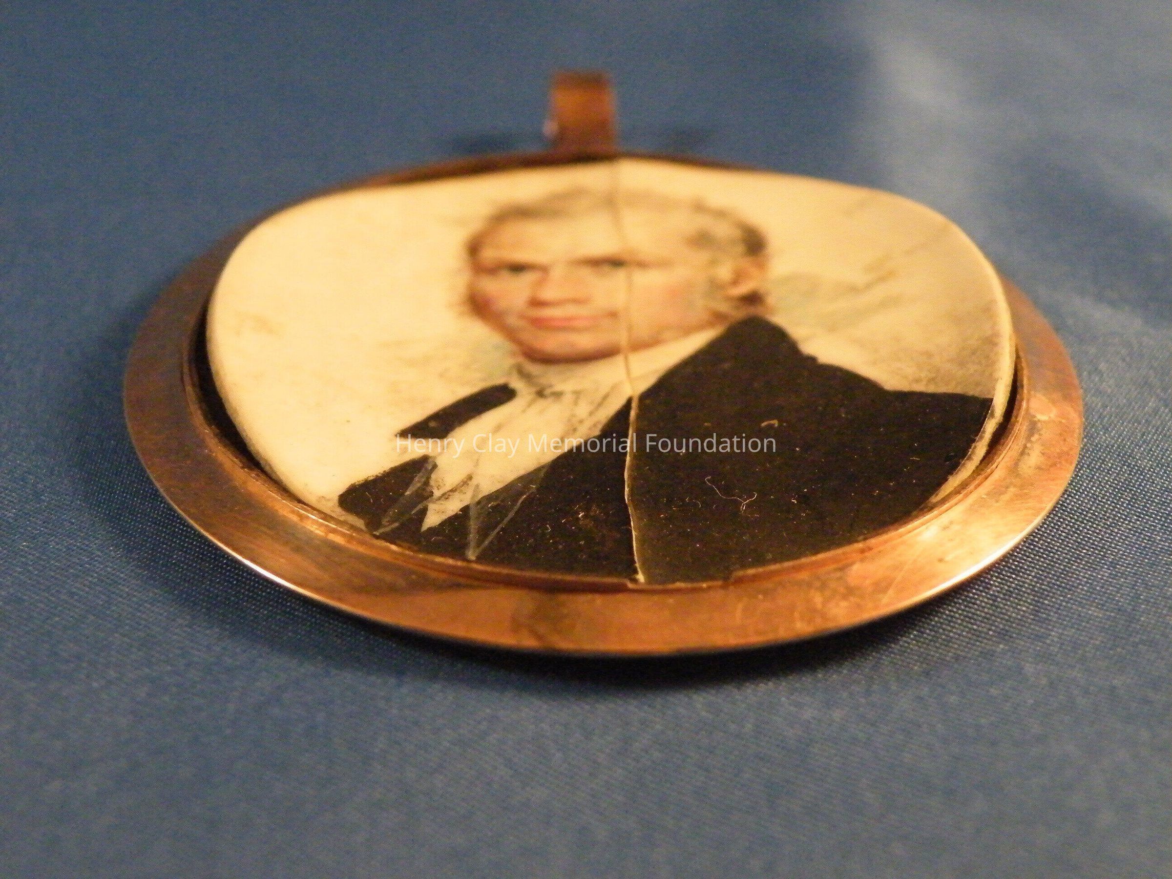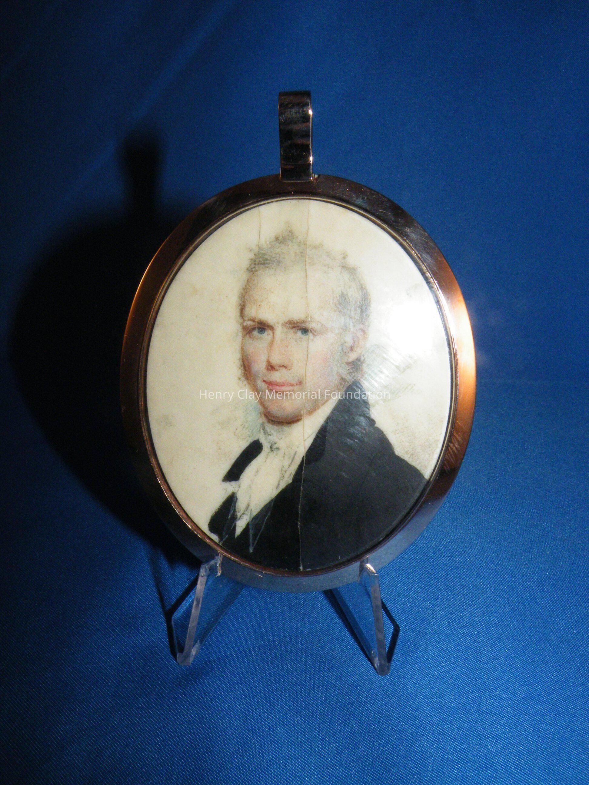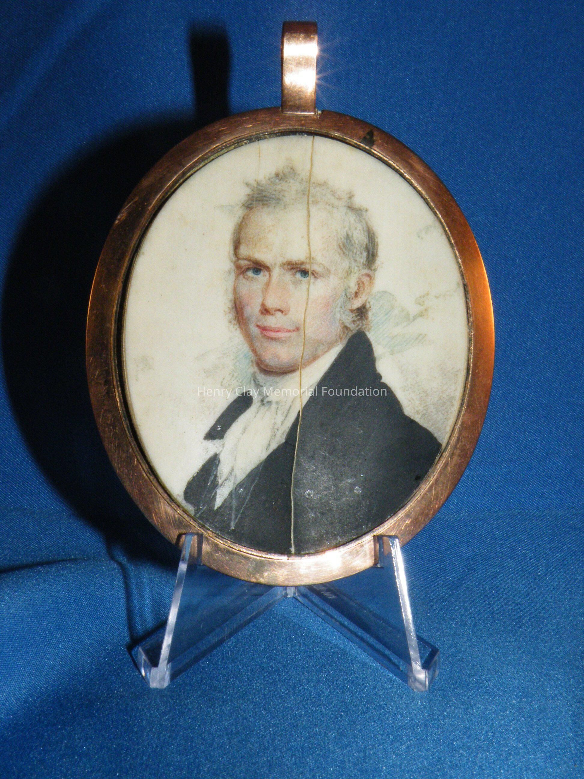 An elliptical miniature on ivory in gold frame of Henry Clay. Image is watercolor and is a bust of Henry Clay. Clay is facing left and wearing a black coat, white shirt, and white crevat. Clay is quite youthful in appearance and has white, curly, wild hair and long thick sideburns. The miniature is in a plain rose gold frame with a loop at the top for suspension as a pendant or from a hook for display. The miniature resides in a specially made red leather case with hook and latch closure. The ivory on which the miniature is painted is backed with a piece of a playing card (a club).Dimensions