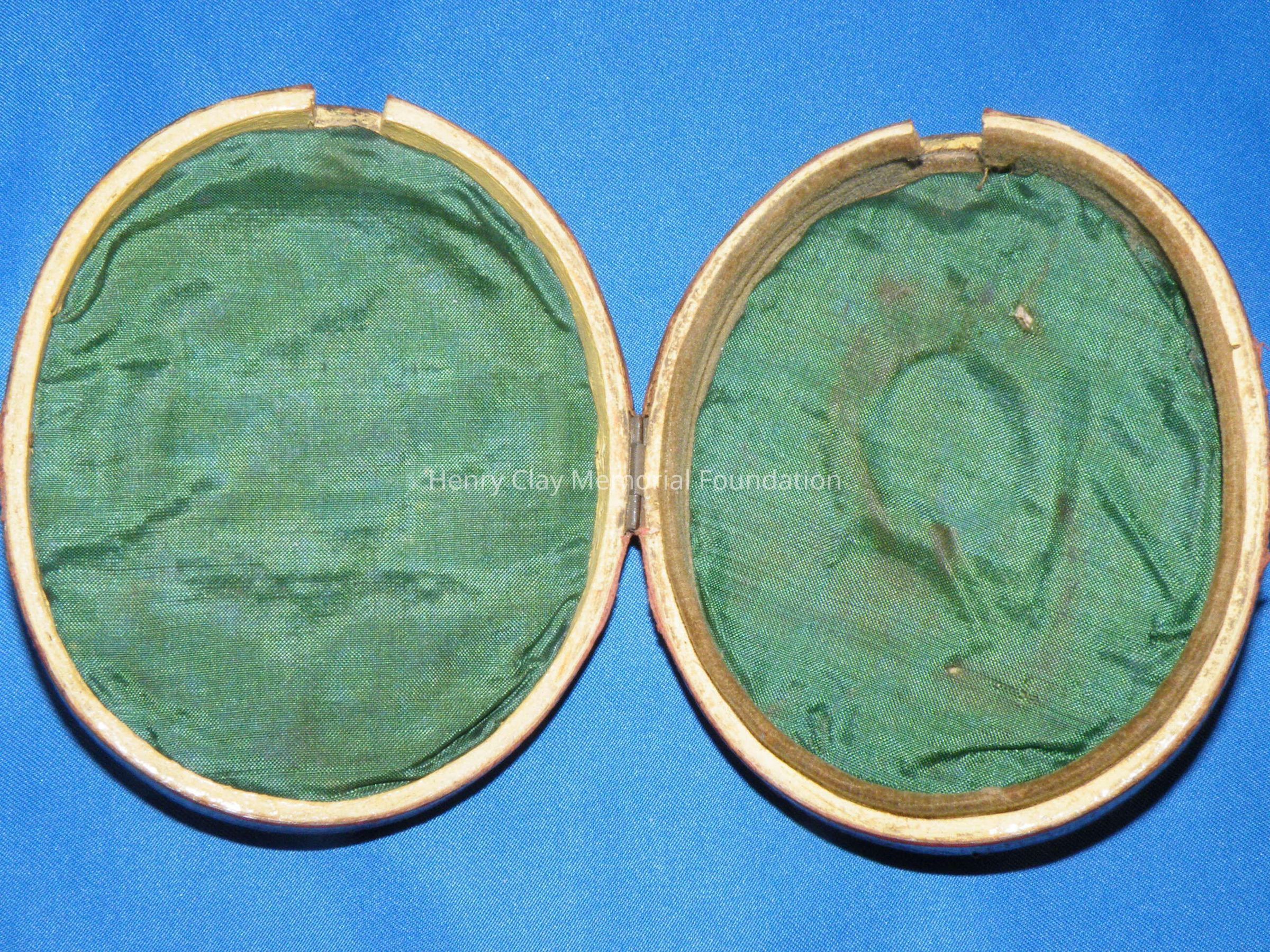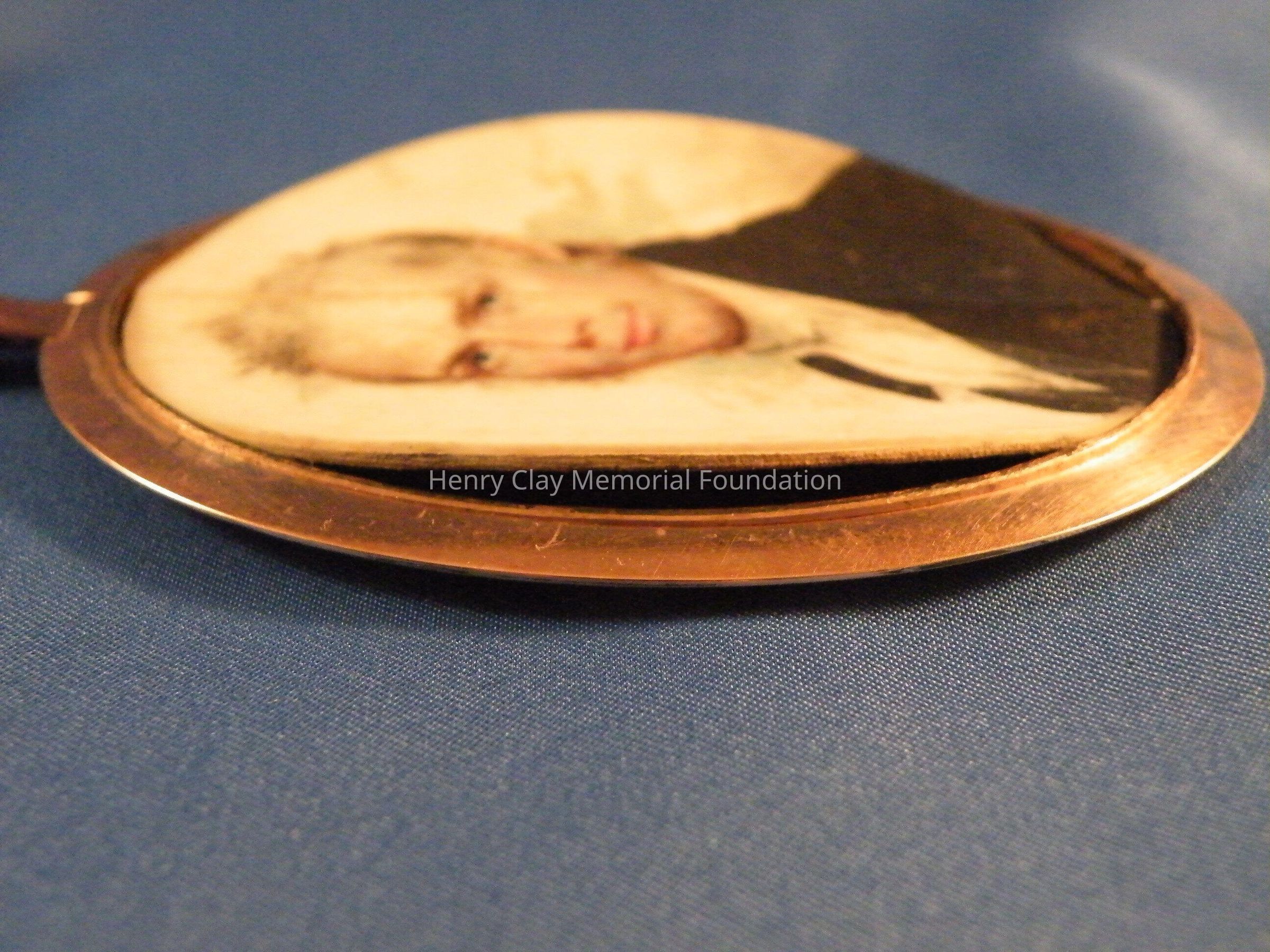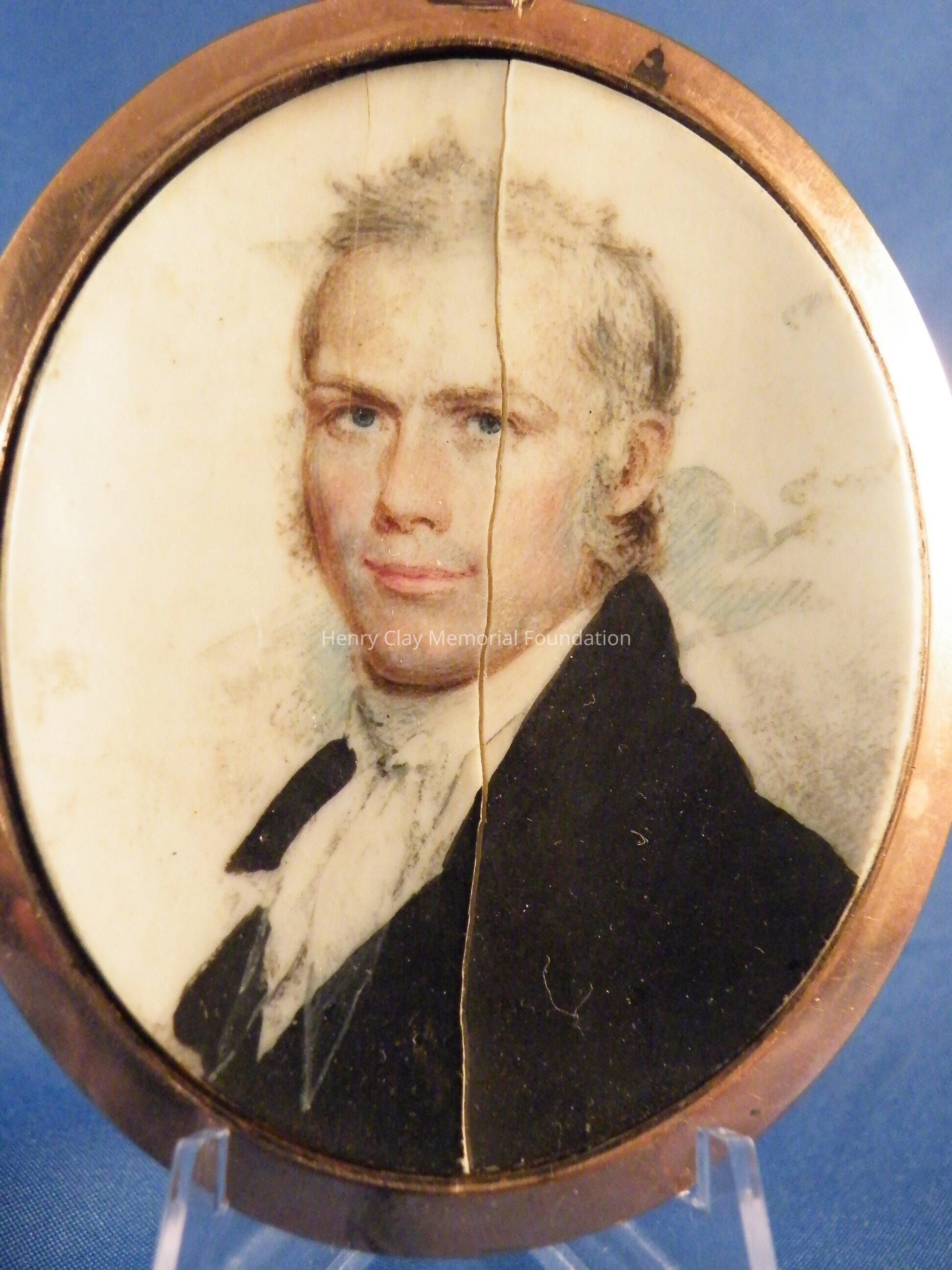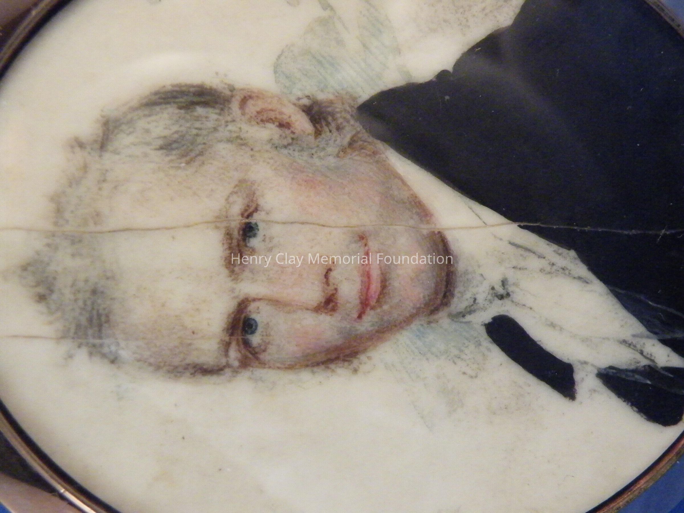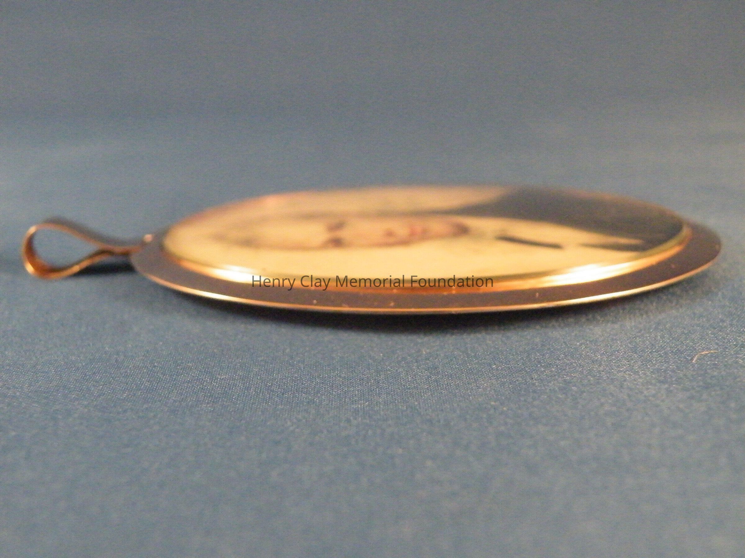 An elliptical miniature on ivory in gold frame of Henry Clay. Image is watercolor and is a bust of Henry Clay. Clay is facing left and wearing a black coat, white shirt, and white crevat. Clay is quite youthful in appearance and has white, curly, wild hair and long thick sideburns. The miniature is in a plain rose gold frame with a loop at the top for suspension as a pendant or from a hook for display. The miniature resides in a specially made red leather case with hook and latch closure. The ivory on which the miniature is painted is backed with a piece of a playing card (a club).Dimensions