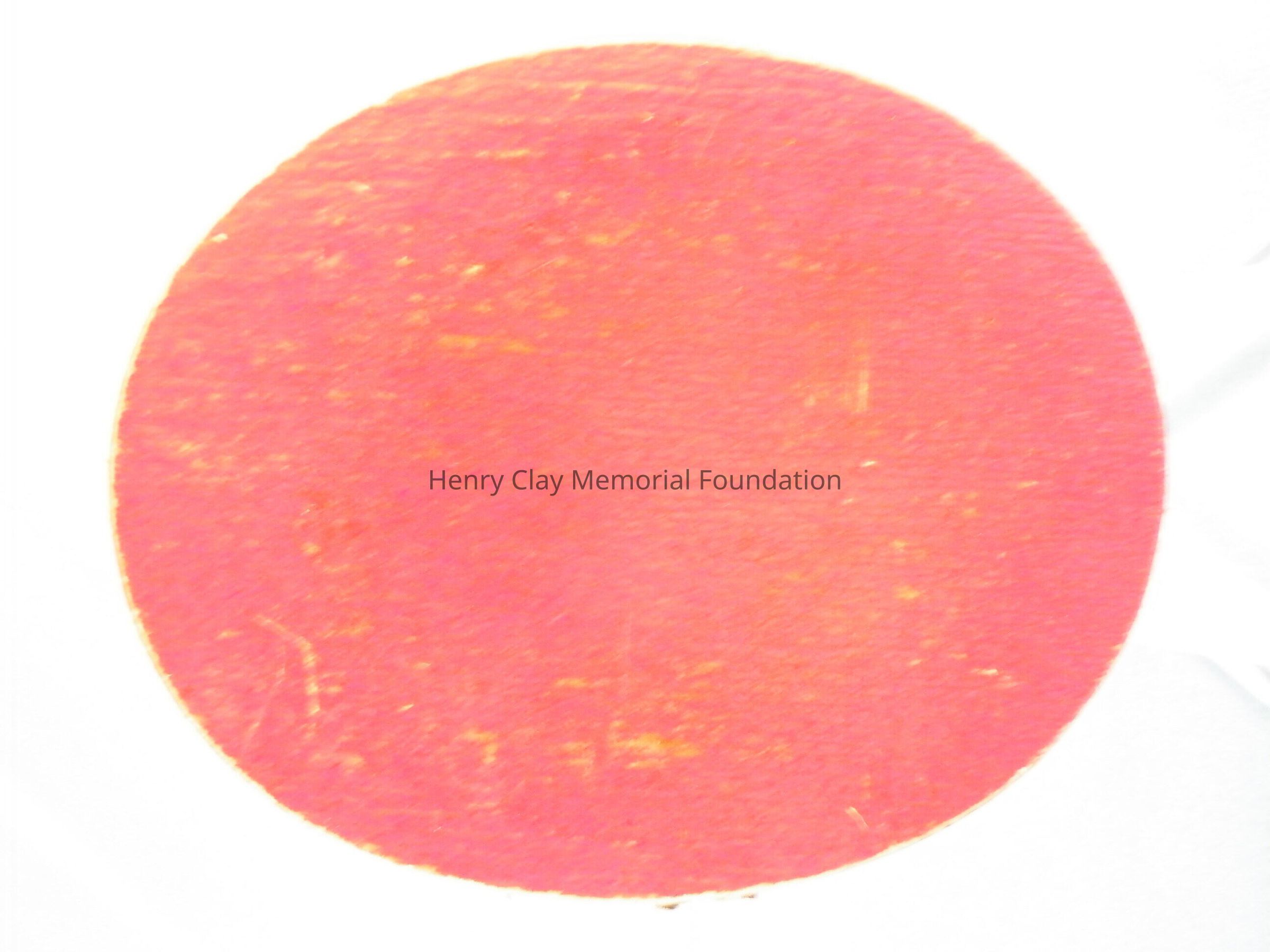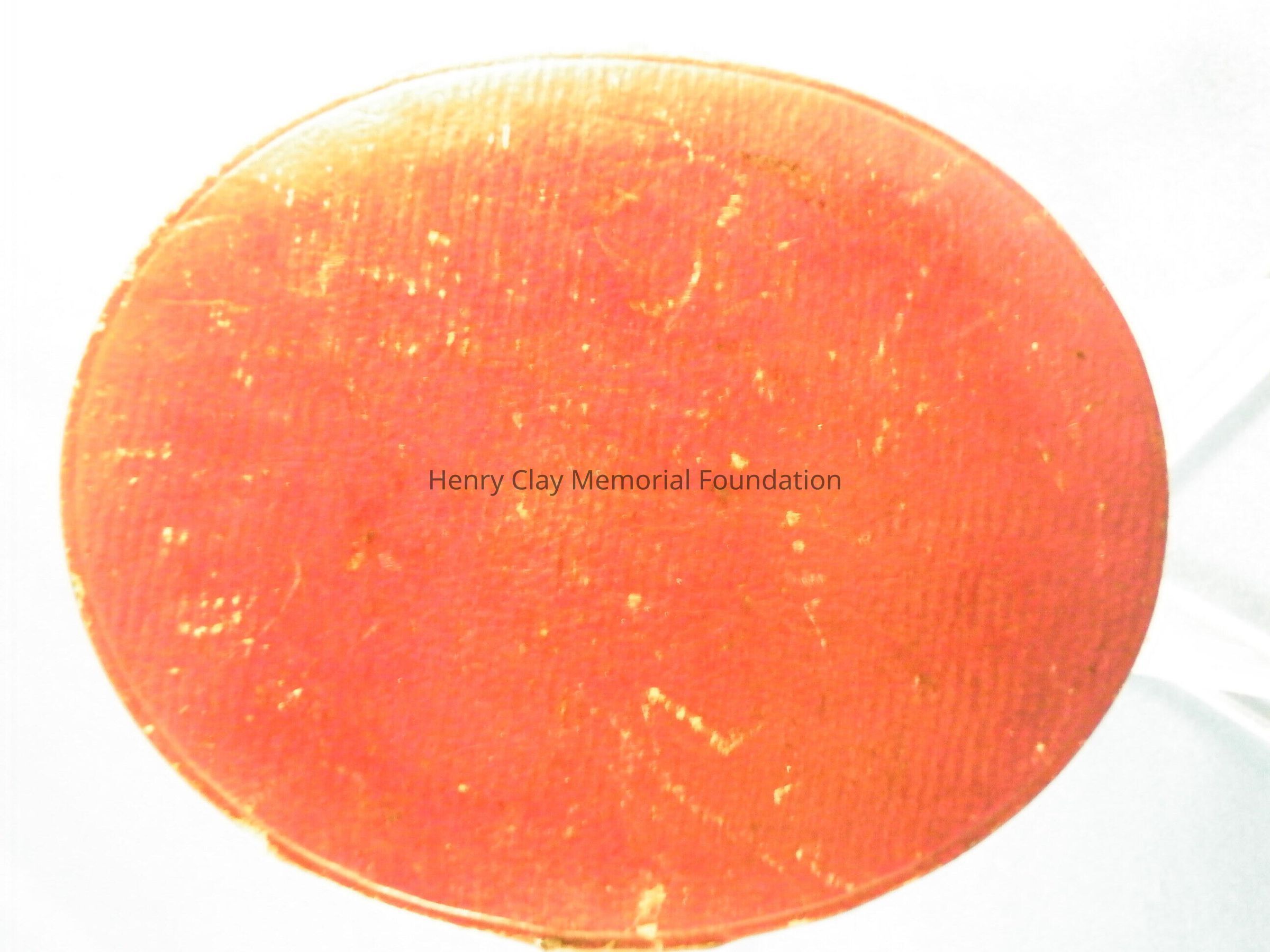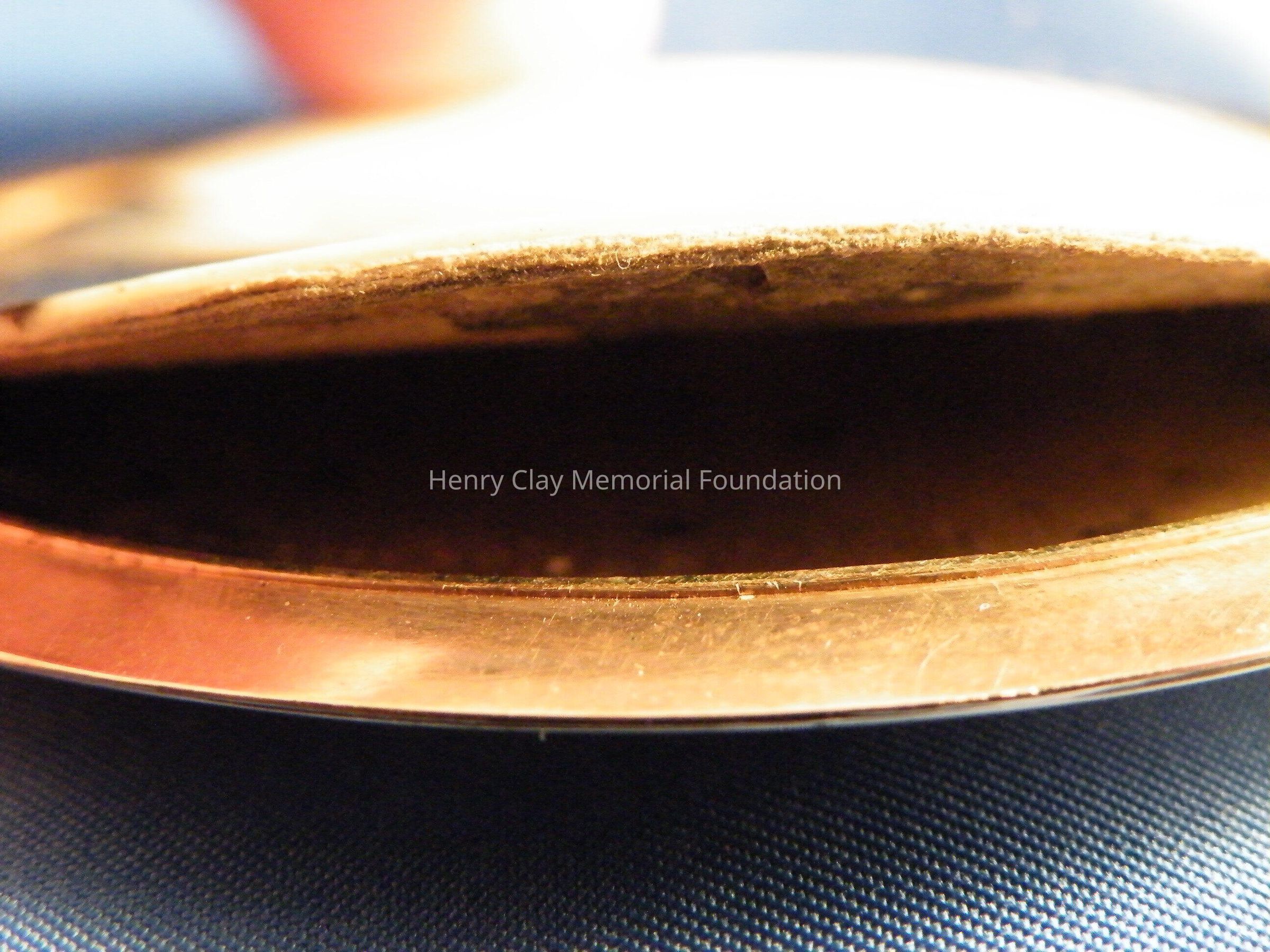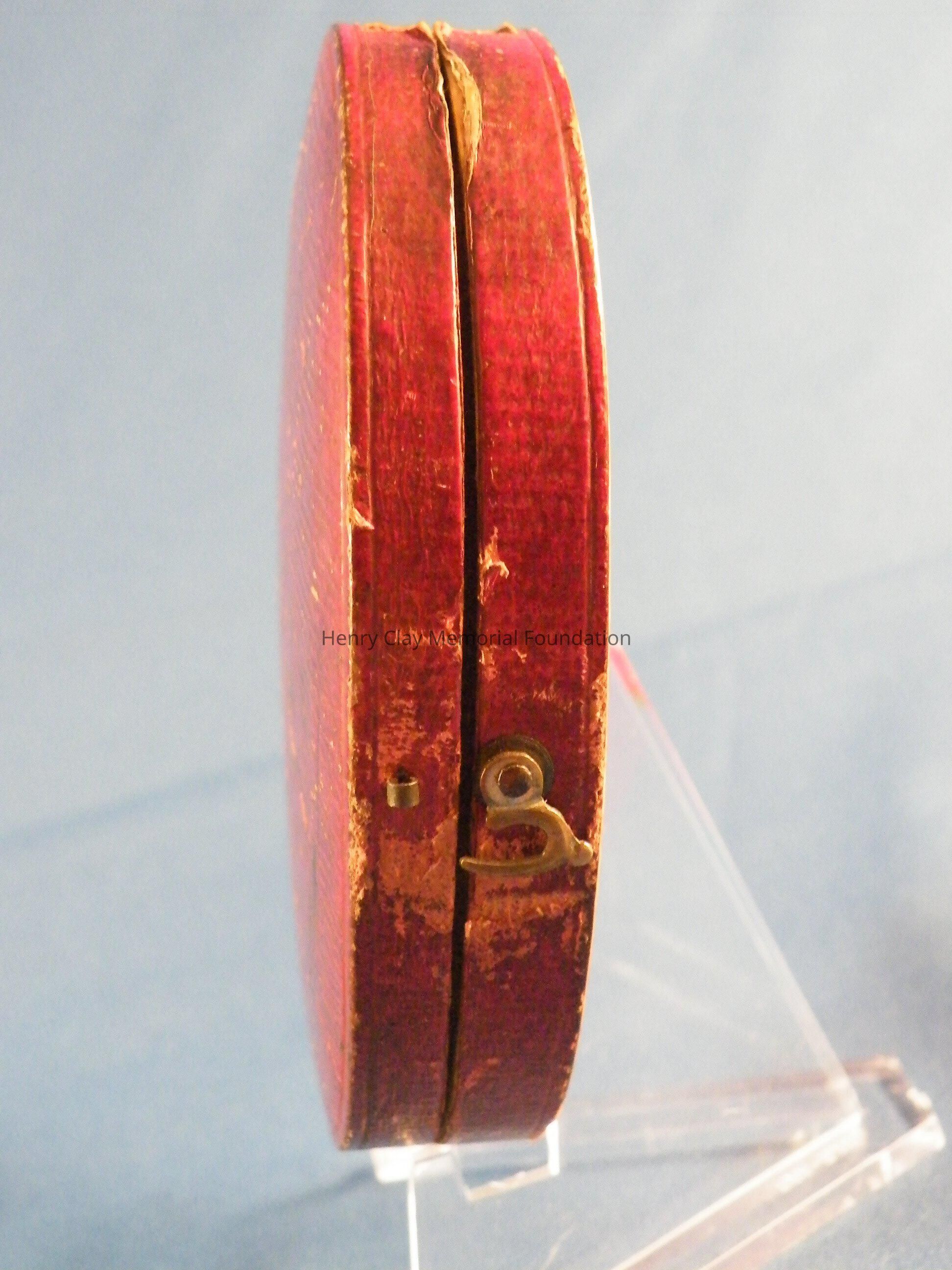 An elliptical miniature on ivory in gold frame of Henry Clay. Image is watercolor and is a bust of Henry Clay. Clay is facing left and wearing a black coat, white shirt, and white crevat. Clay is quite youthful in appearance and has white, curly, wild hair and long thick sideburns. The miniature is in a plain rose gold frame with a loop at the top for suspension as a pendant or from a hook for display. The miniature resides in a specially made red leather case with hook and latch closure. The ivory on which the miniature is painted is backed with a piece of a playing card (a club).Dimensions