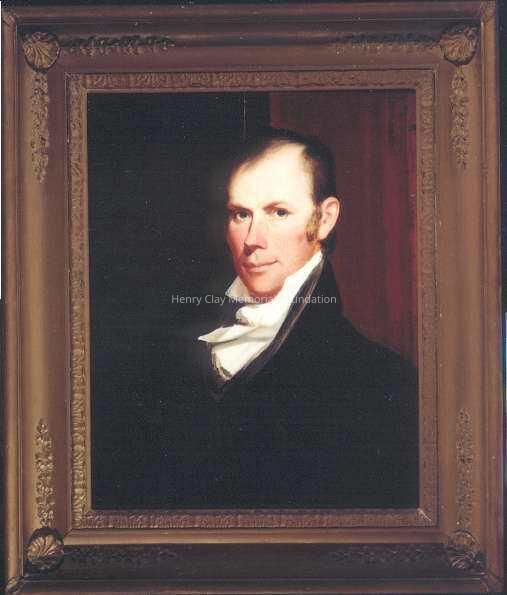 Bust portrait of Henry Clay, left 3/4 profile. Depicts a younger Henry Clay with brown hair slicked back, wearing a dark coat with a high collar and a white ruffled cravat. On back of panel in black paint or wash, barely visible, is insrcibed, "Portrait of / Henry Clay / by Jouett / Property of / Maj. H.C. McDowell / 'Ashland' / Lexington / Ky." Crack in board above forehead. Framed in gilt frame with florettes at corners.