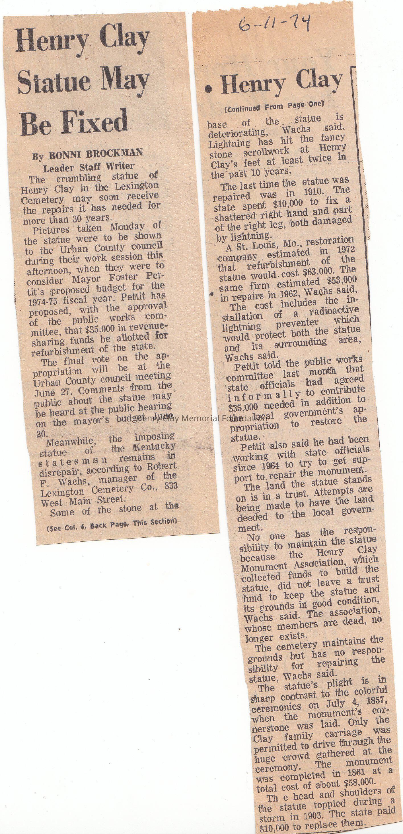 A small clipping in two parts by Bonni Brockman talks about how the statue of Henry Clay at the Lexington Cemetery may be fixed.