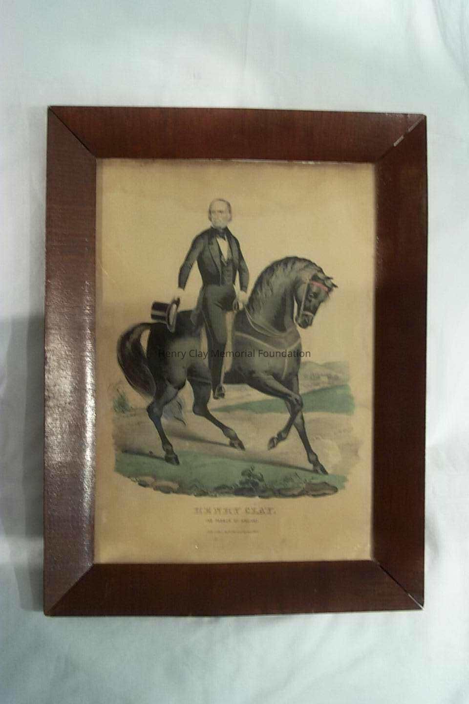 Colored lithograph depicting Henry Clay on horseback. Clay is shown in a dark suit holding a top hat in one hand and the reigns of the black horse in the other. Ashland is shown in the background on the right side of print. Printed below image: "HENRY CLAY. / THE FARMER OF ASHLAND. / Lith. & Pub. by N. Currier 2 Spruce St. N.Y." In plain mahogany frame with original glass.Dimensions