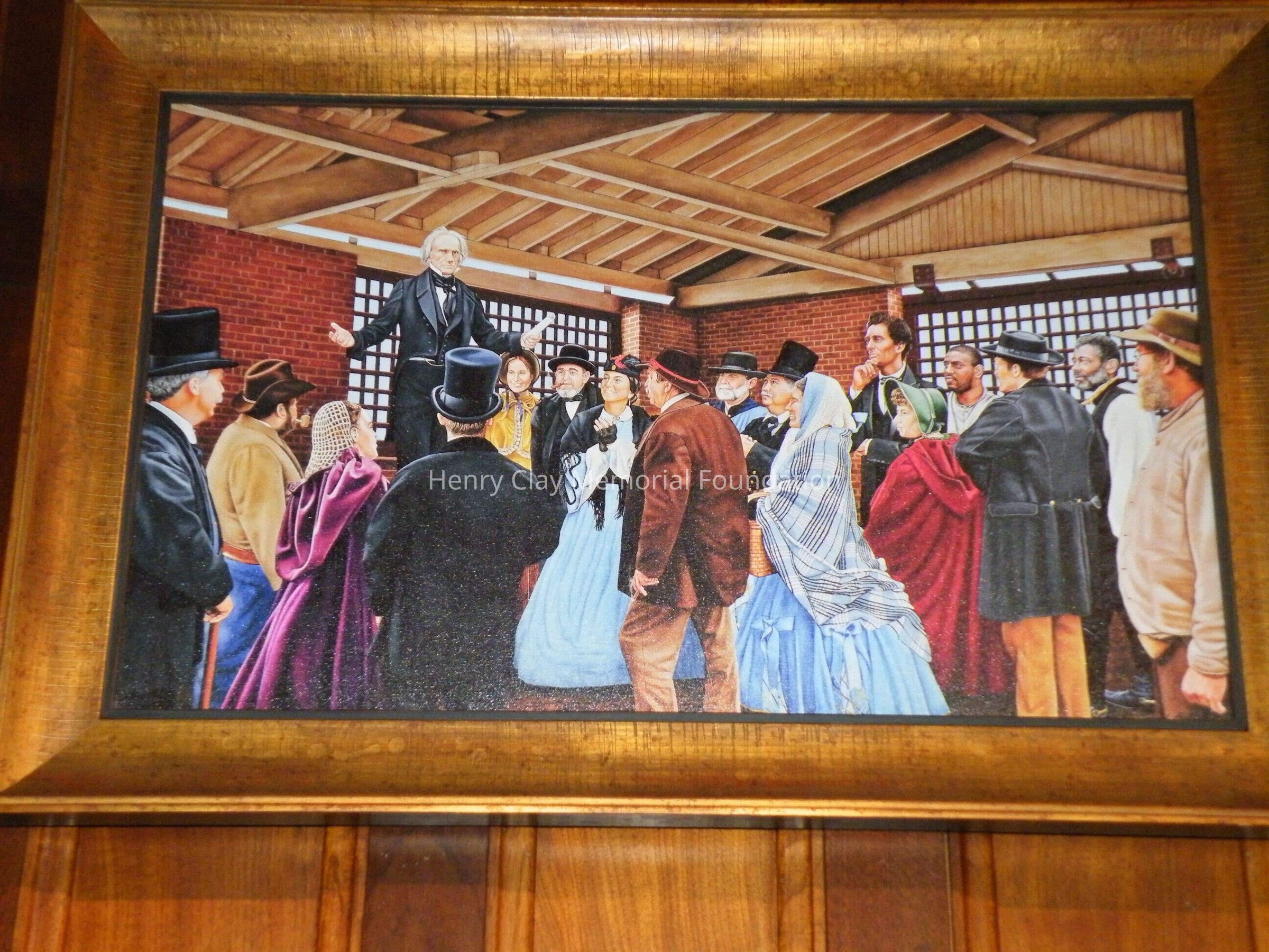 Giclee print reproduction of a painting of Henry Clay delivering a speech to a crowd of people including Abraham Lincoln in a warehouse. Lincoln is holding his chin in the right center. The lady next to him in the green bonnet may be Mary Todd Lincoln.Material