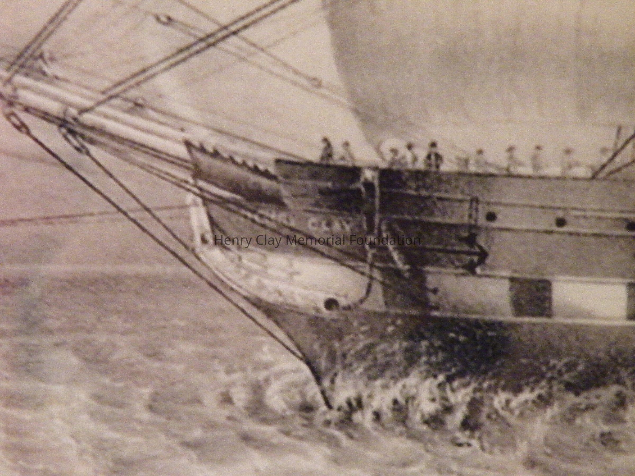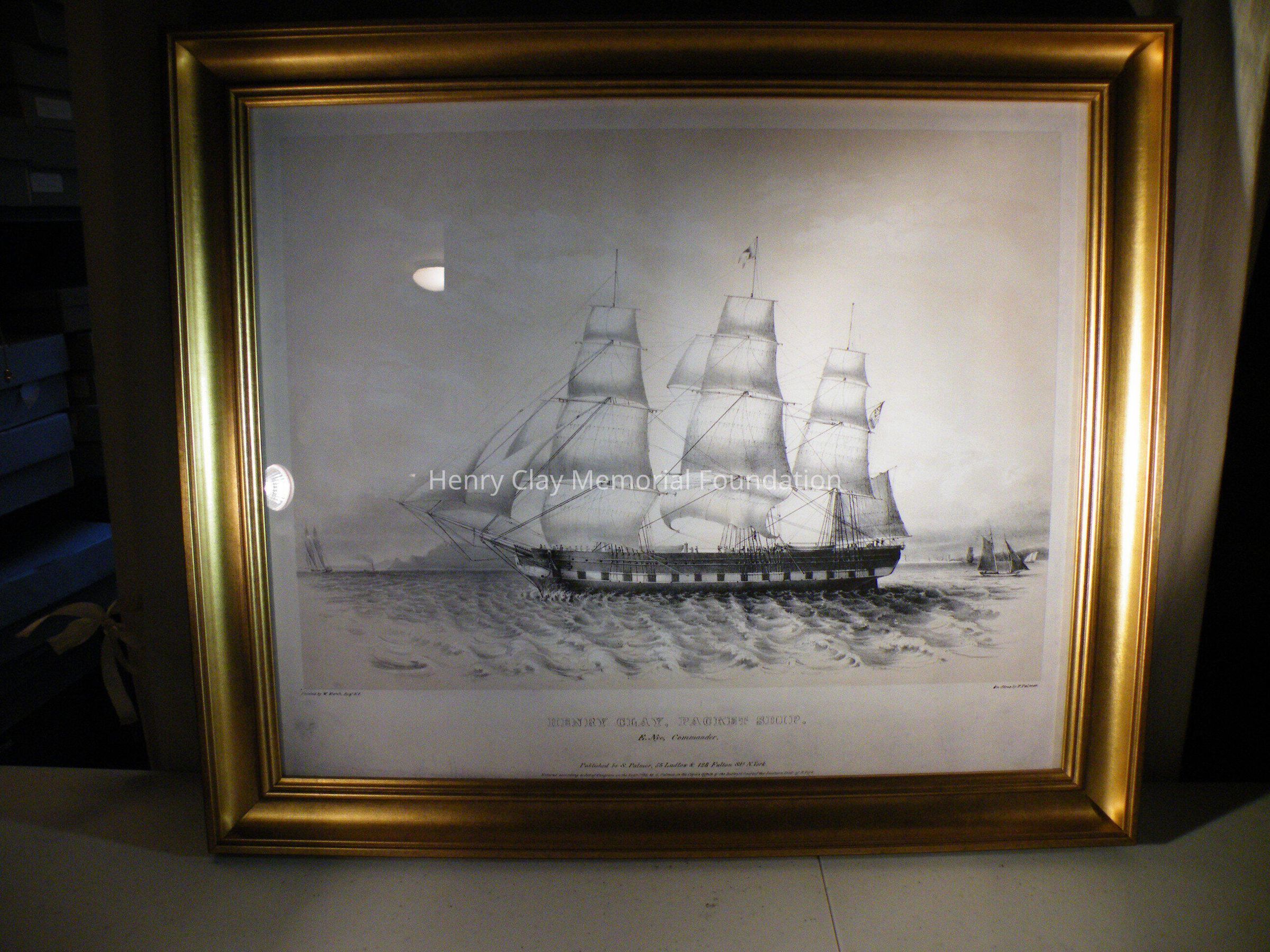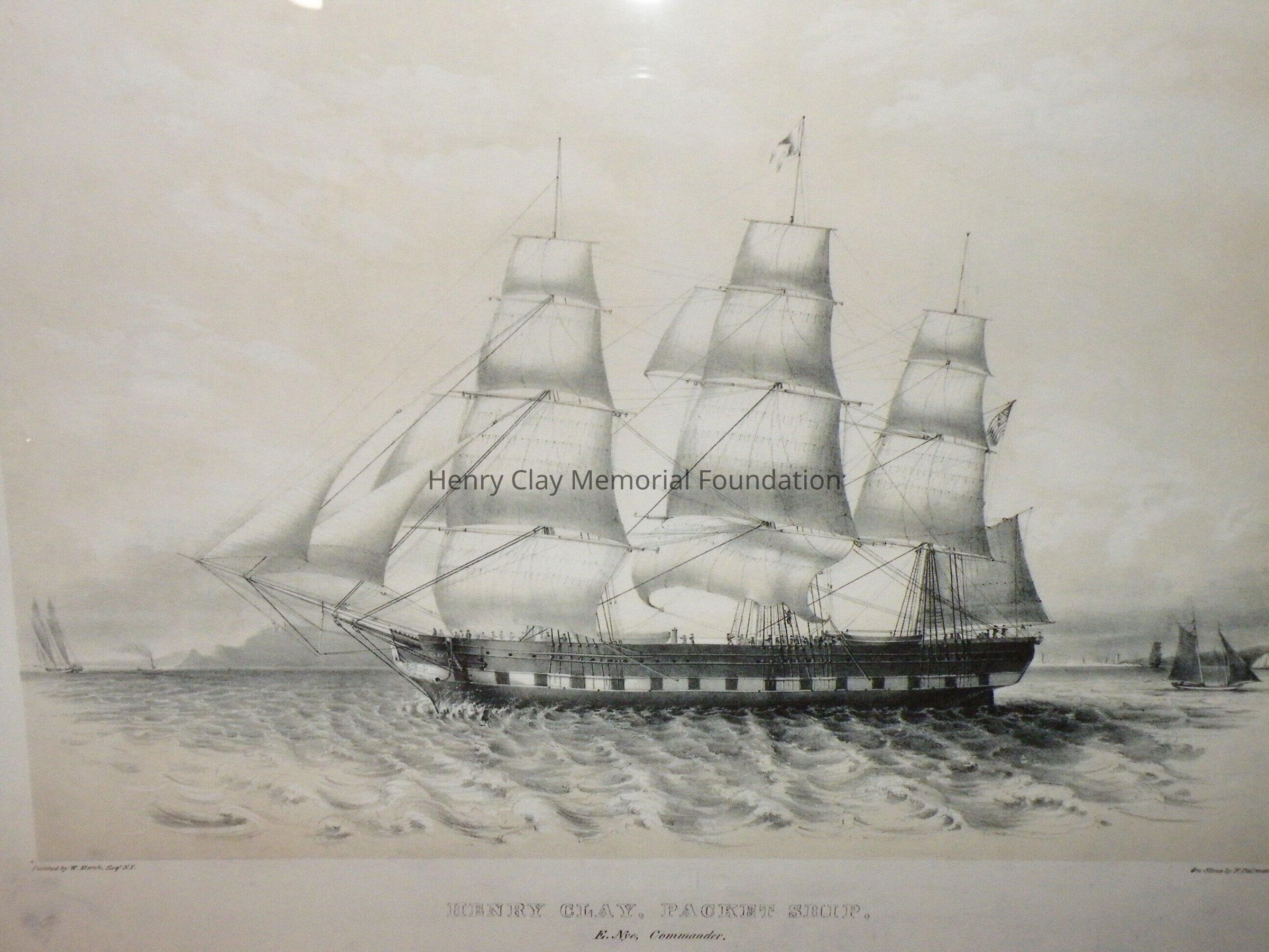 Reproduction of a lithograph of the packet ship Henry Clay. The ship is a three-masted vessel in full sail with other boats around it and a coastline in the background. The ship has people on deck. There is a pennant atop the amin mast and the American flag flies from the stern mast. The name Henry Clay appears on the fore hull of the ship. Beneath the image is the title: "Henry Clay Packet Ship E. Nye Commander." At the bottom center is the legend: "Published by S. Palmer, 55 Ludlow & 128 Fulton St. N. York." At the very bottom is the copyright: "Entered according to act of Congress in the year 1845 by S. Palmer in the clerk's office of the District Court of the Southern Dist. of N. York." In the lower left corner is the artist's name and in the lower right is the engraver.Dimensions