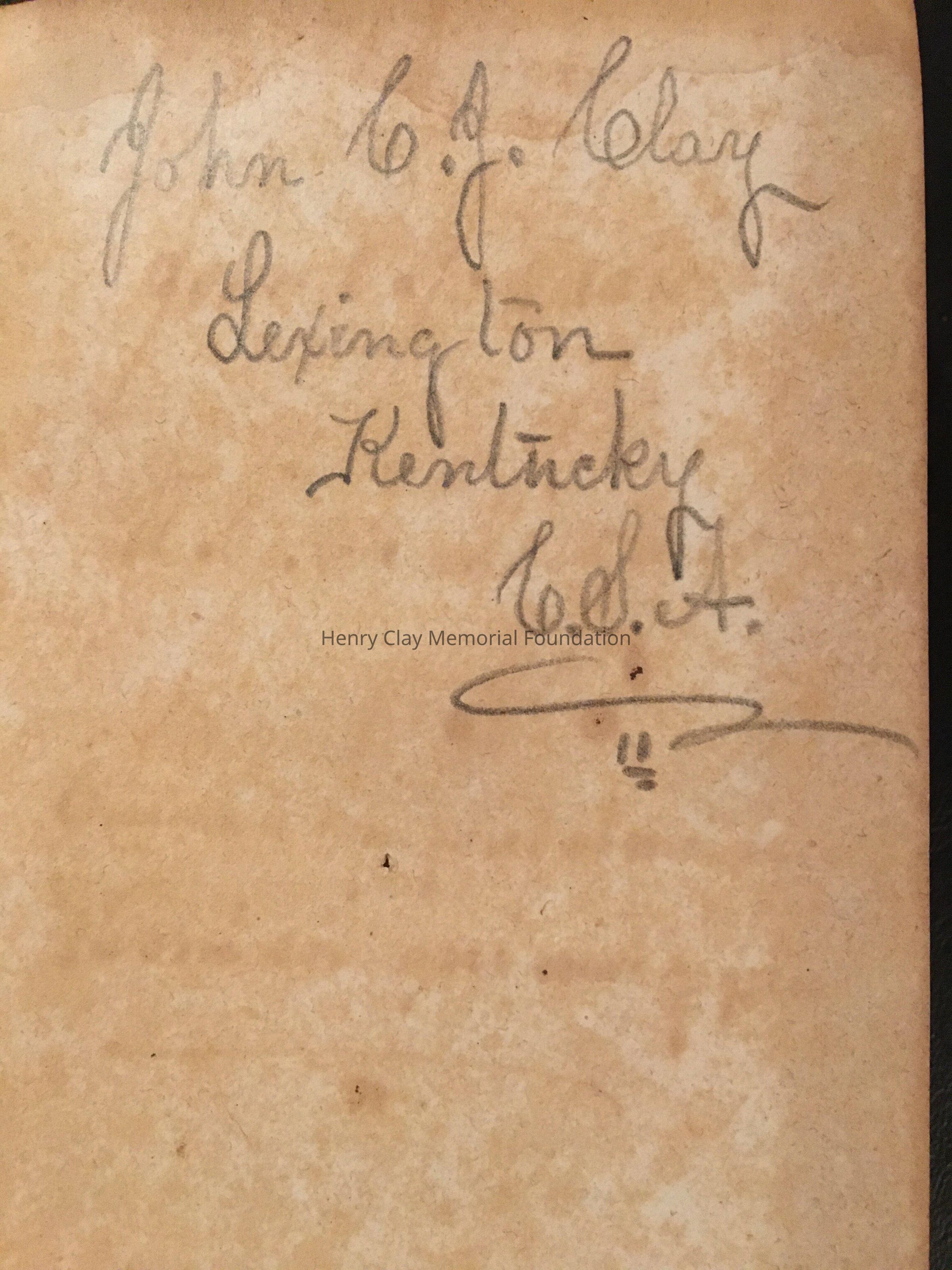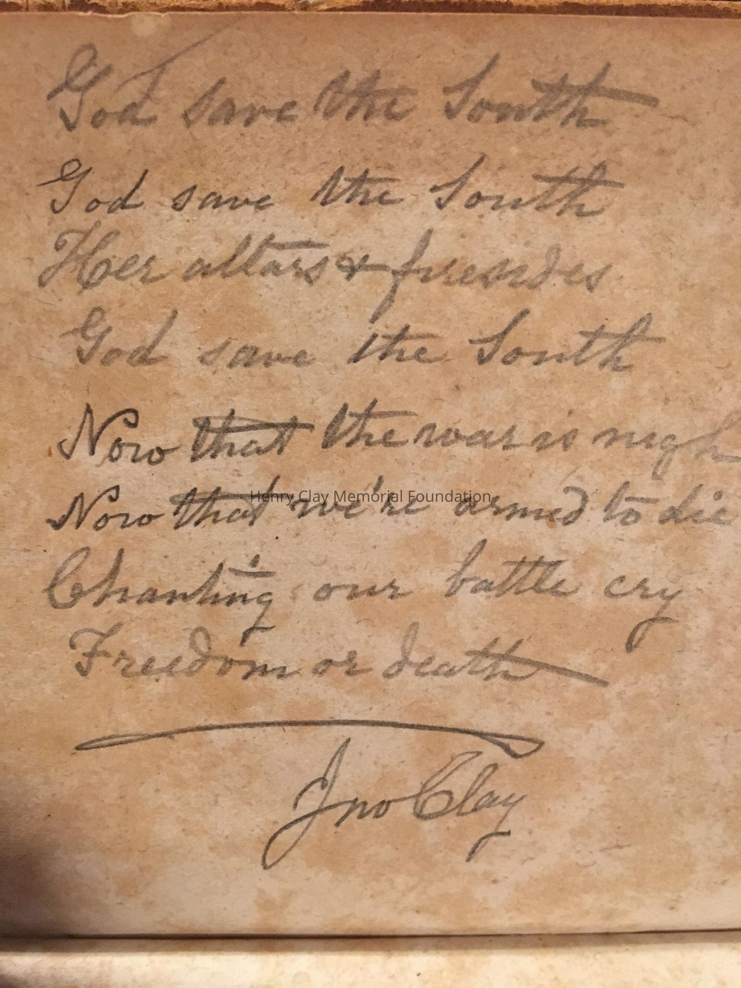 History book about Charles XII. Inside various notes in pencil and pen. Written in pen is John C.J.Clay name and also in pencil John C.J.Clay Lexington Kentucky C.S.A. In the rear a poem "God save the south, God save the south, He alter and tireside, God saves the south, now that the war is night, now that we're armed to die, Chanting our battle cry, "Freedom or death". John C.J.Clay. Small, leather bound, side is off, back cover is detached.