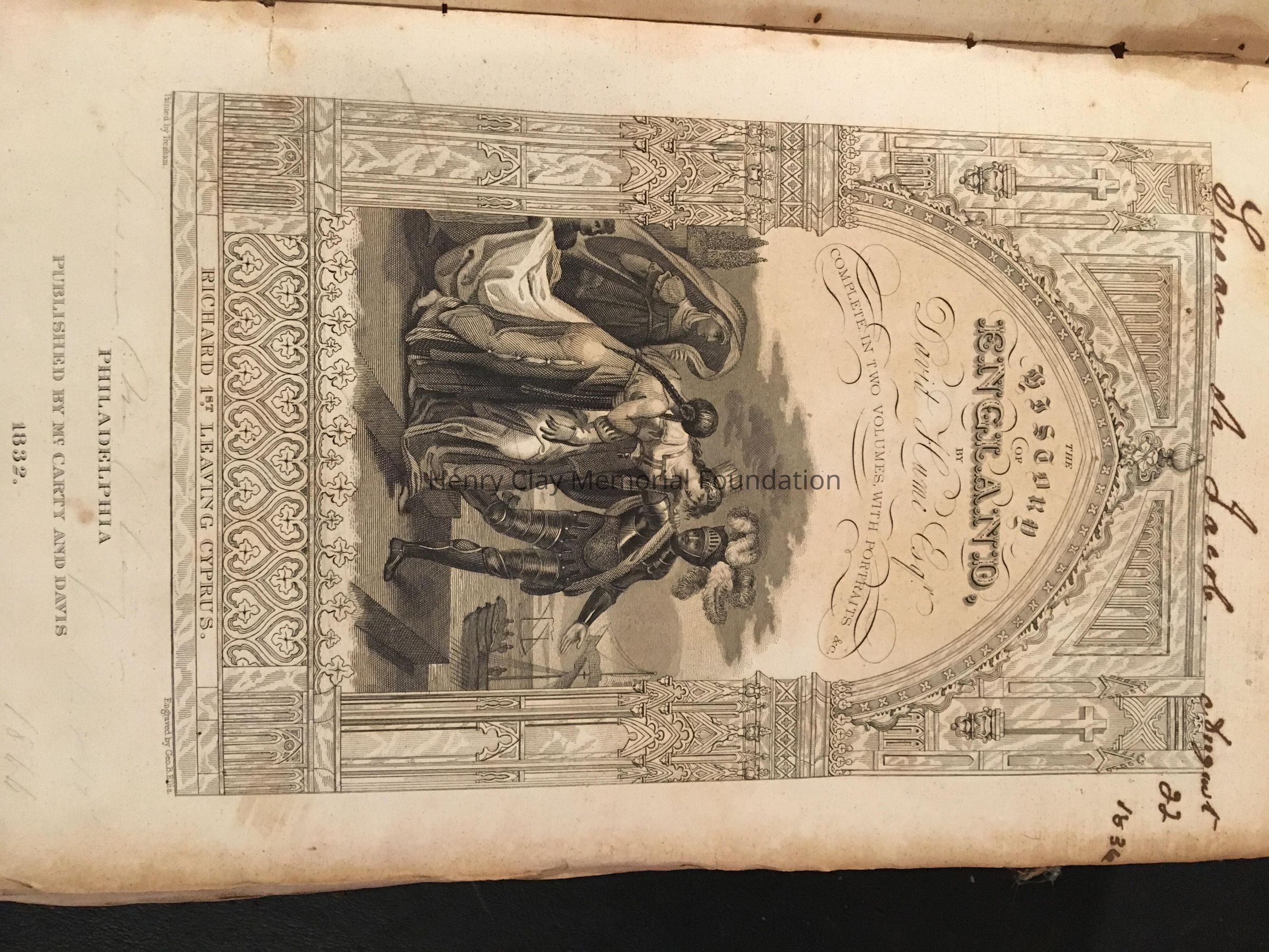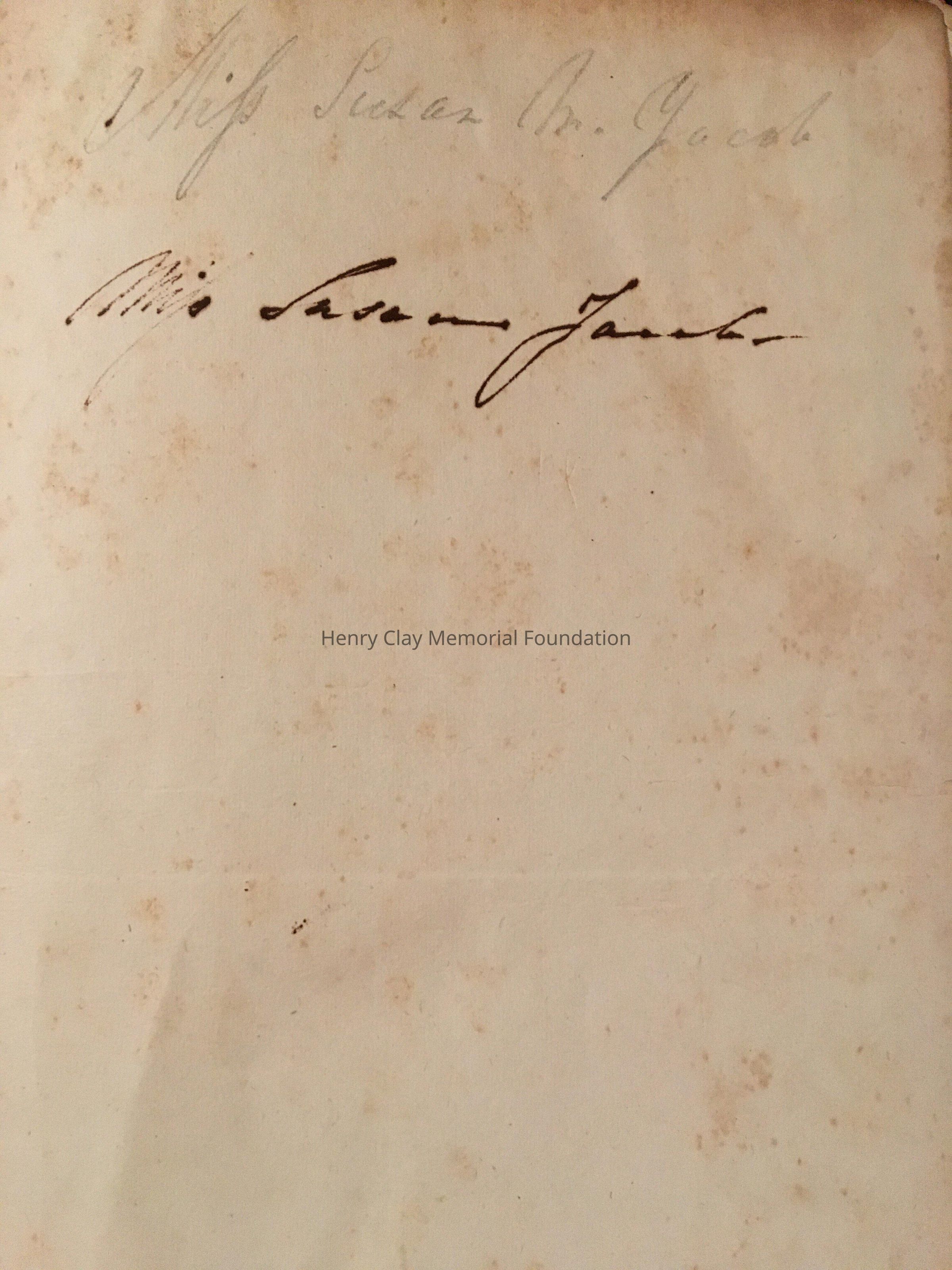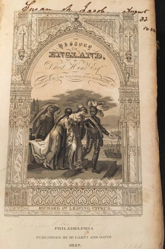 Hstory of England. Inside the front cover there is "Miss Susan M.Jacob" in penicl, and "Miss Susan Jacob in ink". Also on the title page above etching is "Susan M. Jacob August 22 1836" and under the drawing in pencil " Susan M.Clay in ? 14th 1844 or 1866", inside above the Advertisement in pencil " Susan Maria Jacob, louisville, Ky"