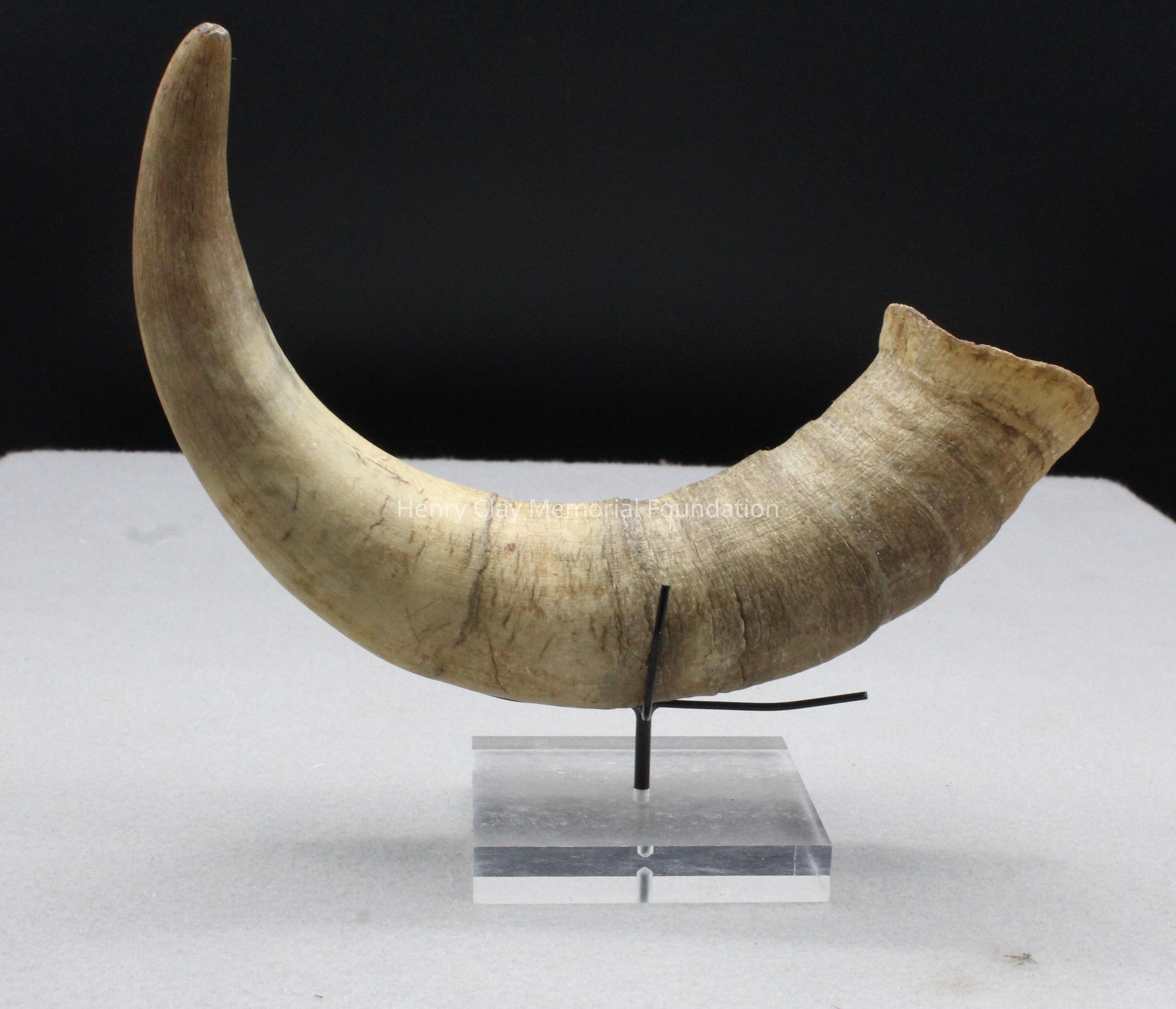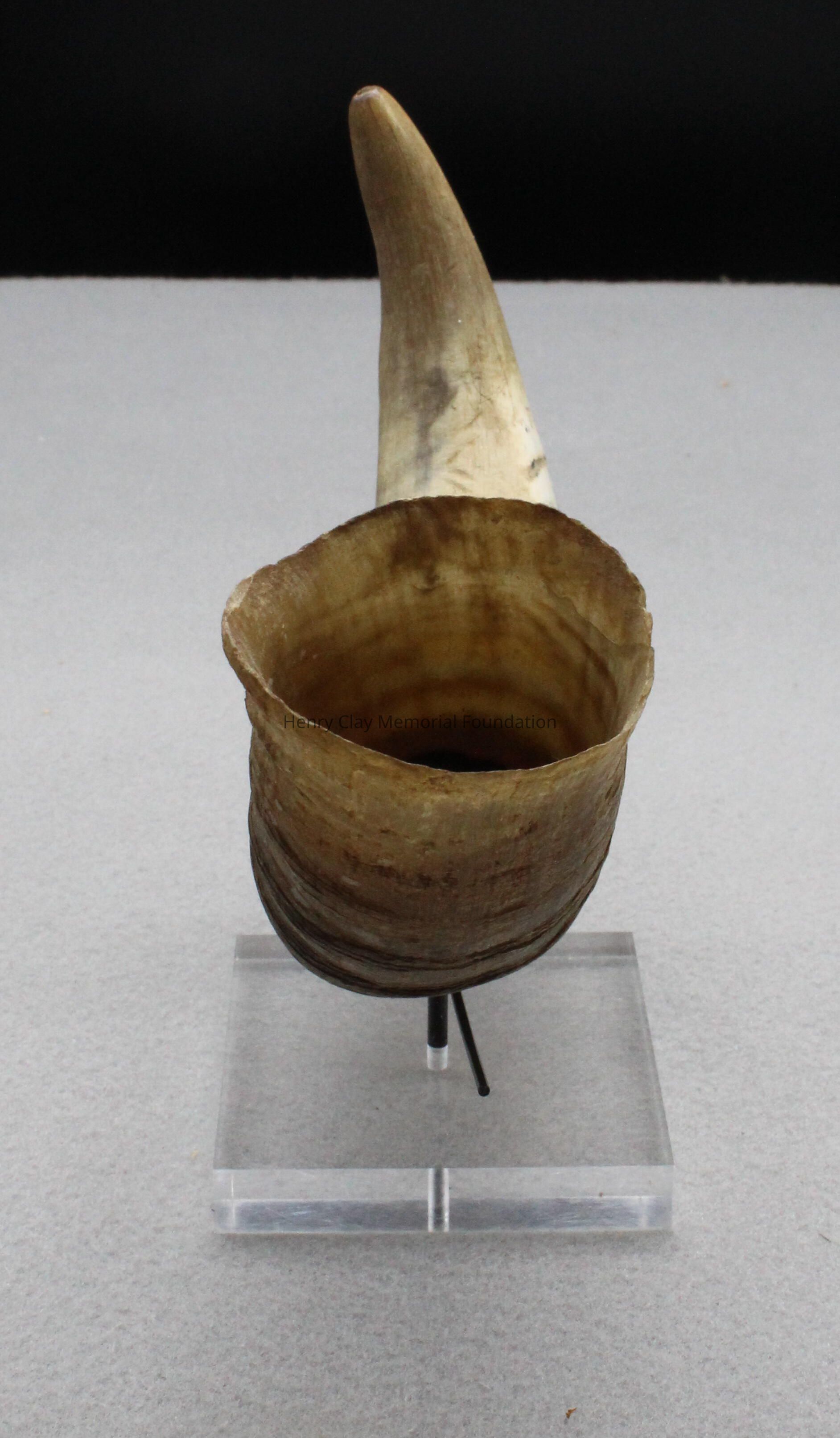 Tan-colored, curved, hollow animal horn. Smooth at pointed end, ridged toward the base.
