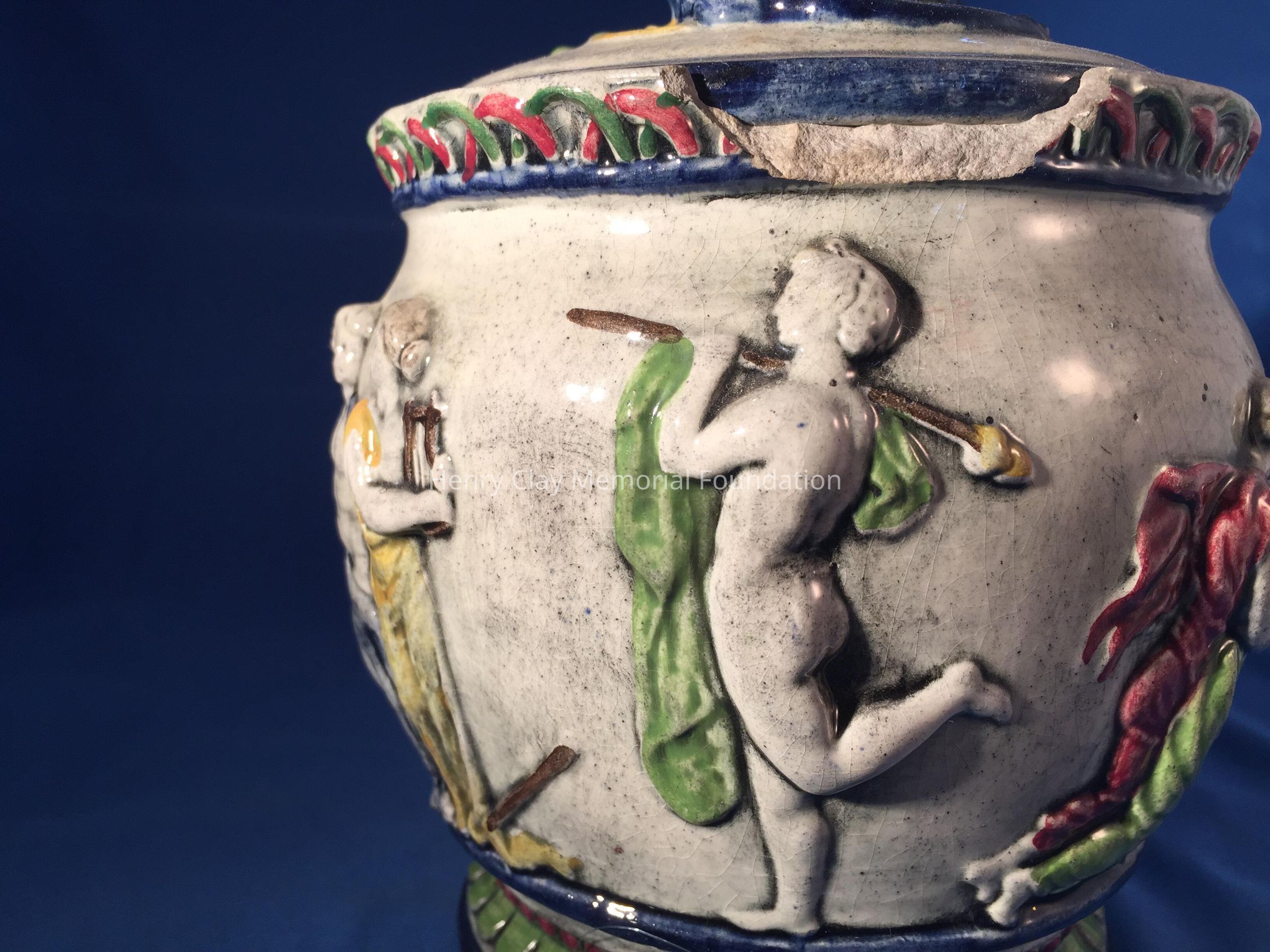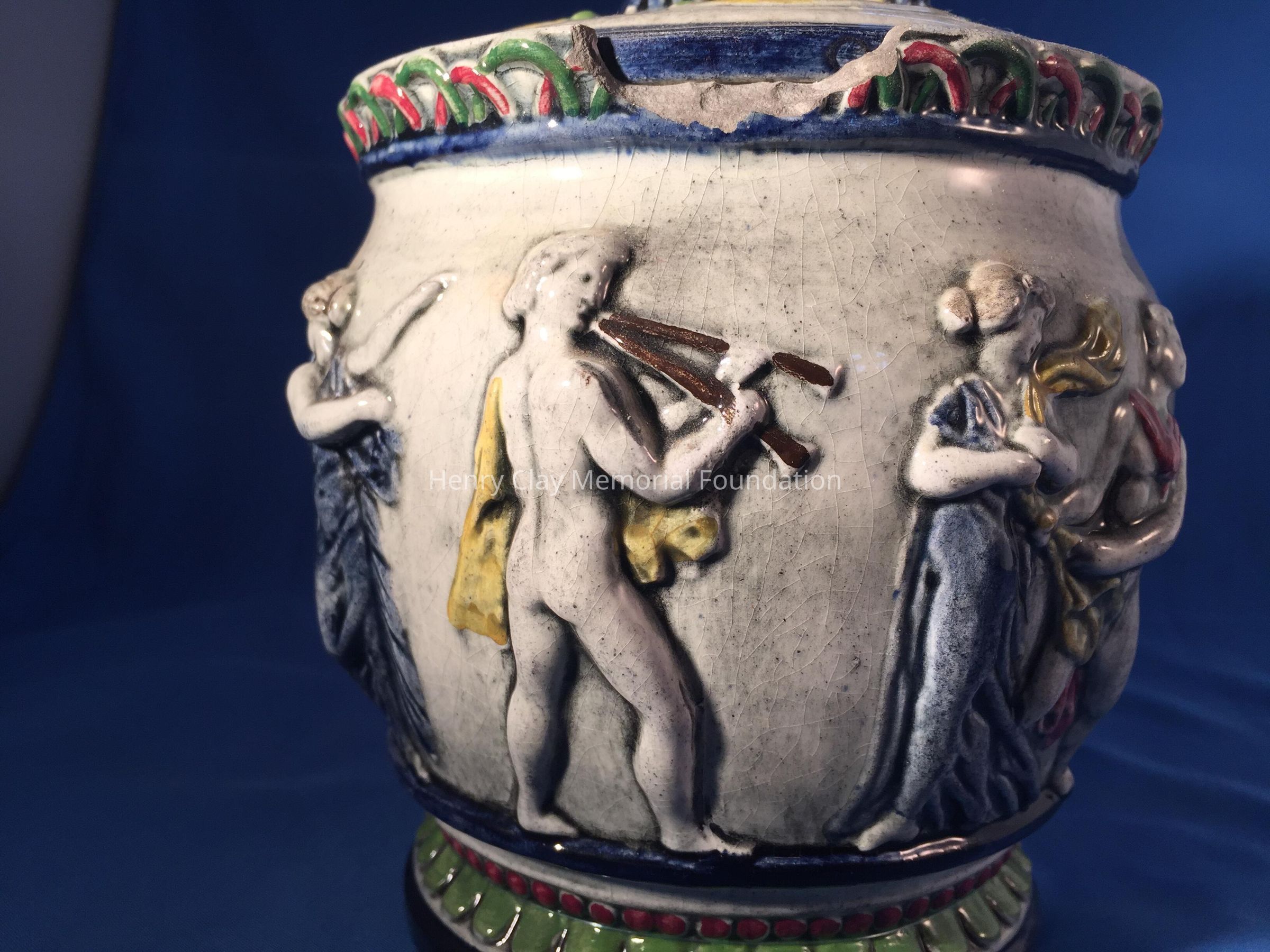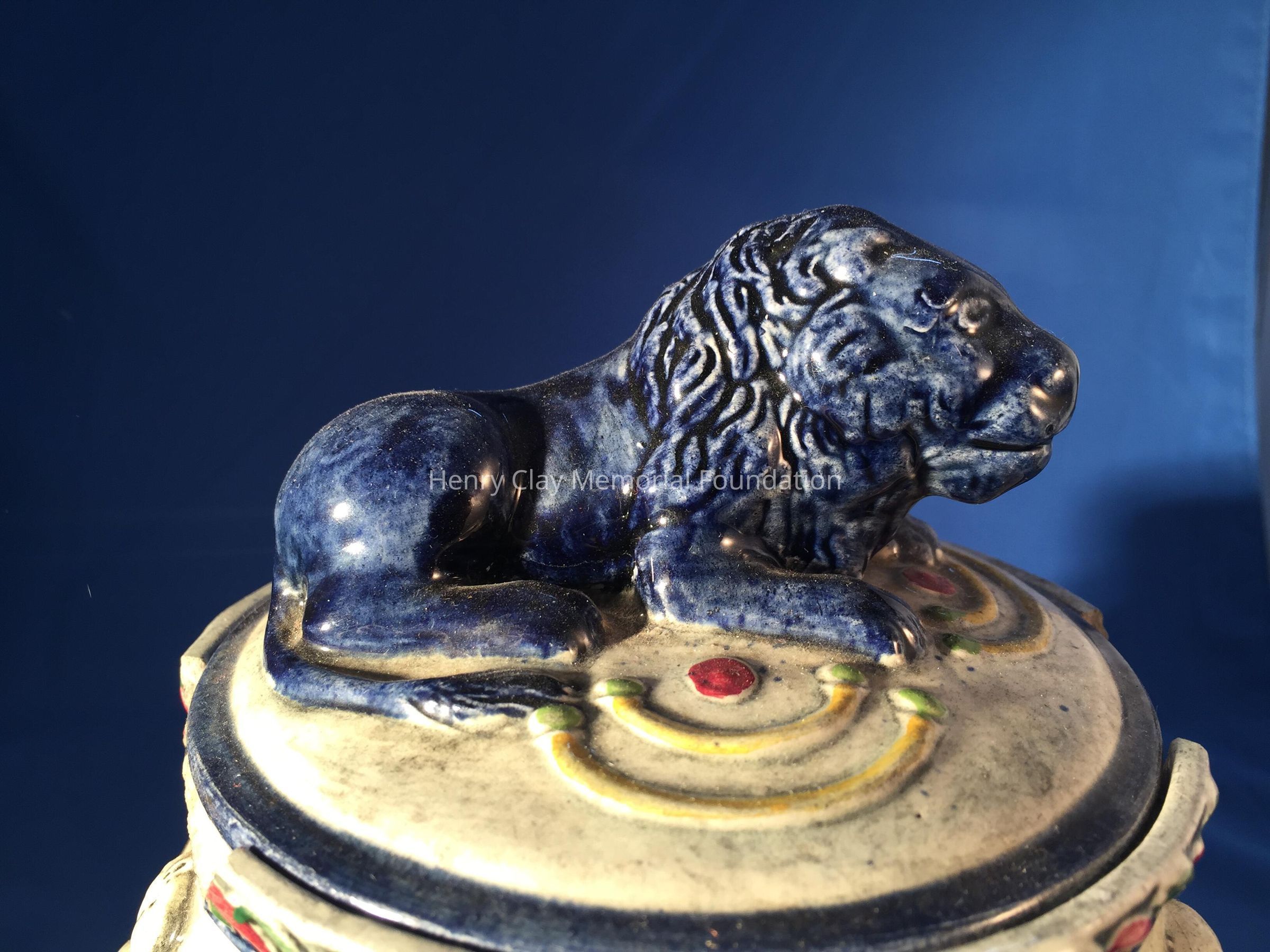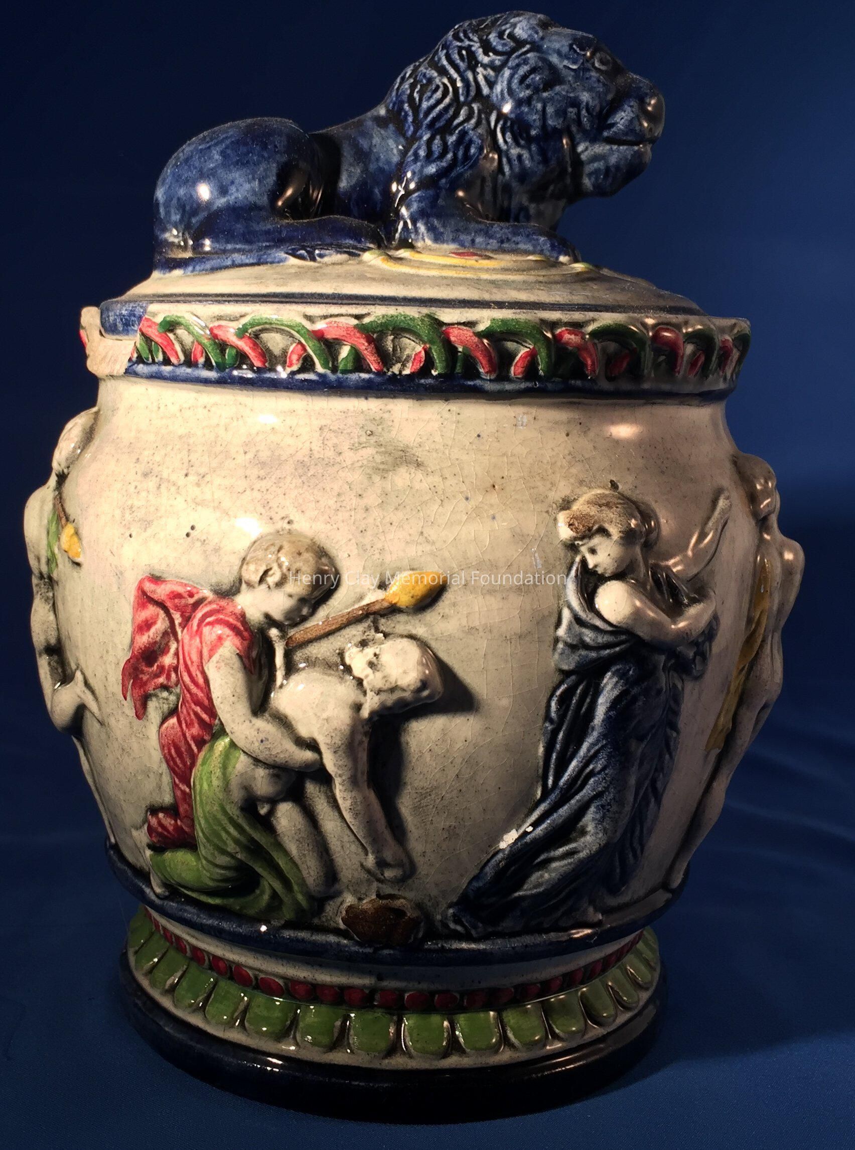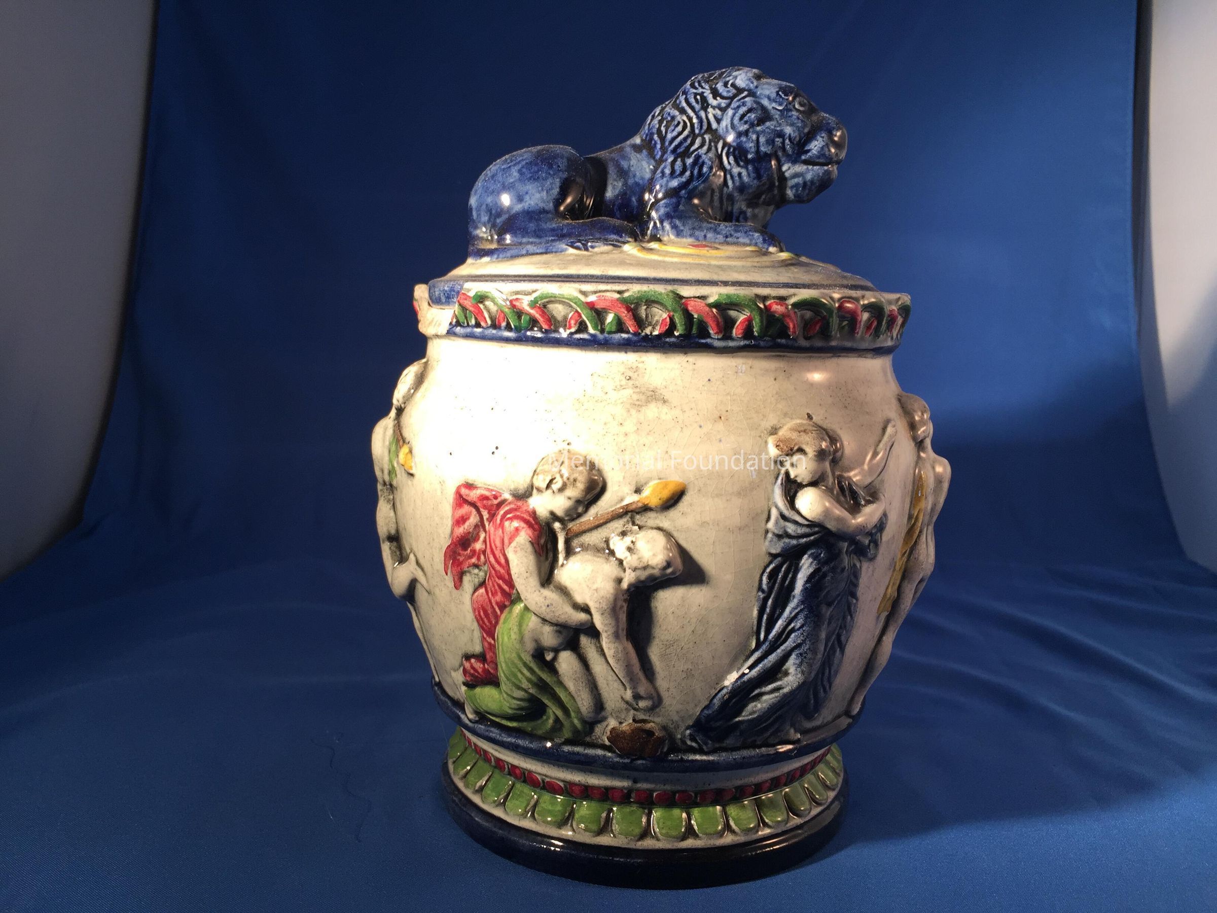 Austrian pottery bowl surrounded with classical figures. Top surmounted by a blue lion. Bottom of bowl has "Venezia" in black, "Austria," and "2645" impressed, along with china mark and house china marks shown on catalog sheet.