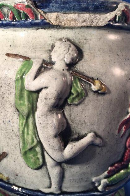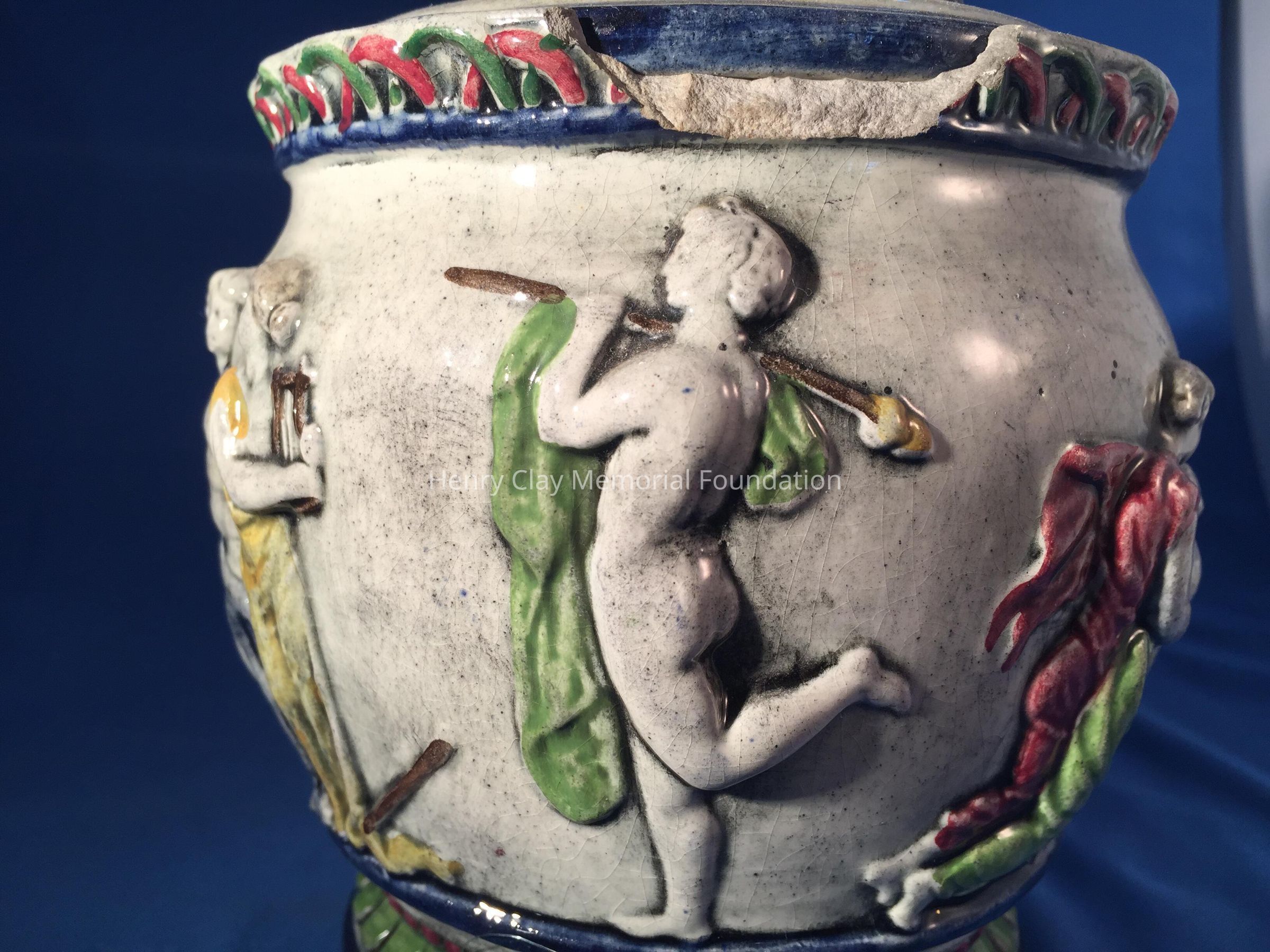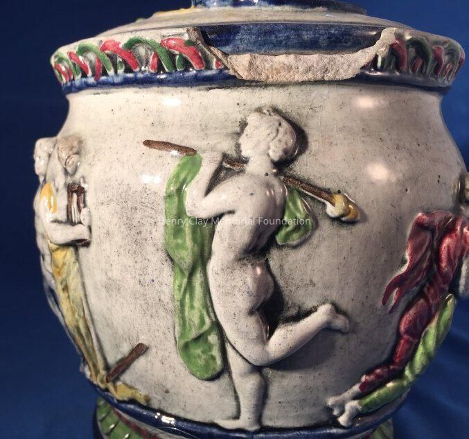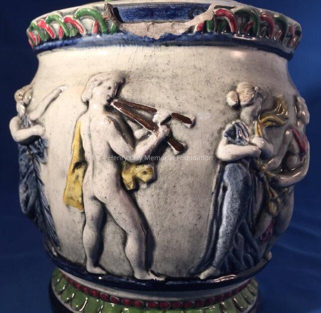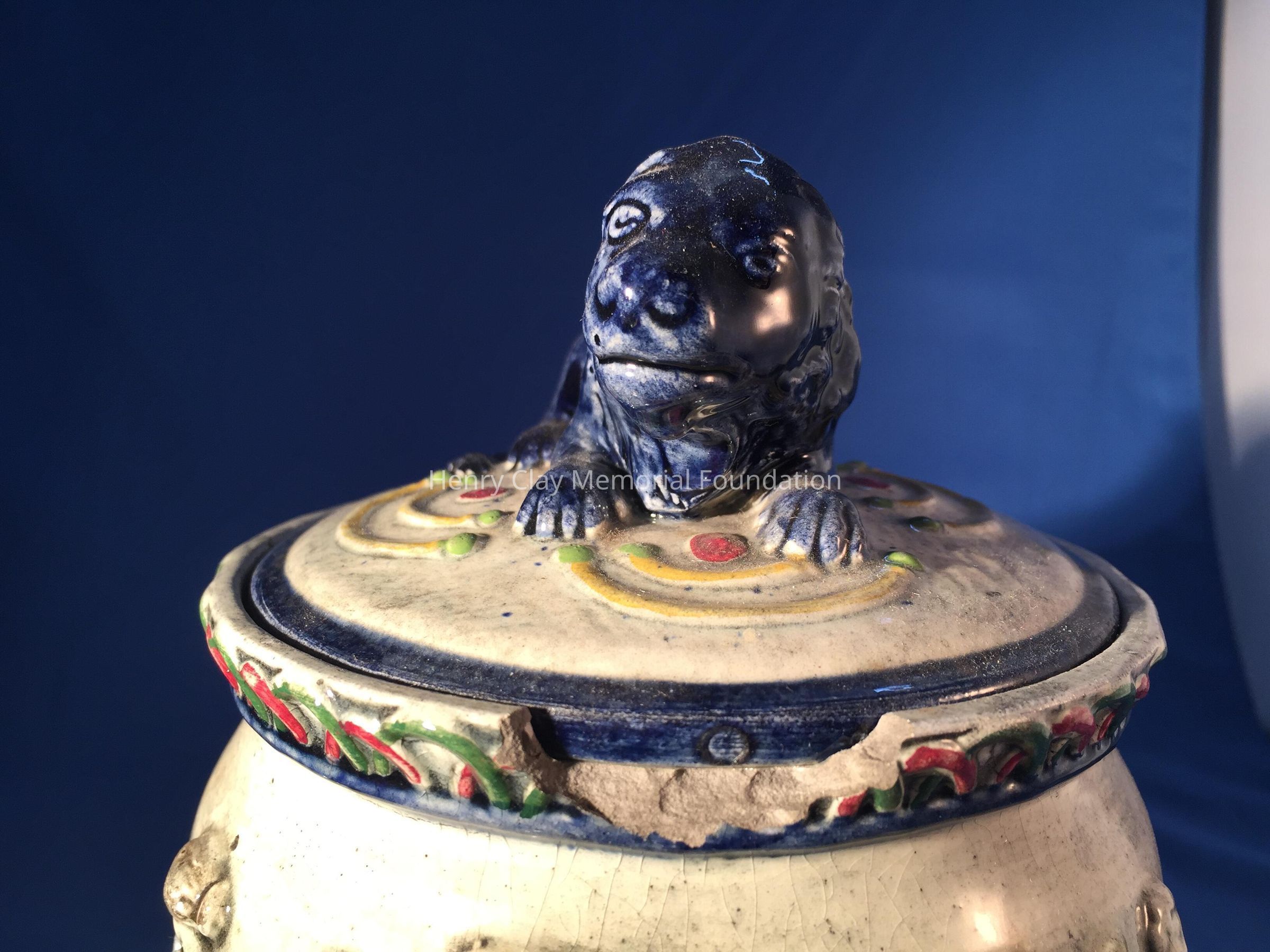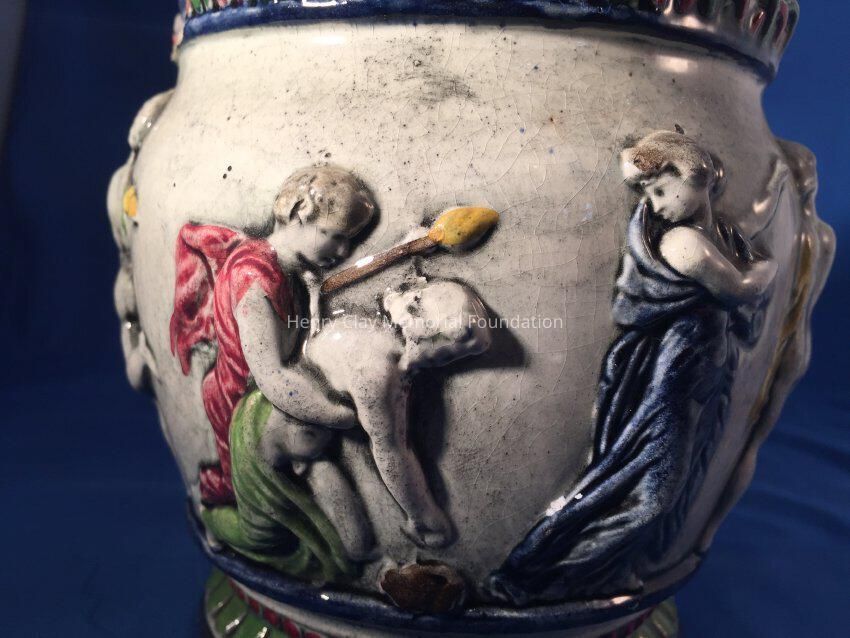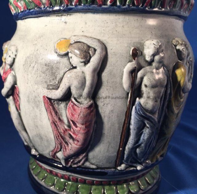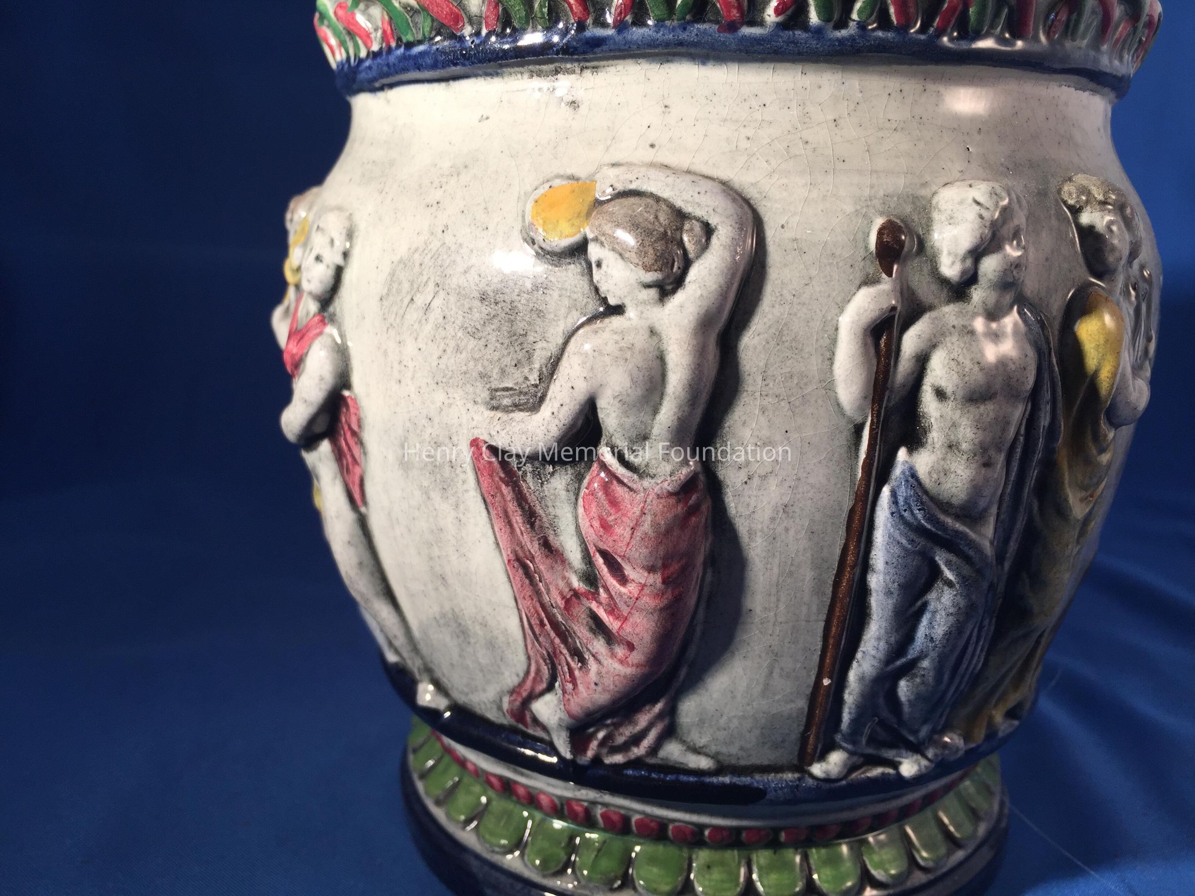 Austrian pottery bowl surrounded with classical figures. Top surmounted by a blue lion. Bottom of bowl has "Venezia" in black, "Austria," and "2645" impressed, along with china mark and house china marks shown on catalog sheet.