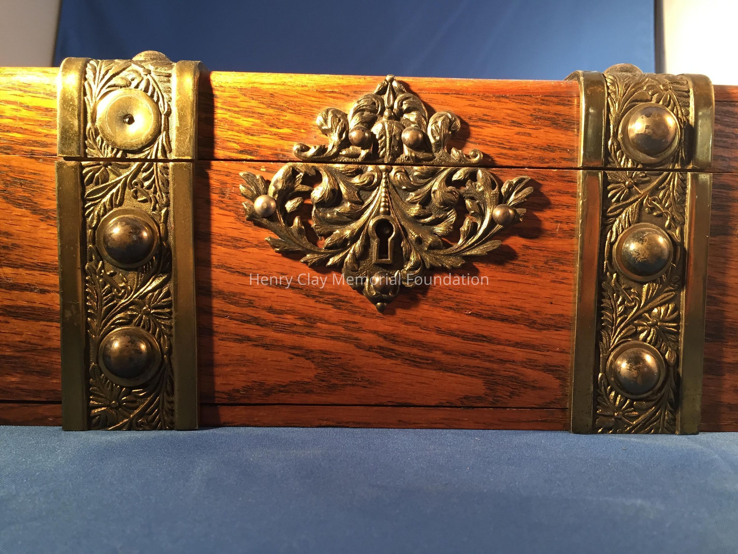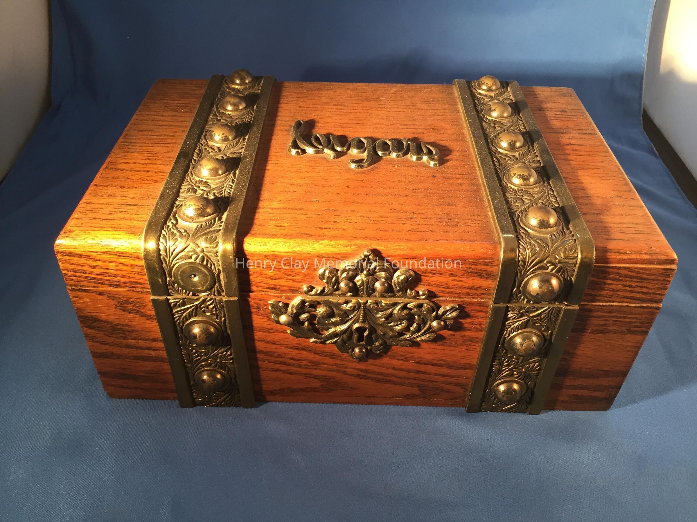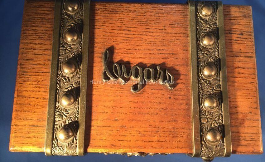Wooden box with hinged lid and lock. "Cigars" is written on top of box in metal. There are two metal bands that wrap around top of box. Bands have beaded studs on them. Inside is lined with metal (tin?) with a pierced removable piece in back. Top inside of lid is also pierced with decorations.Dimensions