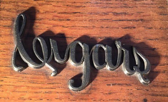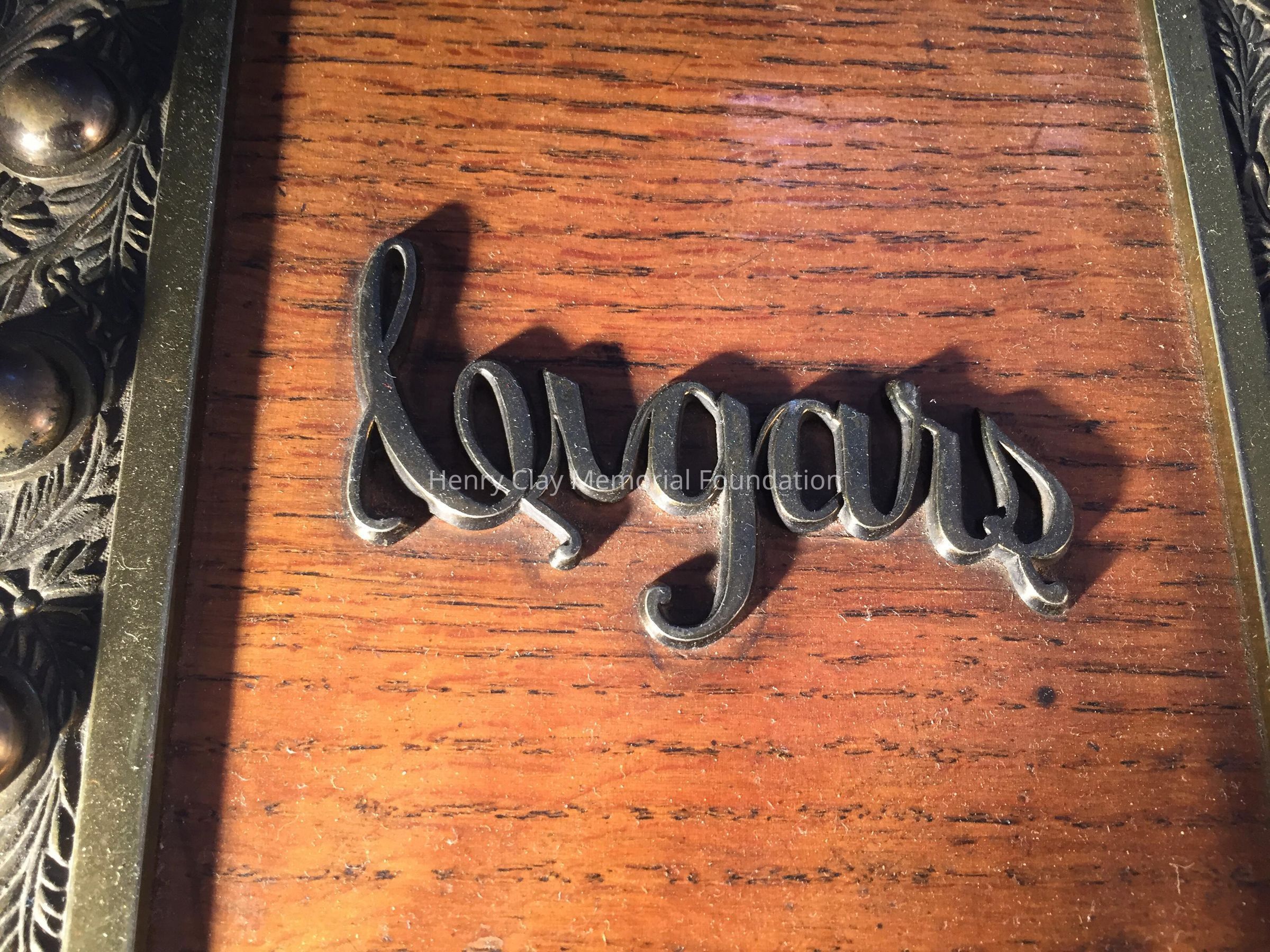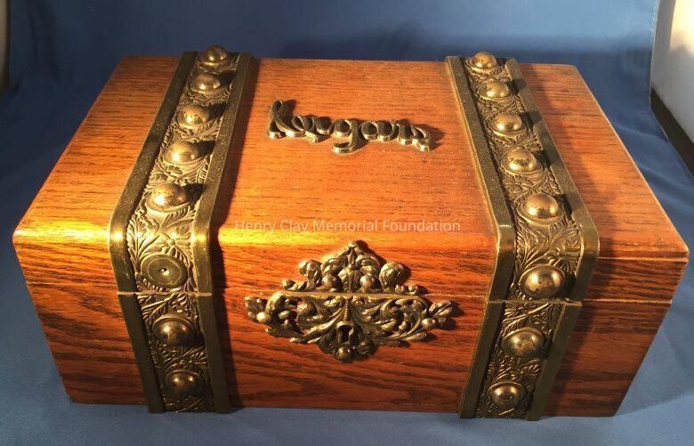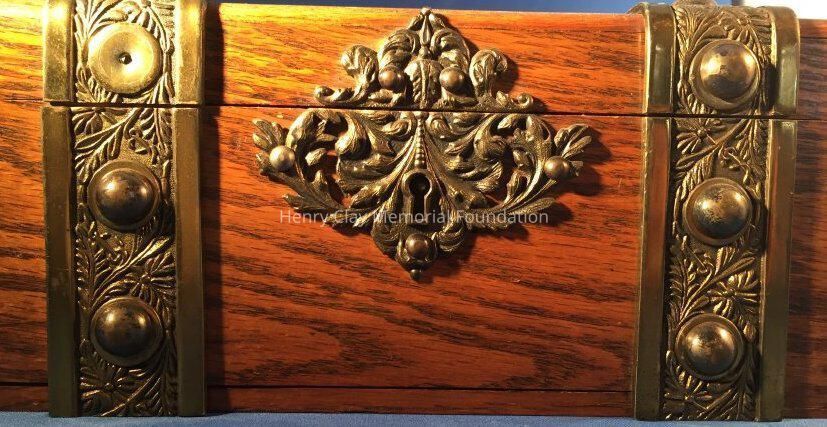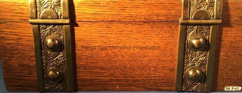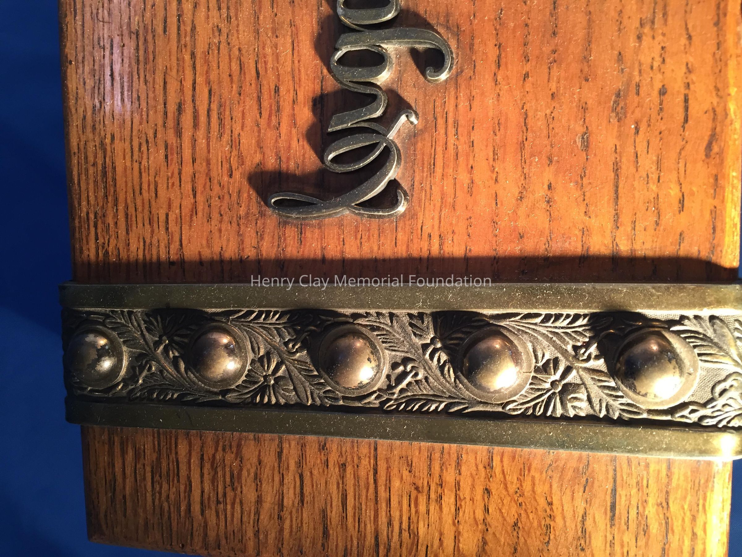 Wooden box with hinged lid and lock. "Cigars" is written on top of box in metal. There are two metal bands that wrap around top of box. Bands have beaded studs on them. Inside is lined with metal (tin?) with a pierced removable piece in back. Top inside of lid is also pierced with decorations.Dimensions