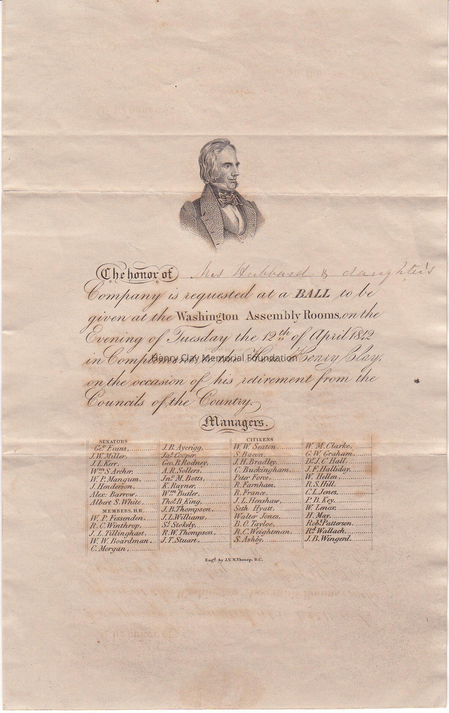 An invitation to a ball given in honor of the retirement of Henry Clay from the Senate on April 12, 1842 in Washington, DC.