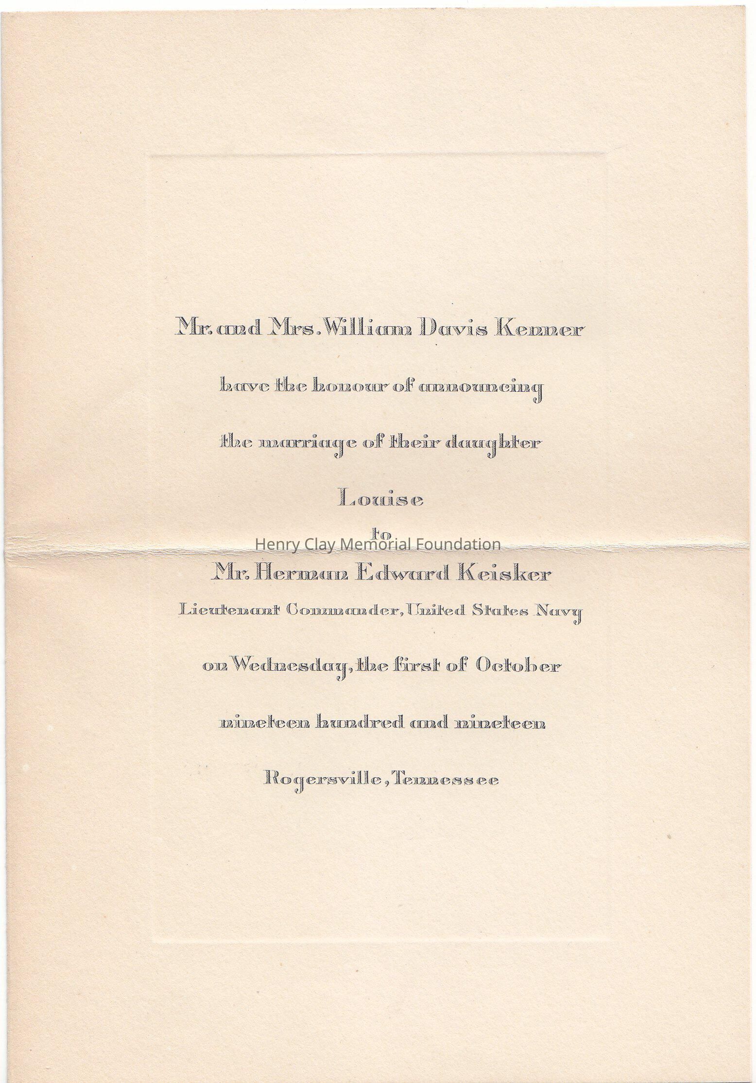 wedding invitation from Mr and Mrs. William Davis Kenner daughter's Louise wedding to Mr. Herman Edward Keisker, Lieutenant Commander United States Navy, on Wednesday, the first of October 1919 Rogersville, Tennessee.