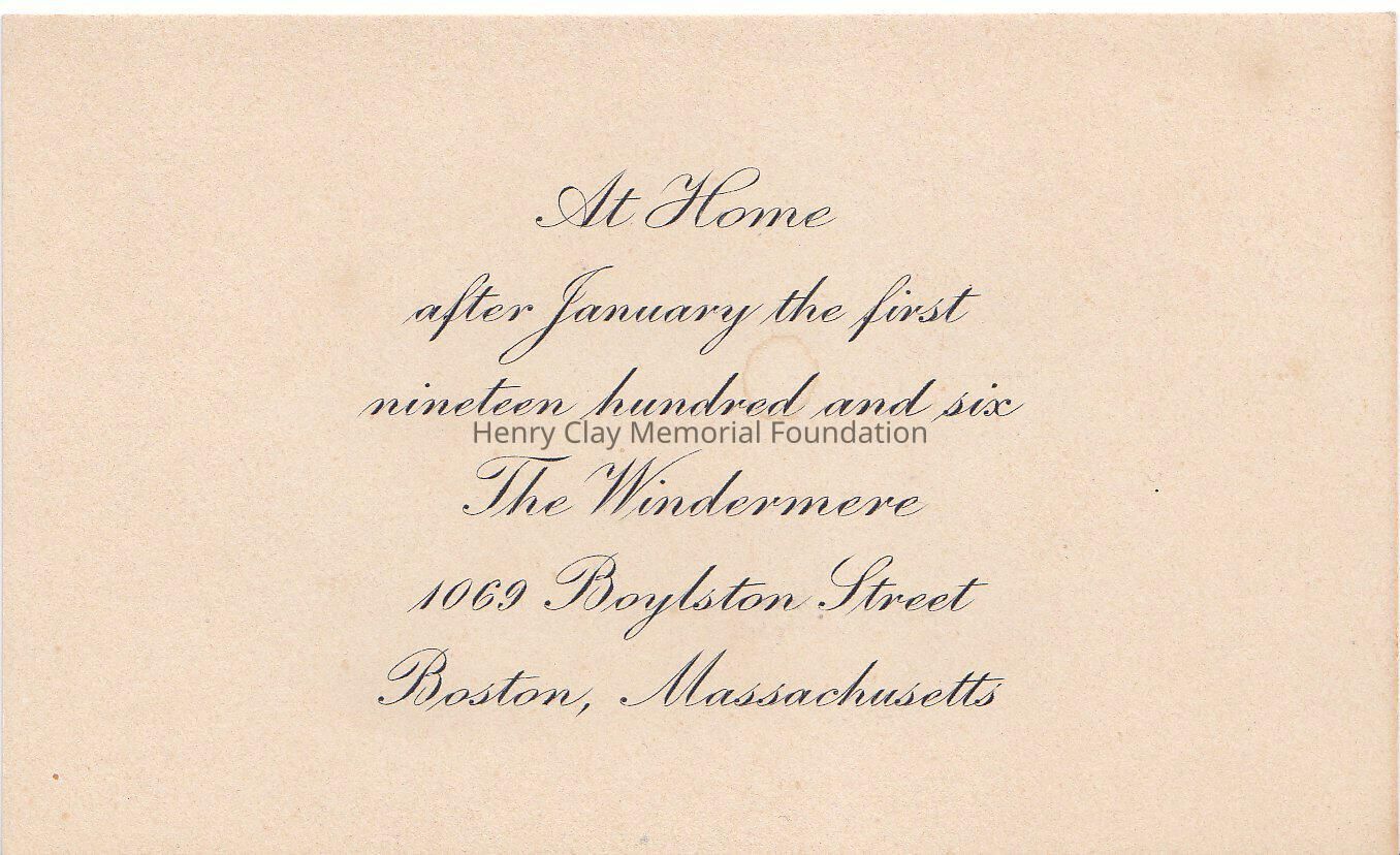 B: a small card with their adress " At Home after January the first 1906 The Windermere 1069 Boylston Street, Boston, Massachussetts.