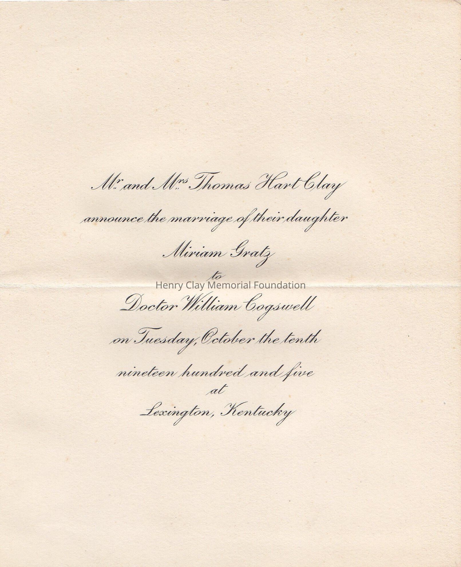 A: Wedding invitation of Miriam Gratz, Thomas Hart Clay daughter, to Doctor William Cogswell on Tuesday October the 10th 1905 in Lexington Kentucky,
