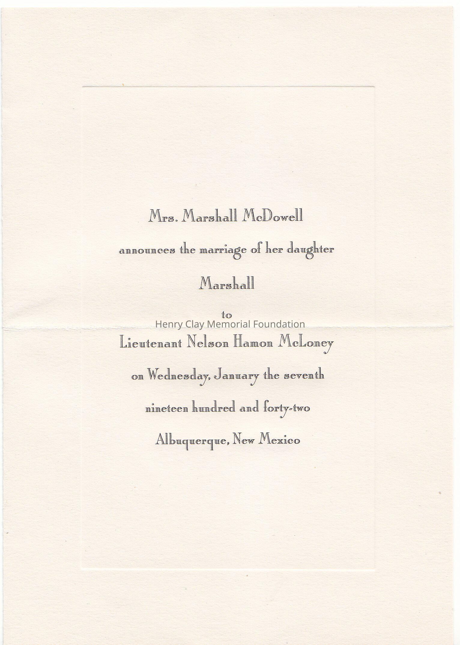 A: Mrs. Marshall McDowell announces marriage of her daughter Mashall to Lieutenant Nelson Hamon McLoney on Wednesday, January the 7th 1942, Alburquerque, New Mexico B: An envelope with "Mrs.Bullock and Mr.Bullock" on it