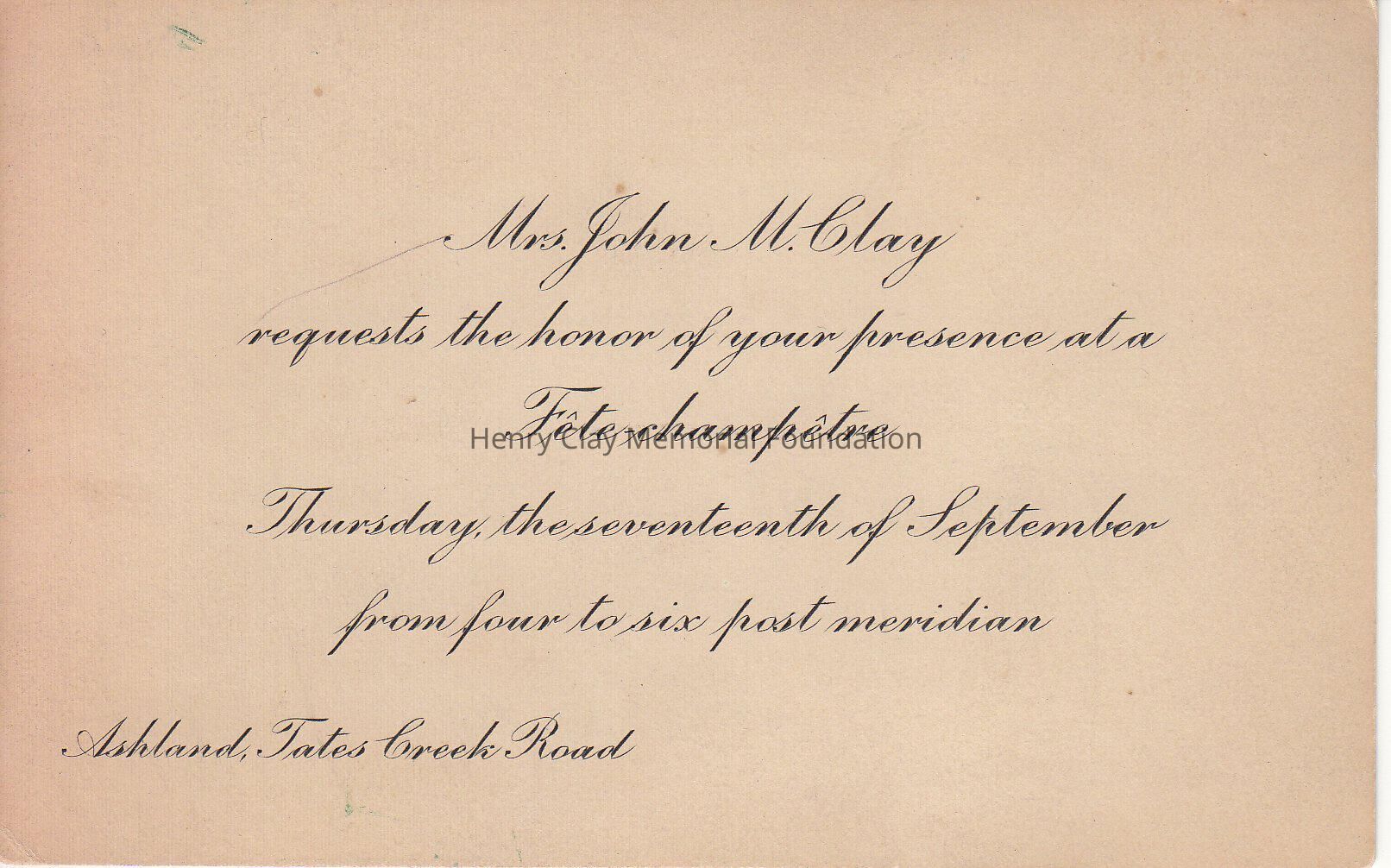 An invitation to a party thrown by John M. Clay at Ashland on Tates Creek