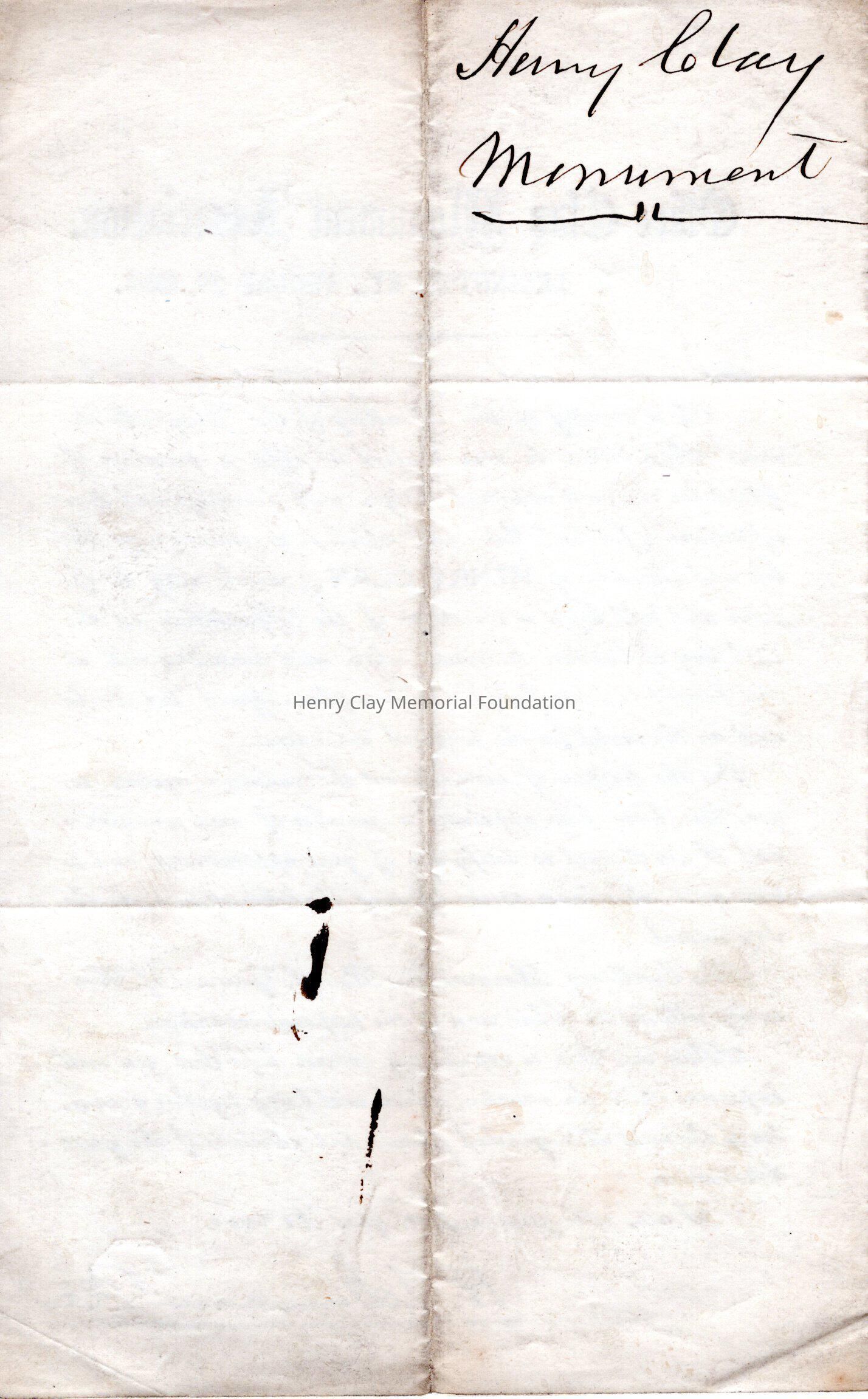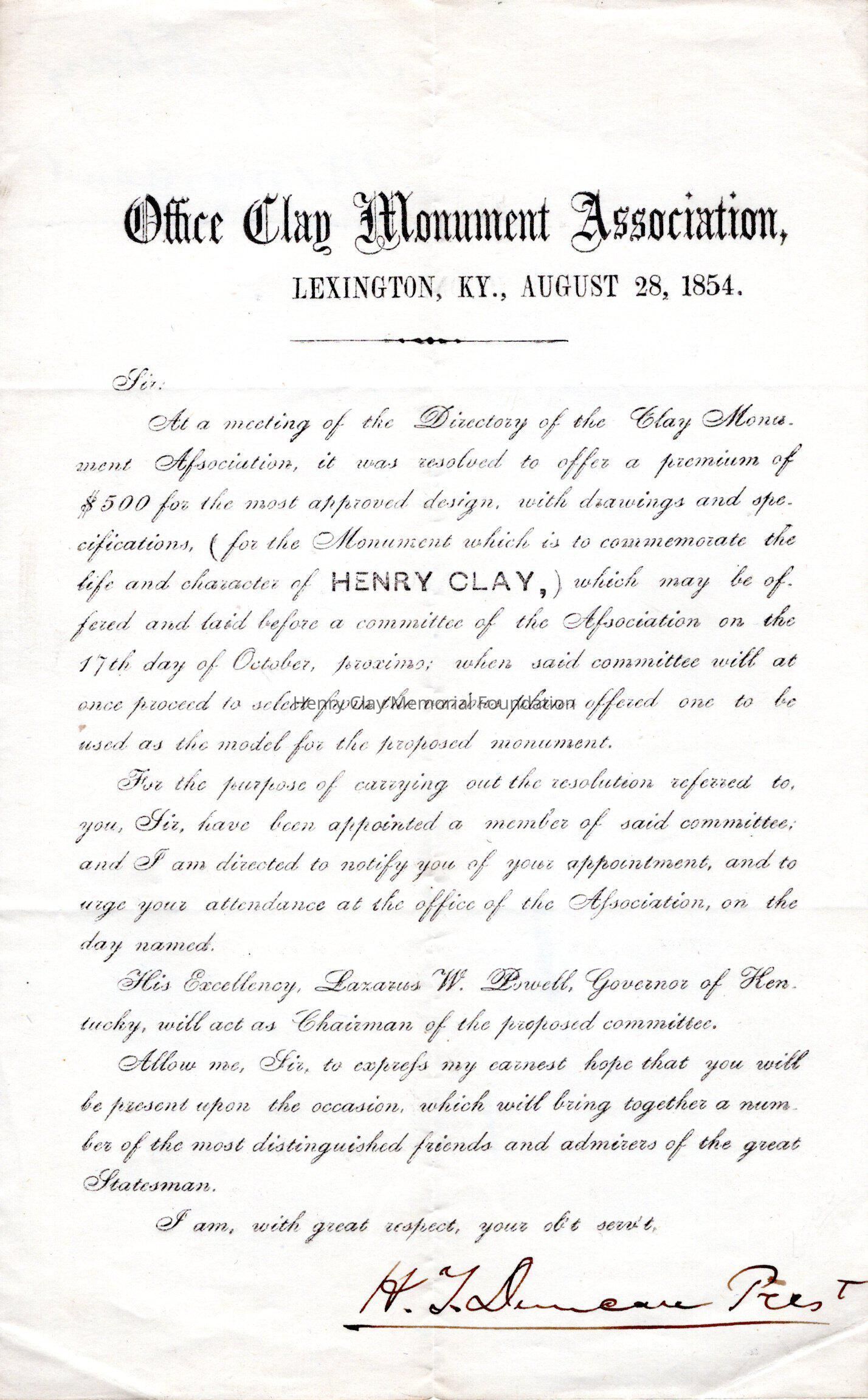 1 letter informing recipient of appointment to commission of the Henry Clay Monument Association to select design for monument and tomb of Henry Clay and inviting recipient to meeting where selection will take place on 10/17/1854. Signed by HCMA president Henry T. Duncan.