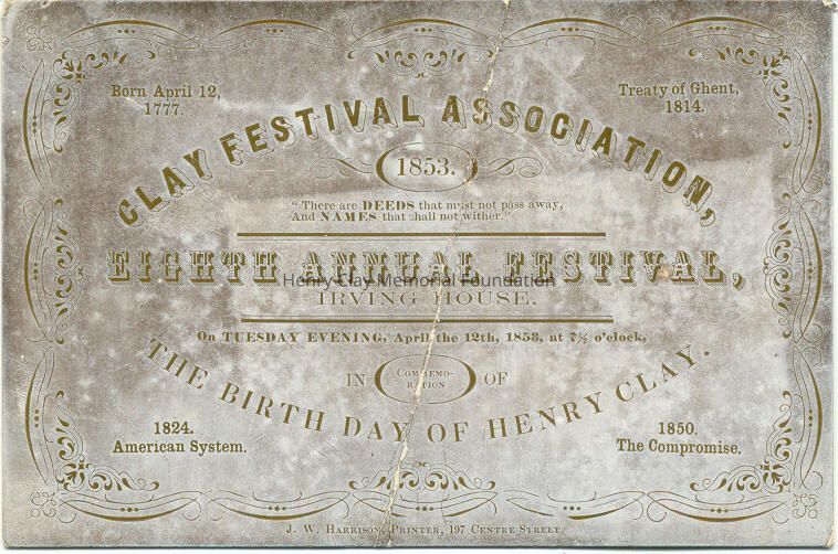 cardstock invitation to the eighth annual Festival in celebration of the birth of Henry Clay held by the Clay Festival Association. White card with gold metallic printing.