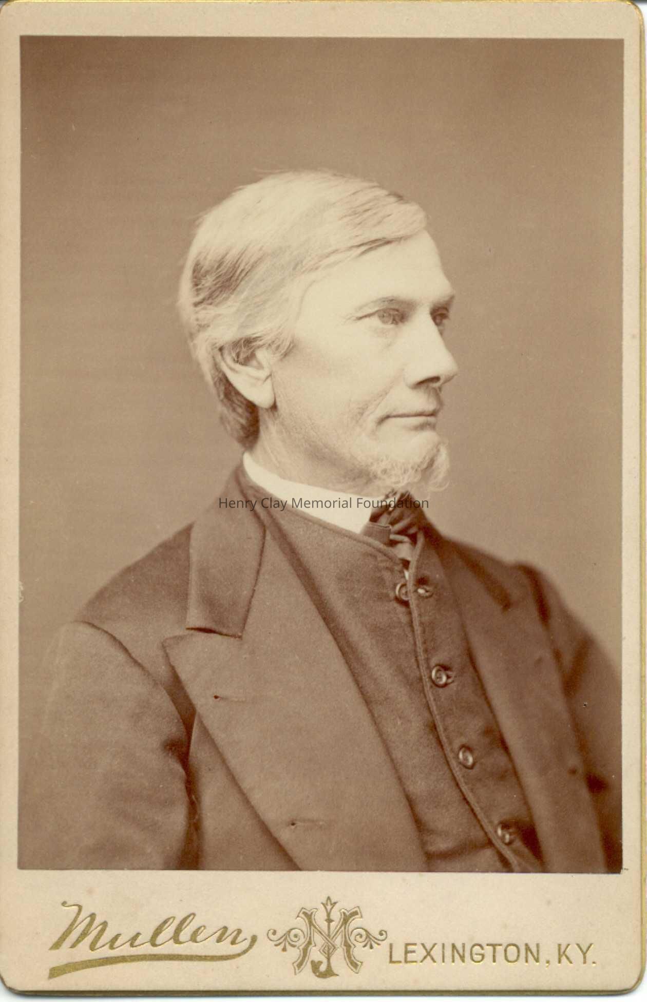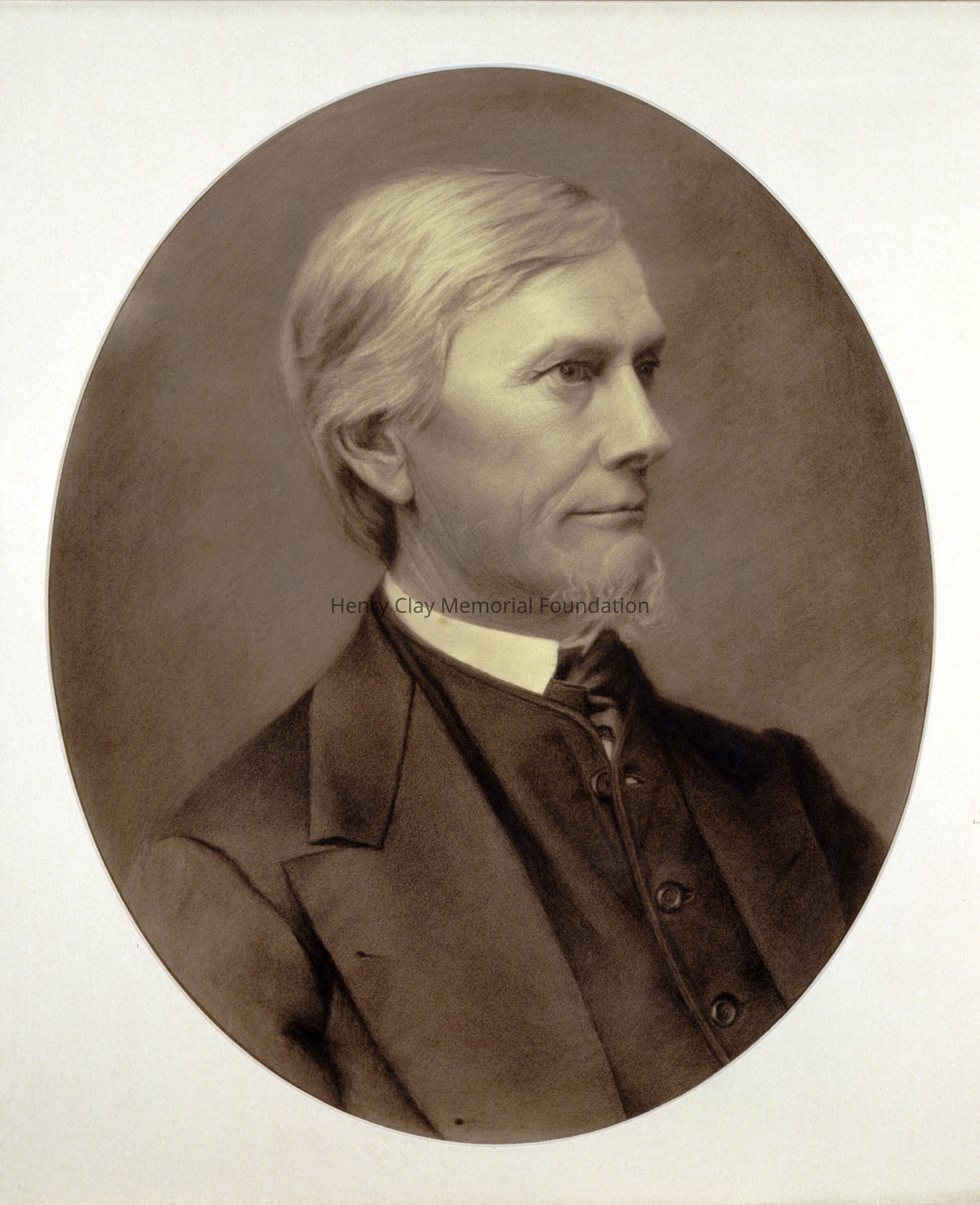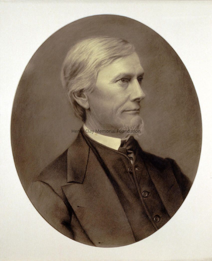 A portrait in charcoal on paper of John M. Clay. The prortrait shows John in middle age with a goatee and wearing a dark jacket and vest, a white shirt, and dark tie. John is in profile facing right. The portrait is framed in an ornate gessoed and gilt frame.Accessories