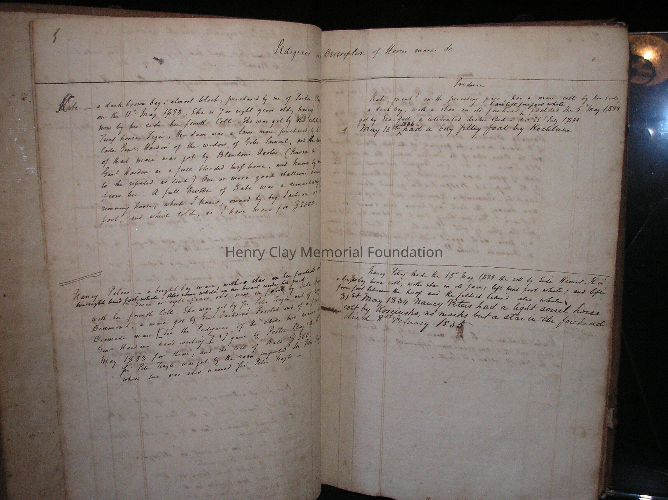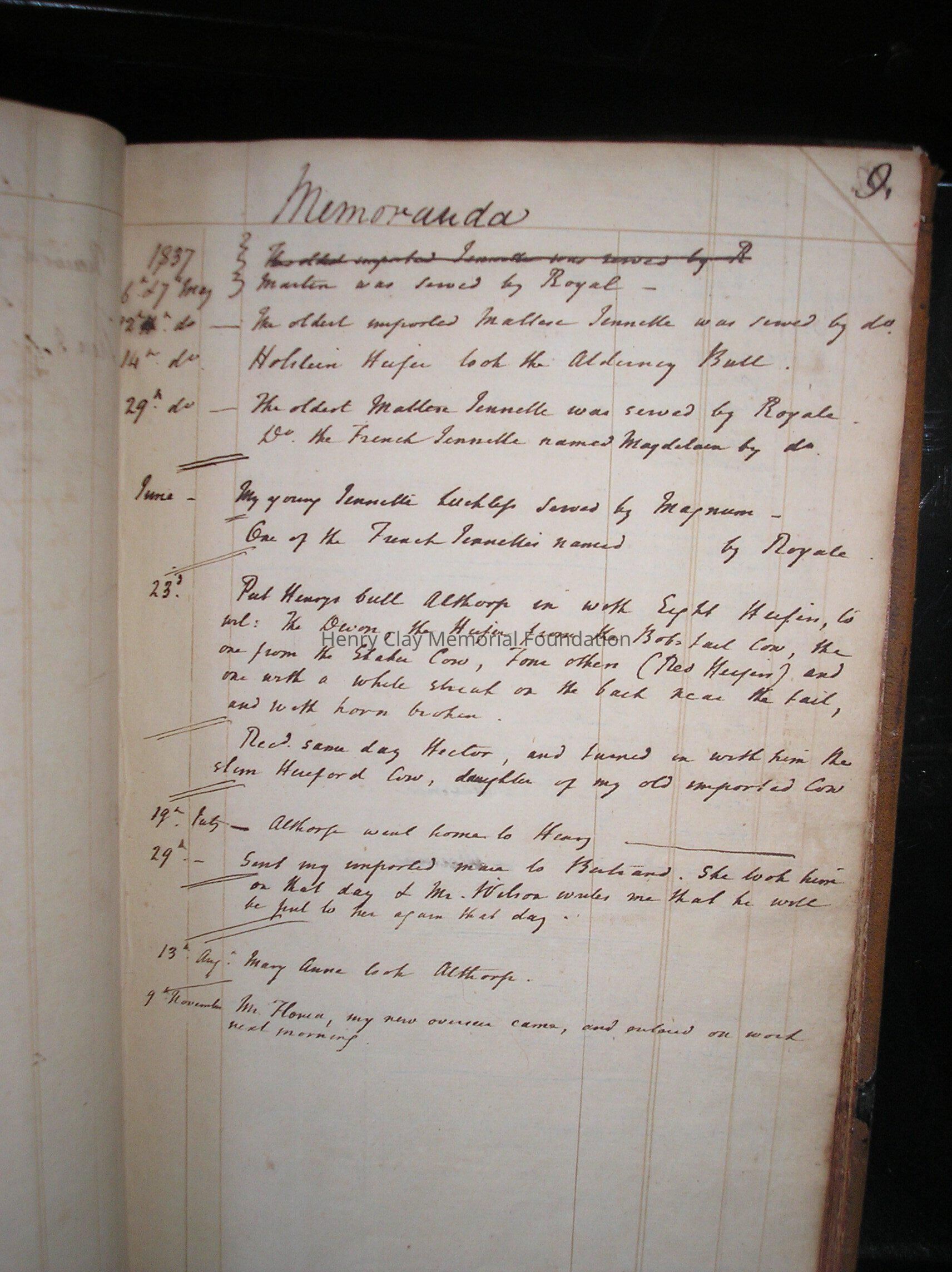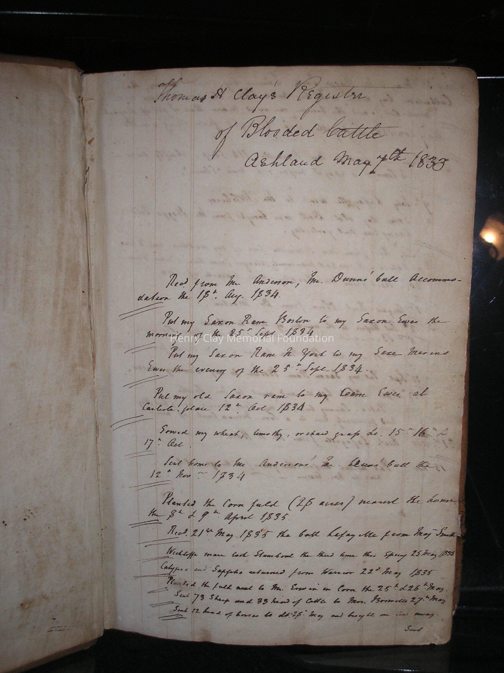 This journal contains records of livestock activities undertaken by Henry Clay and his descendants, including John and Josephine Clay, Thomas Hart Clay, and others.