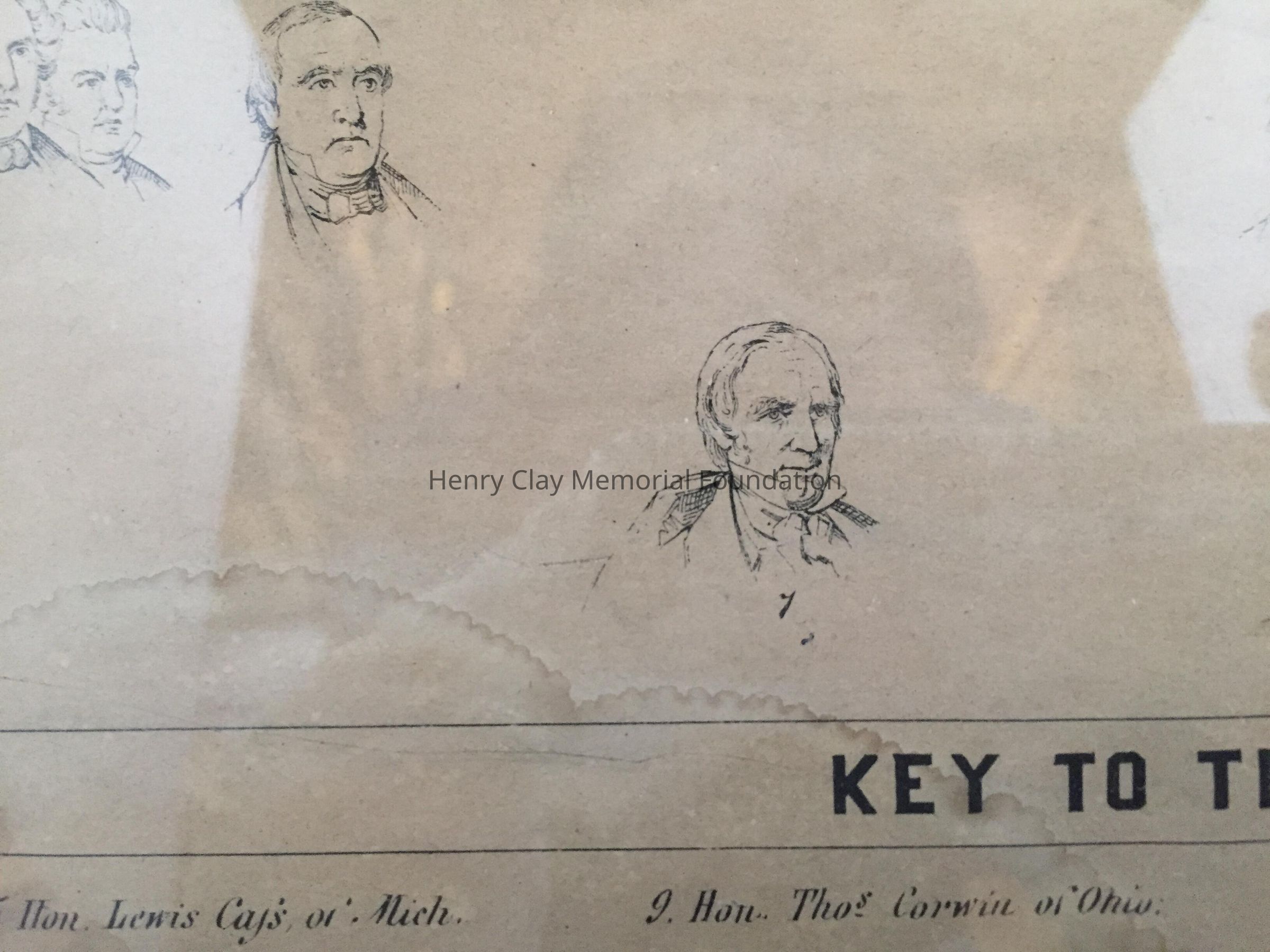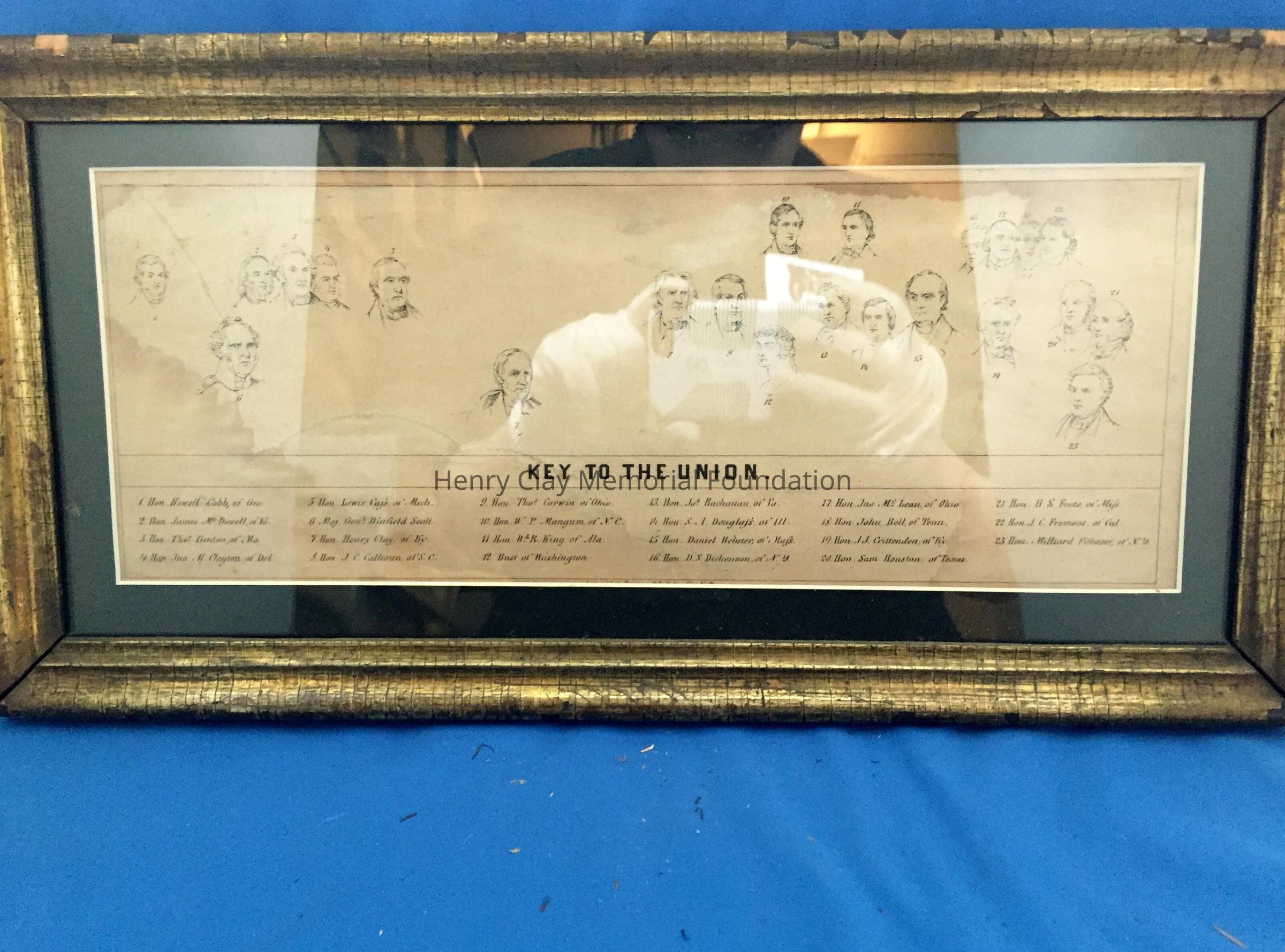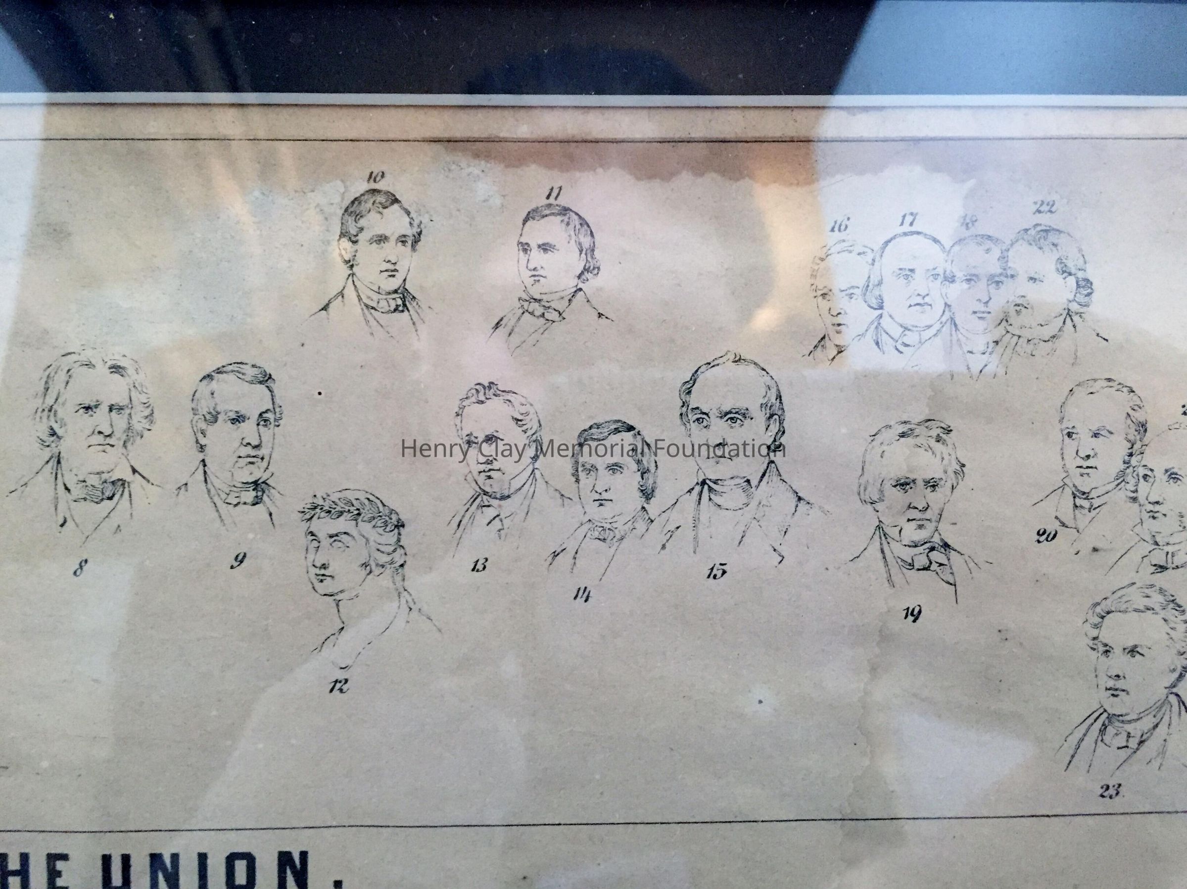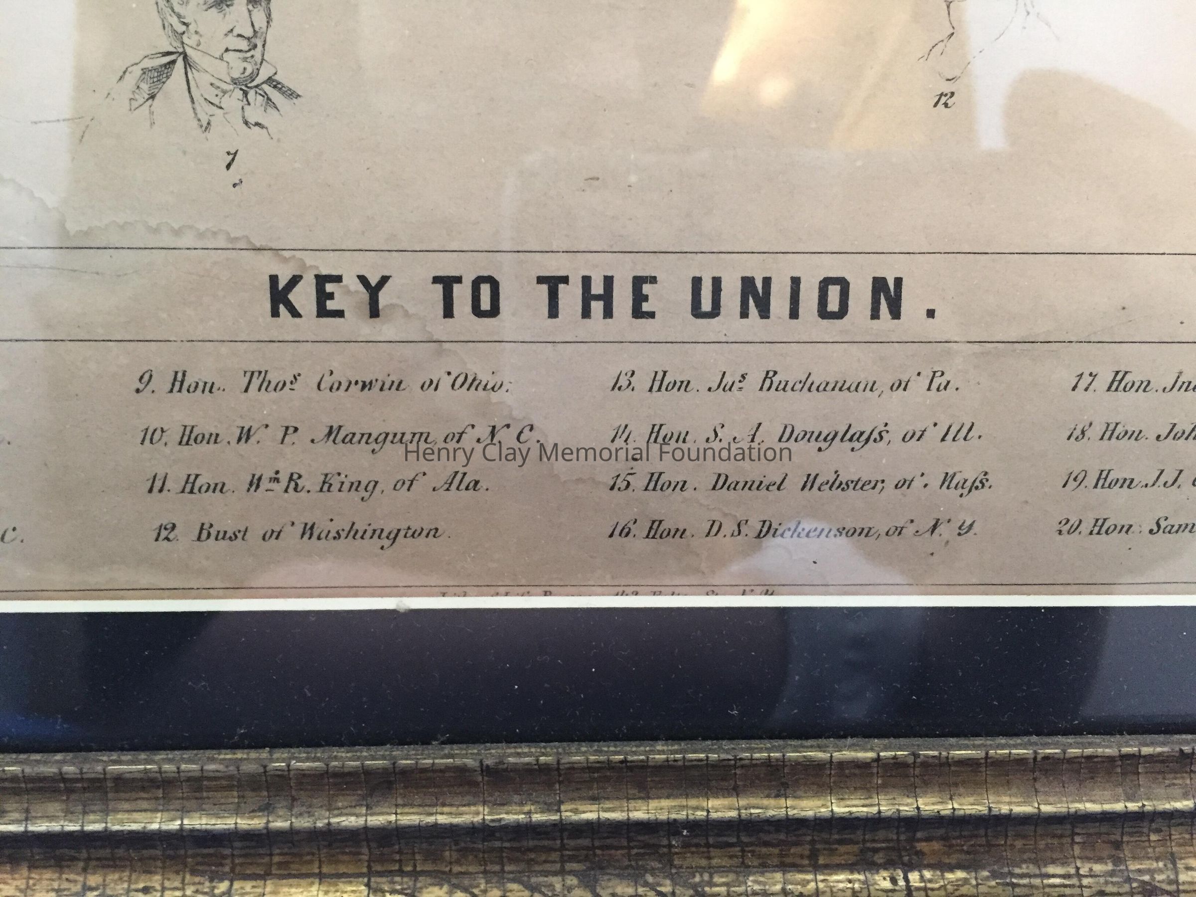 Lithograph depicting 23 numbered bust sketches, identifying each from the larger Union engraving. framed in simple gilded frame with black mat. The caption reads "The Key to the Union"