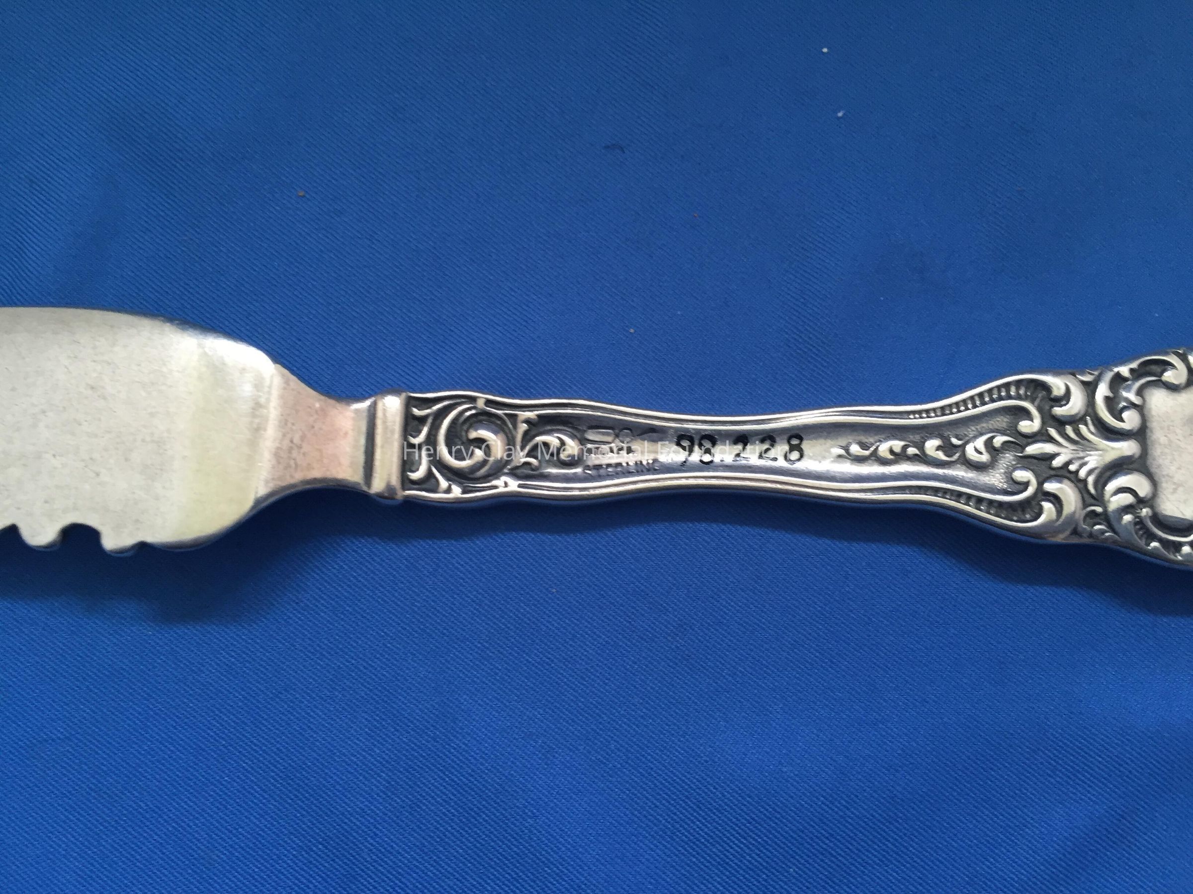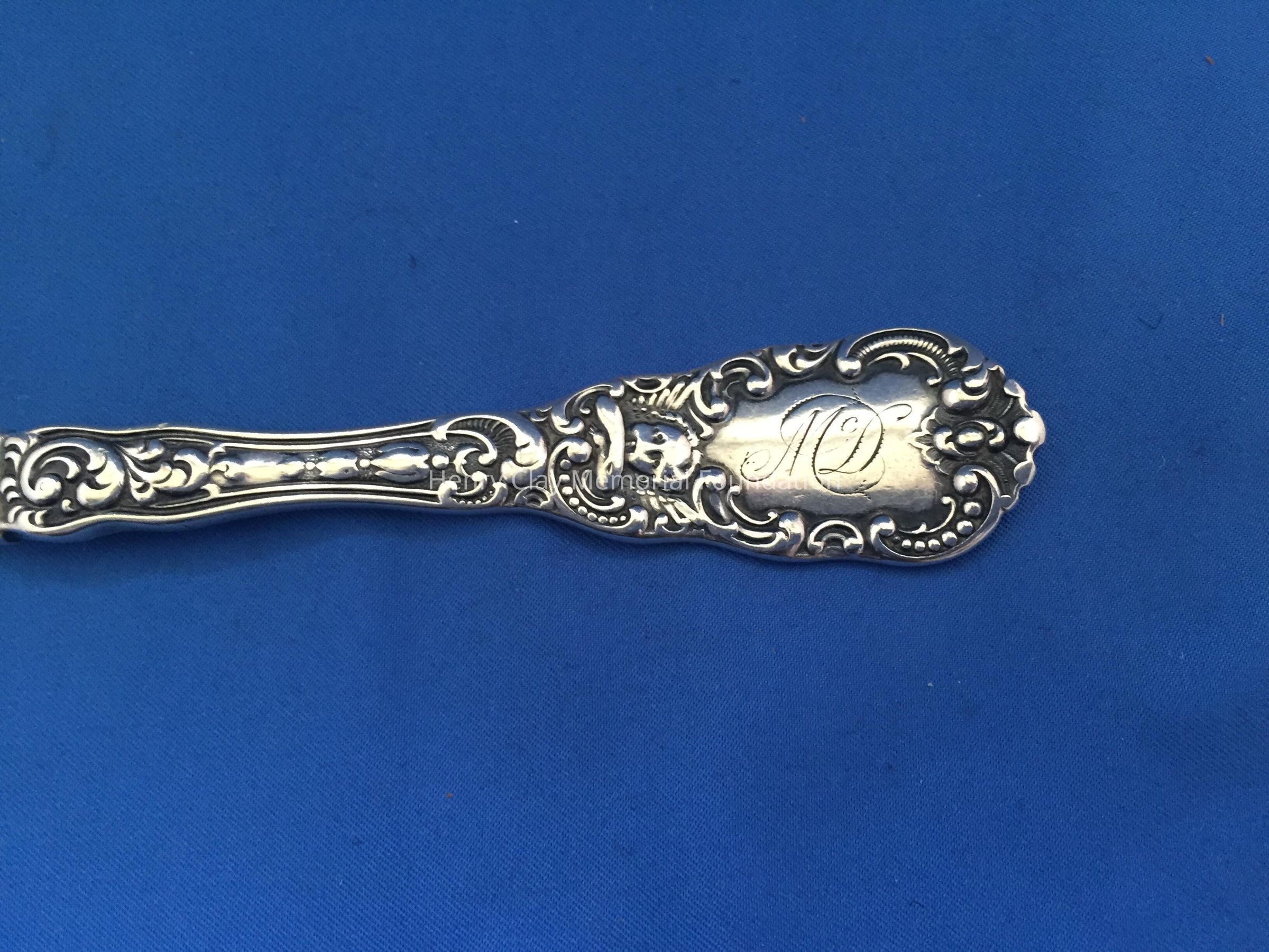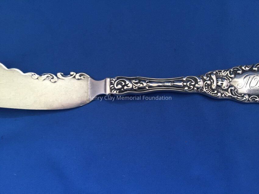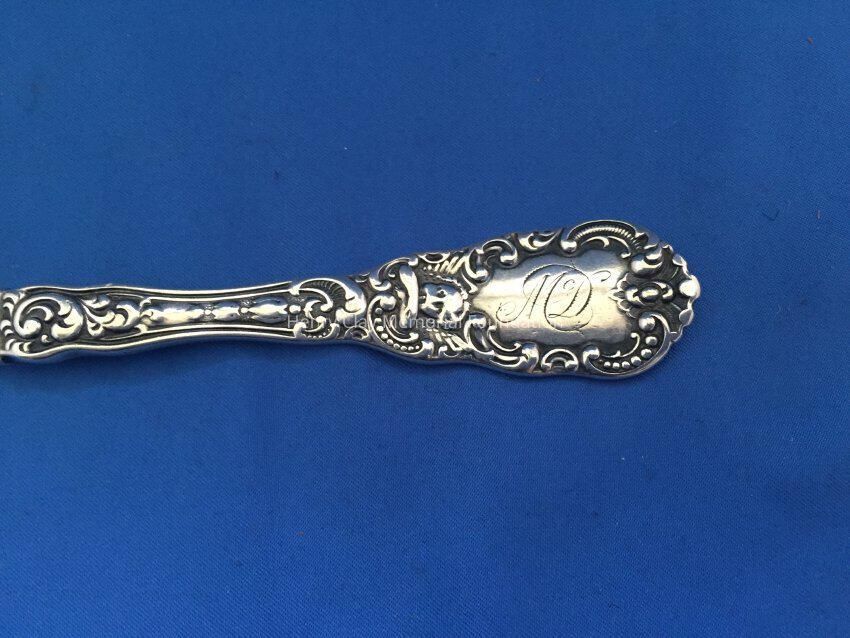 Heavy sterling, slightly raised at handle. Flat curved blade. Decorative handle with face on the middle. Engraved "McD" on top front of handle. There is a Hallmark of Dominick & Haff.