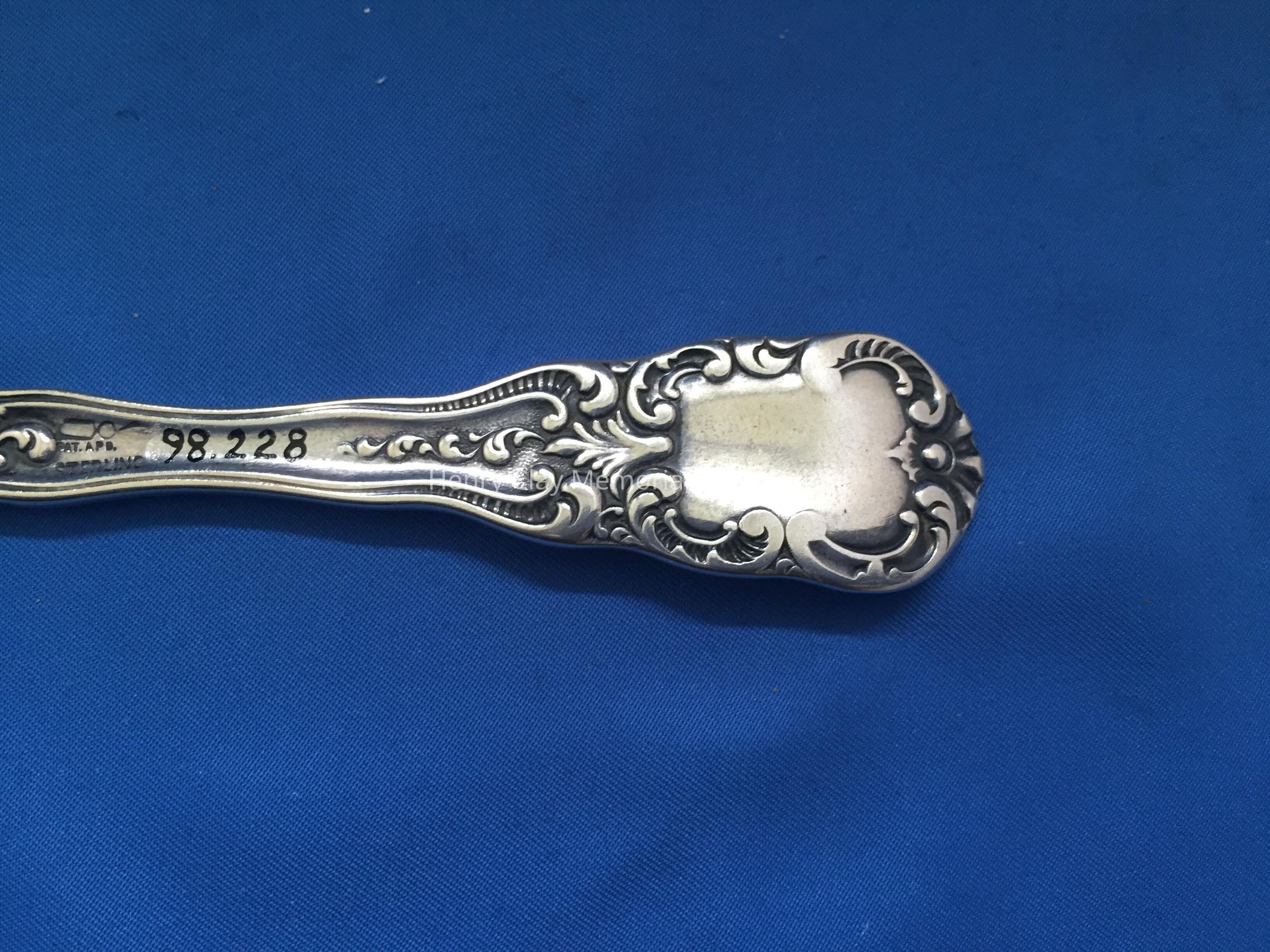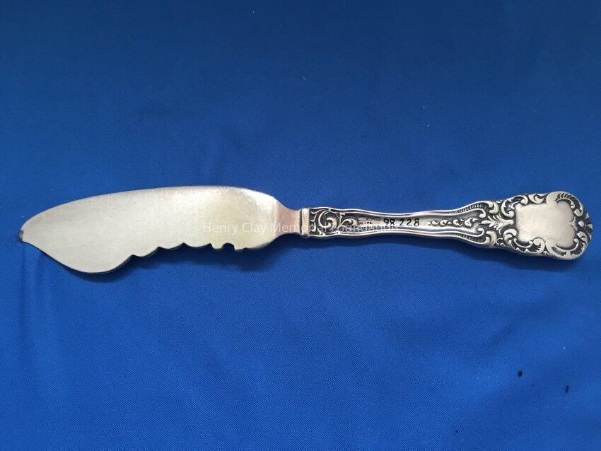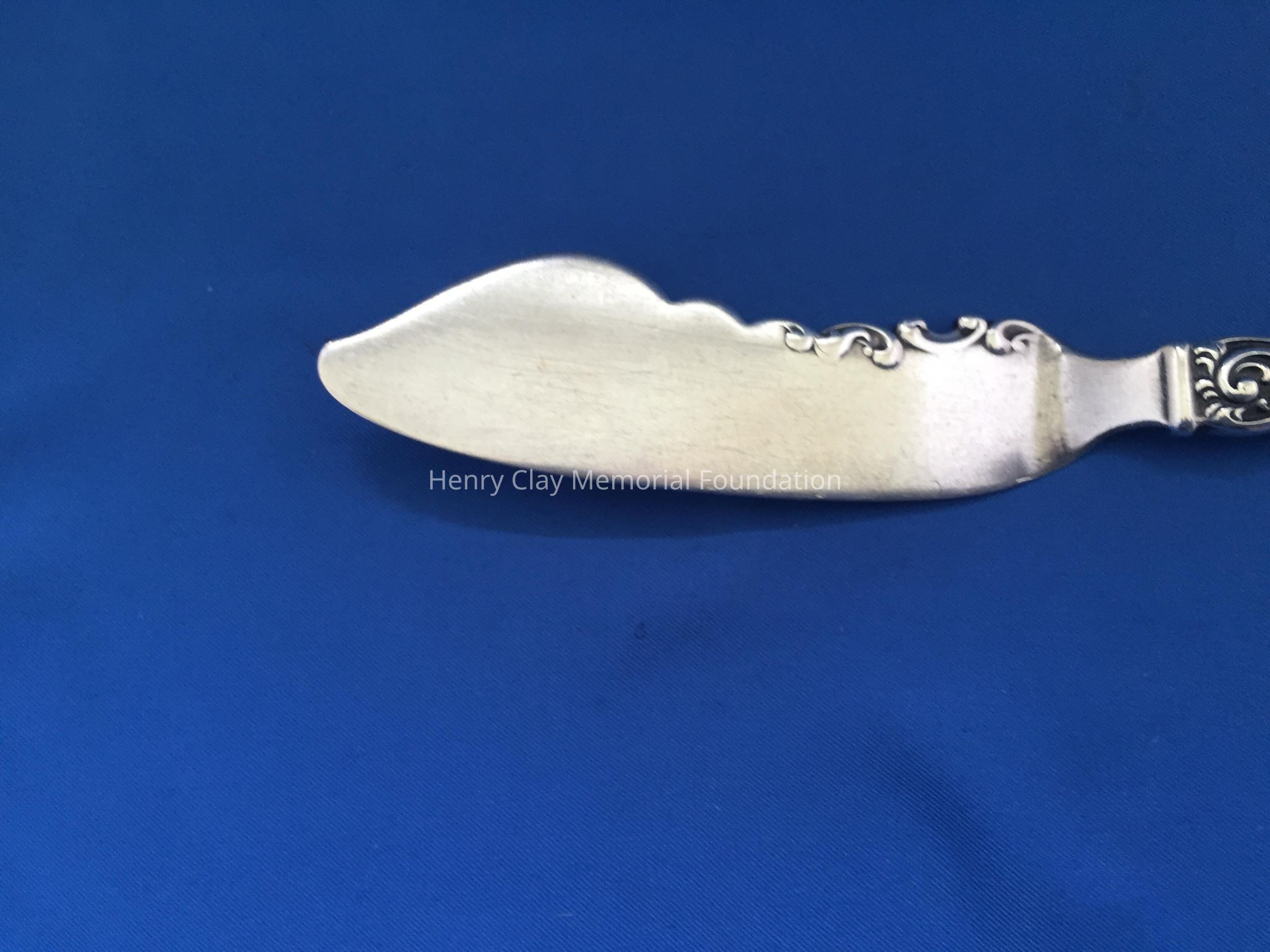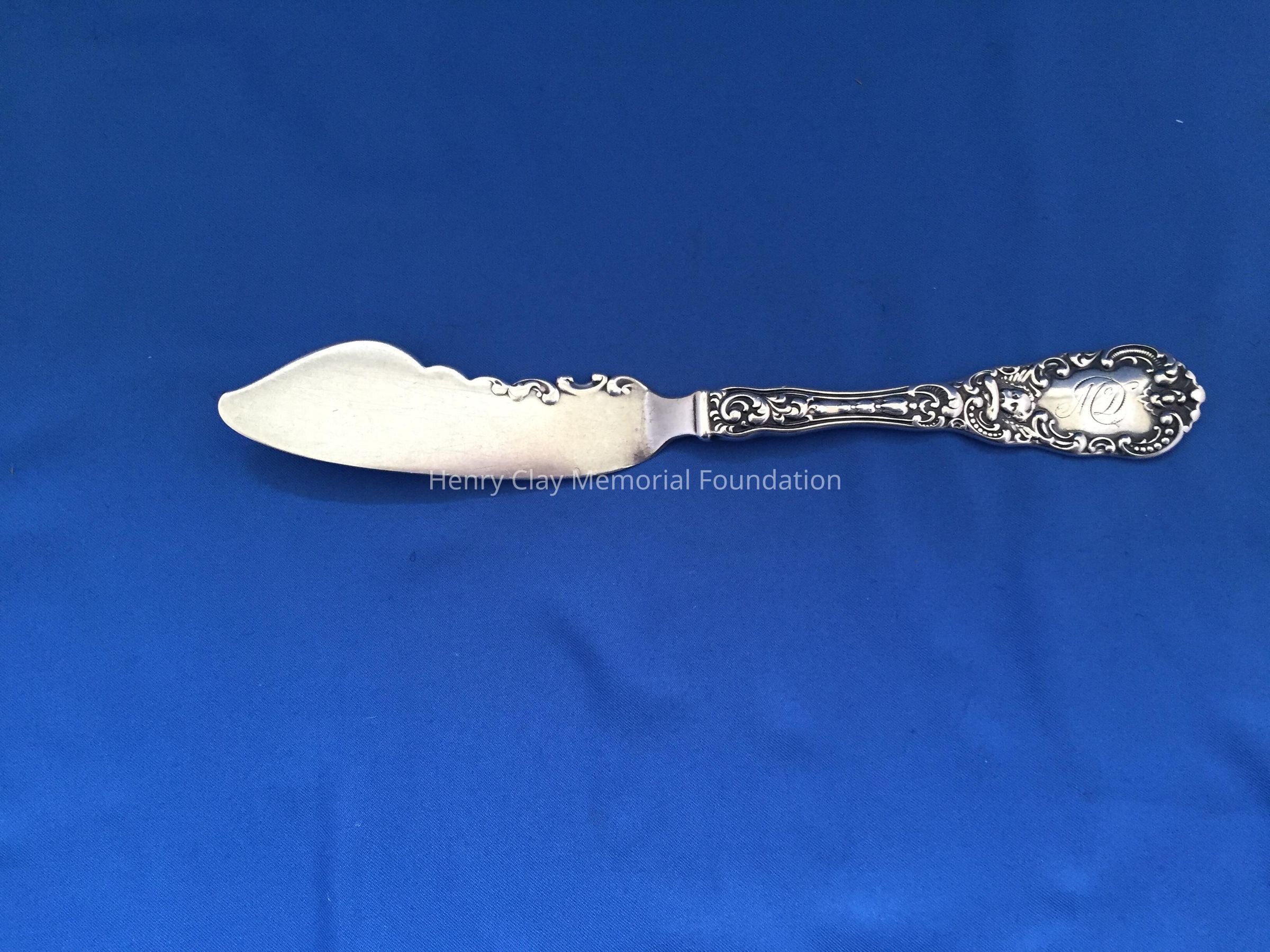 Heavy sterling, slightly raised at handle. Flat curved blade. Decorative handle with face on the middle. Engraved "McD" on top front of handle. There is a Hallmark of Dominick & Haff.