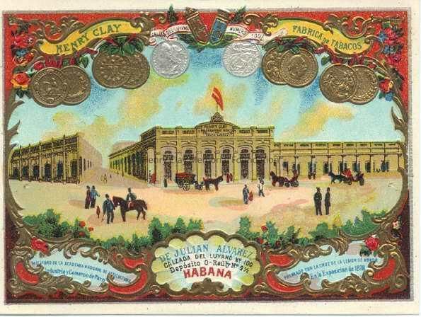 Colorful, rectangular cigar label made of pressed paper. Label shows a window scene with a building with a red flag on top and horses and people out front. Above window scene are colorful medals and other decorations and a yellow banner with "Henry Clay -- Fabrica de Tabacos." Below the window scene is other text, the center portion reading: "De Julian Alvarez / Calzada del Luyano No. 100 / Deposito O-Reilly No. 9 1/2 / Habana."