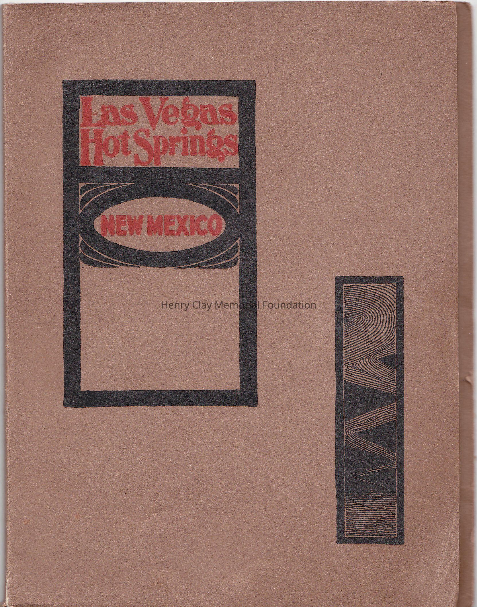 A guidebook for Las vegas Hot Springs New Mexico. Inside pages filled with information about New Mexico, black and white photograph showing the place, and the Hot Spring. Also distance between places, explanation of the mineral waters. The cover is paper with a minimalistic design in black and red.