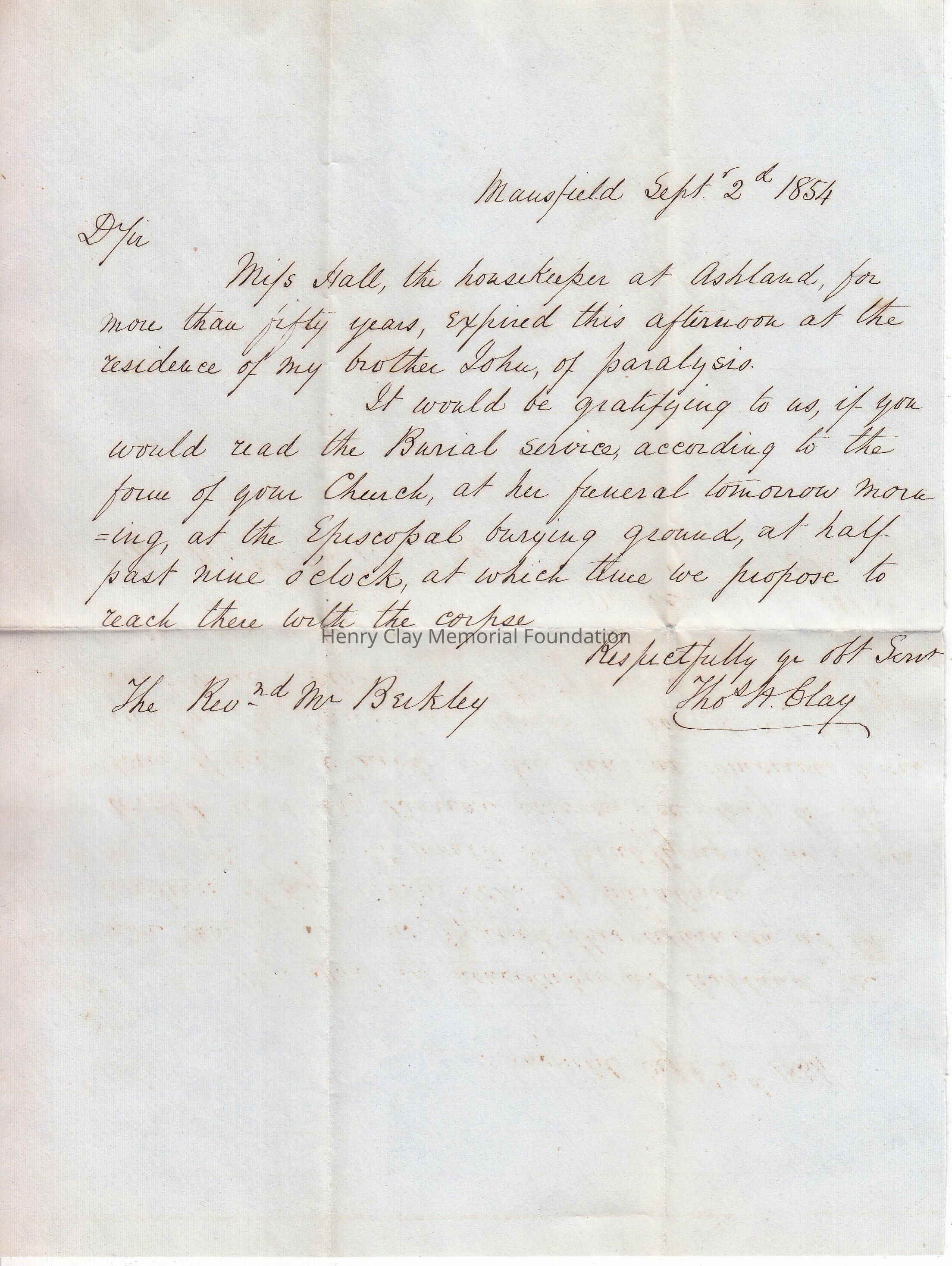 A letter from Thomas Hart Clay to Rev. Edward Fairfax Berkley asking him to perform the funeral of Sarah Hall.